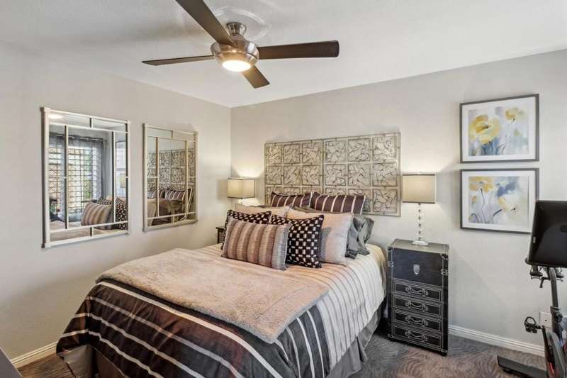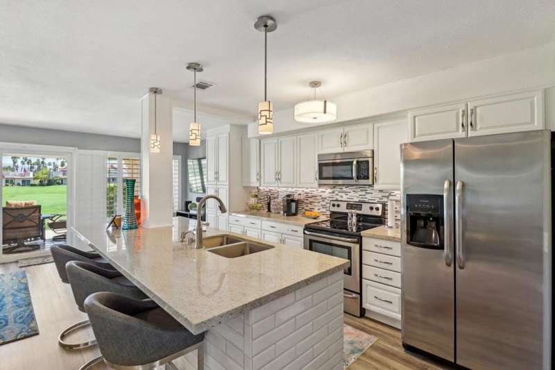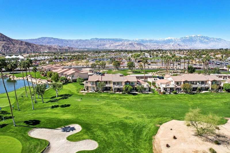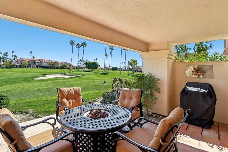 Nestled in the heart of Palm Royale, this exquisitely upgraded lower-level TURNKEY furnished condo is a true desert gem, offering breathtaking south/east-facing views of the majestic mountains and pristine golf course. Boasting 763 sq. ft. of refined living space, this 1-bedroom, 1-bath retreat is perfectly positioned across from the world-famous Indian Wells Tennis Garden--home to the prestigious BNP Paribas Open. Designed for both full-time living and luxurious seasonal escapes, this residence dazzles with a Chef's kitchen featuring stainless steel appliances, slab granite countertops, a stylish subway tile prep island, and chic pendant lighting. The open concept living and dining areas are enhanced by luxury vinyl plank flooring, plantation shutters, and a TV/media niche. A tranquil primary retreat leads to a spa-inspired bath with a vessel sink, granite counters, and a beautifully tiled shower. Beyond the interiors, enjoy resort-style amenities, including unlimited golf on the Ted Robinson-designed par-3 course, tennis and pickleball courts, and six sparkling pools. Step onto the inviting rear covered patio, where charming Saltillo tile sets the stage for a serene desert retreat. Take in the breathtaking, tranquil views that create the perfect backdrop for morning coffee, sunset cocktails, or simply unwinding in your own private oasis. Truly a great investment opportunity, particularly seasonally. HOA dues cover essential utilities, including cable and internet, making this the ultimate worry-free desert getaway!
