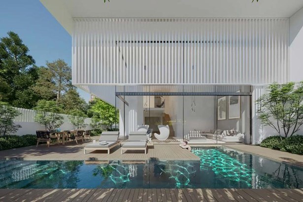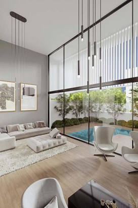 A modern ground floor maisonette of 285m2 total area welcomes you through a double-height ceiling at the en-trance and living room, introducing a vast interior space in continuous connection with the outdoor through large glazing windows. It consists of the basement, the ground floor and the mezzanine floor, and is granted a 413m2 private garden with a 9m x 5m swimming pool, together with outdoor lounge areas that are surrounded by green walls, giving the idea of an urban garden.