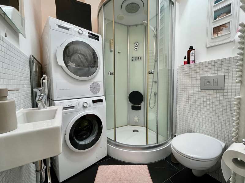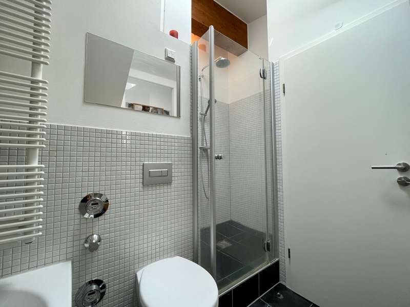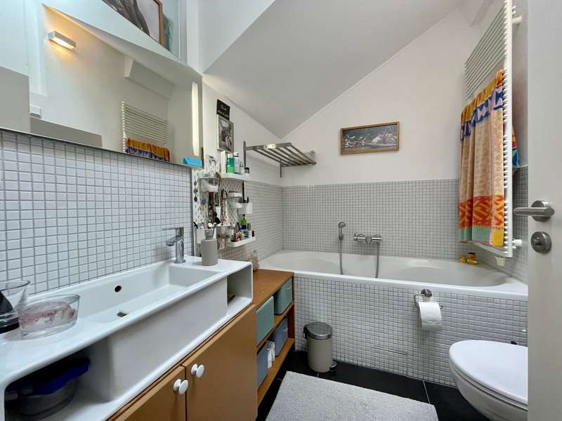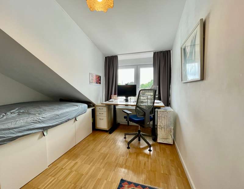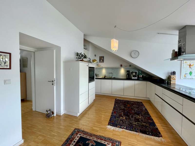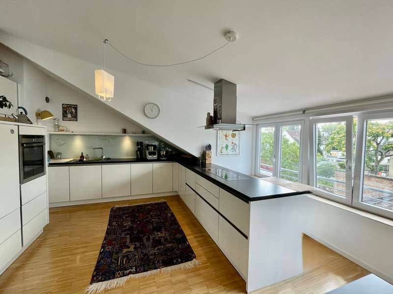 The house was built around 1960 and the attic was renovated, extended and expanded with a large dormer across the entire width of the house in around 2008. The roof truss was completely renewed, re-roofed and brought up to the state of the art. This rented, modern top floor apartment in a well-kept 5-party house offers approx. 95 m2 of space for a variety of living requirements. The generously proportioned living/dining/cooking area creates an inviting living atmosphere thanks to its brightness and coziness. The modern fitted kitchen integrated into this area (included in the purchase price) enables an optimal combination of cooking, eating and living, making it a meeting place for family and friends. There is also a large bedroom with adjoining dressing area and a further room for individual use. The two bathrooms are each fitted with a skylight, ensuring not only optimal lighting conditions but also natural ventilation. In addition to a bathtub, the main bathroom also has a separate shower, while the second bathroom can be used as a shower with aromatic steam. The solar system for heating the hot water and the full thermal insulation of the façade help to minimize heating costs. Two separate rooms in the basement serve as useful storage space and round off this interesting offer.