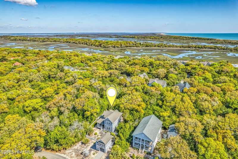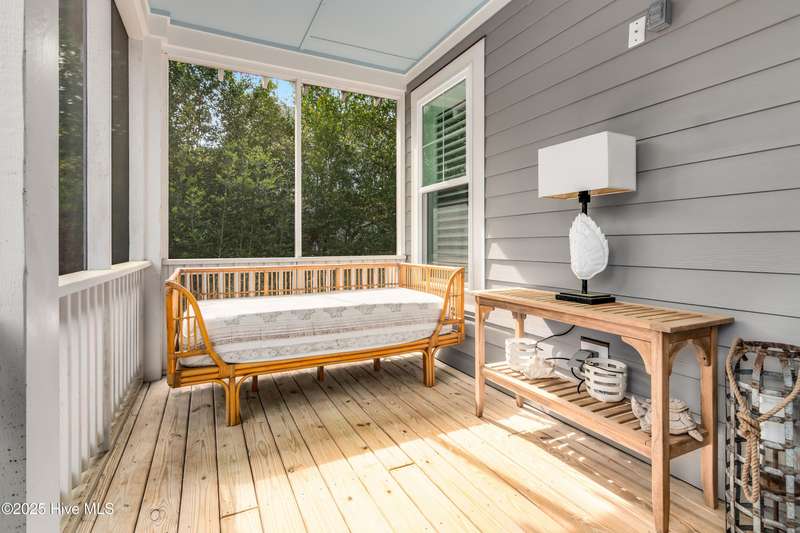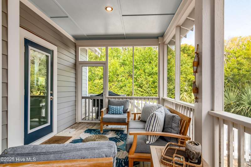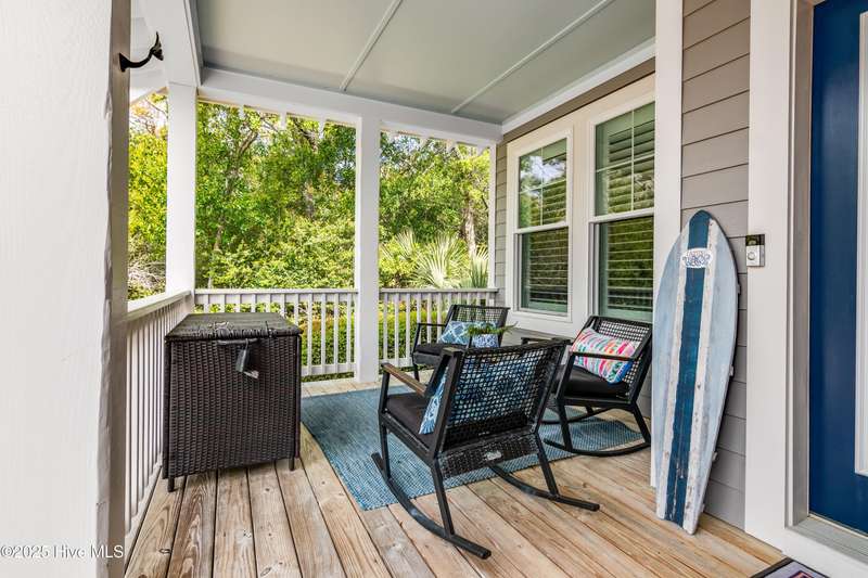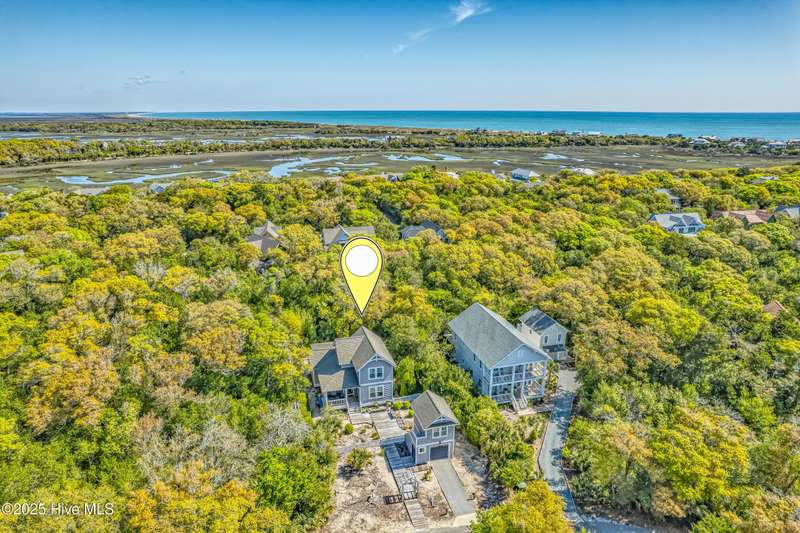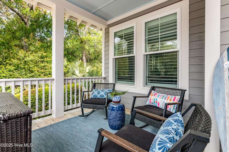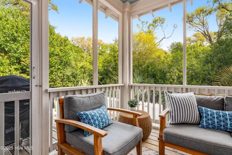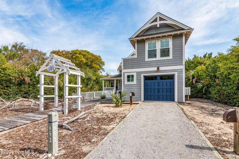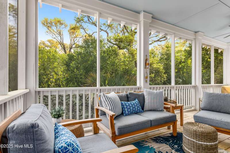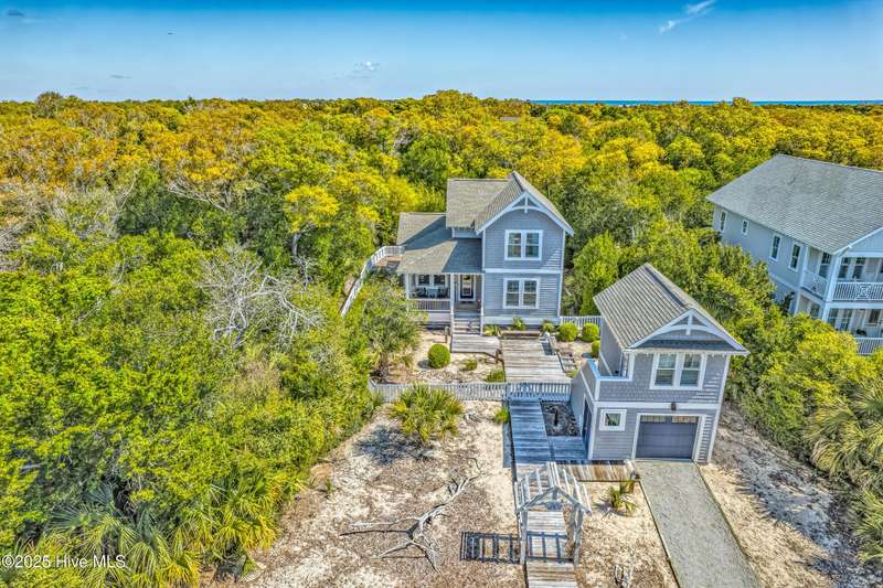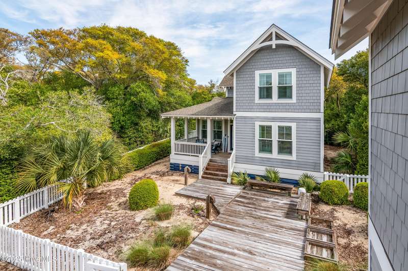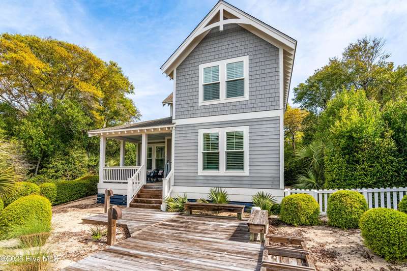 Exuding curb appeal, this four-bedroom, 3.5-bath 2017-built home has been so well maintained, it presents as new. Located in sought-after Cape Fear Station, its charming white picket fence embraces a generous gated front yard with a boardwalk leading to the house's covered front porch. Here's the perfect spot for lingering while listening to bird or surf song. Inside, the warm LVP flooring of this open floor plan's foyer leads to a very comfortable living area that is cornered by natural light-sharing windows and accented by a handsome shiplap wall. Across, the dining space is banked by more sunlit windows and easily accommodates seven. Nosh here or at the adjacent breakfast bar. The spacious, multi-chef kitchen boasts yards of granite counter space, stainless appliances, proximity to the powder room, and offers egress to the house-length back screened porch. This is where to savor alfresco bites or a quiet read while nature-watching in Bald Head's Maritime Forest. The bright Primary King suite also accesses the screened porch as well as tenders two closets and its own ensuite with a shower and his/her vanity. Upstairs are two more sunny corner bedrooms. The first is a serene Queen who shares the convenient large hall full bath (with tub) with the nearby Twin bedroom. For those craving more privacy, another suite is located in the crofter, just above the garage. Its tree-top site reveals great views as well as an elegant daybed and its own full bath. Close to popular East Beach, the Shoals Club, and the Conservancy, this property conveys with both a six- and a four-passenger golf cart. There is a transferable BHI Lifestyle Club membership Minimal exclusions.
