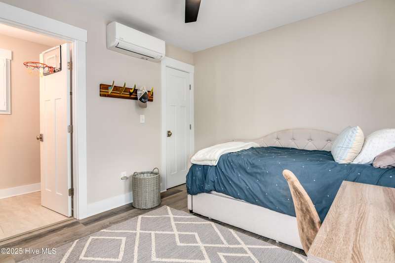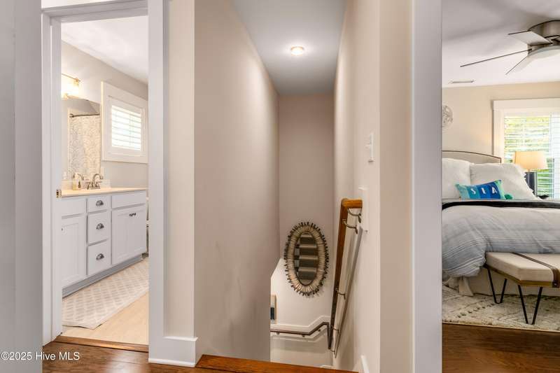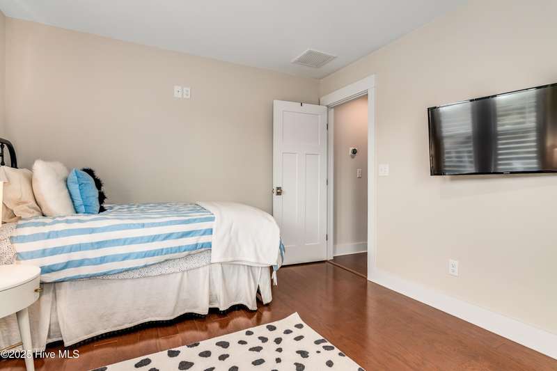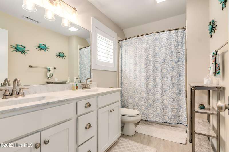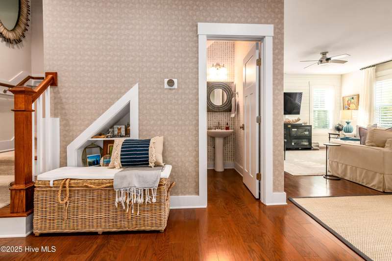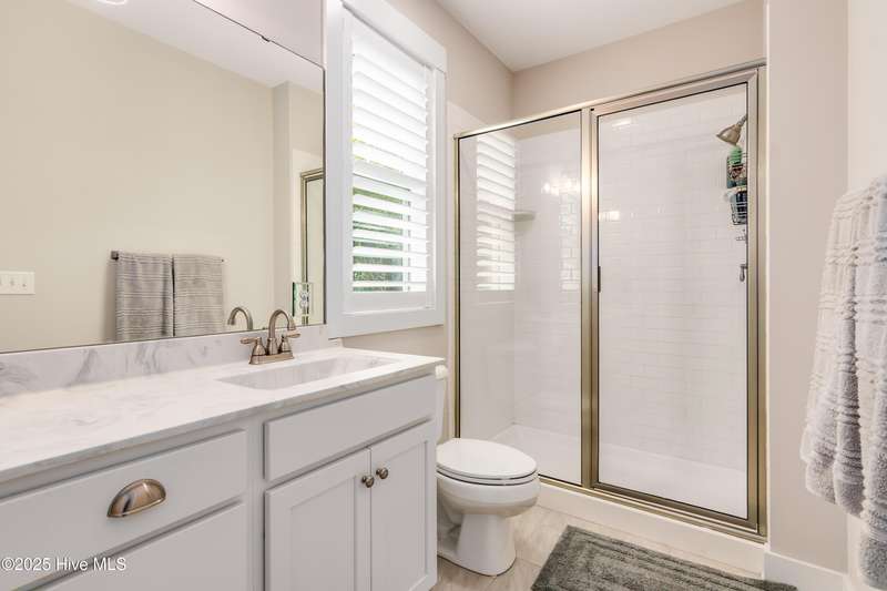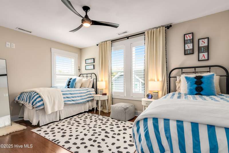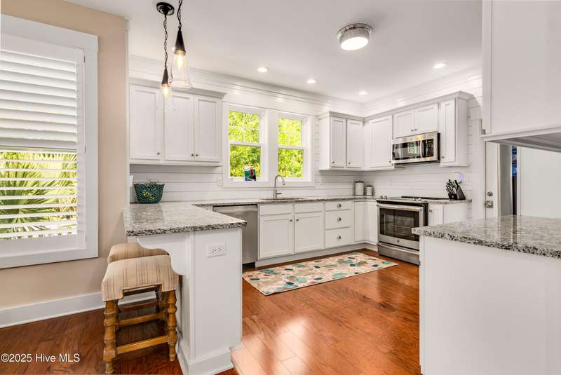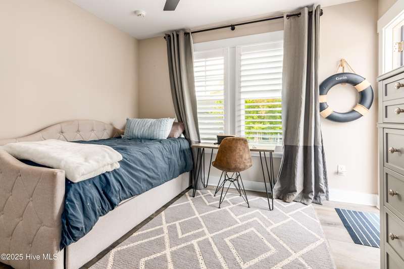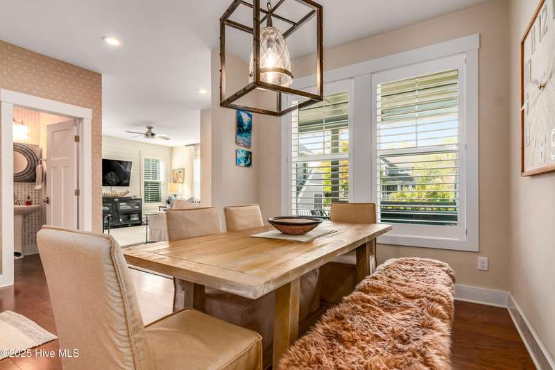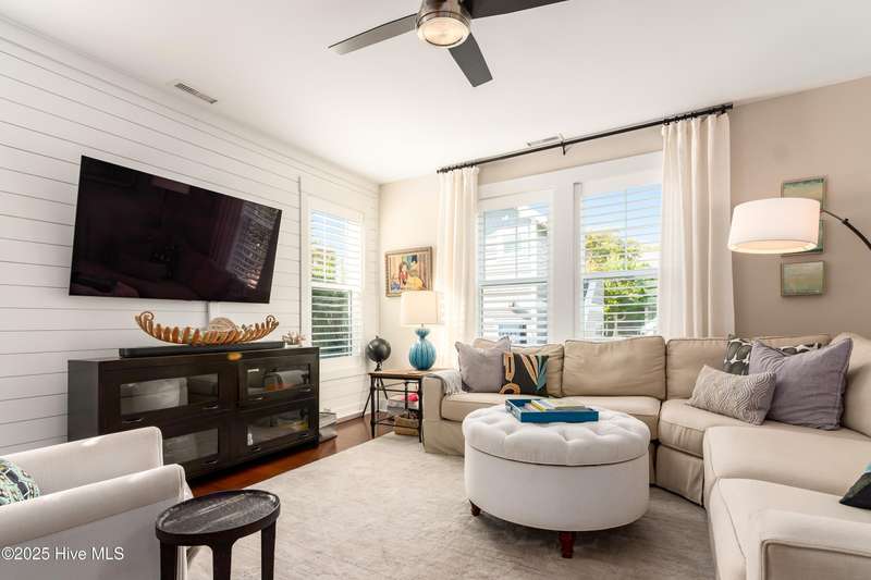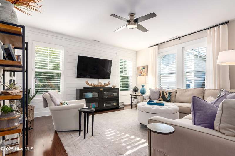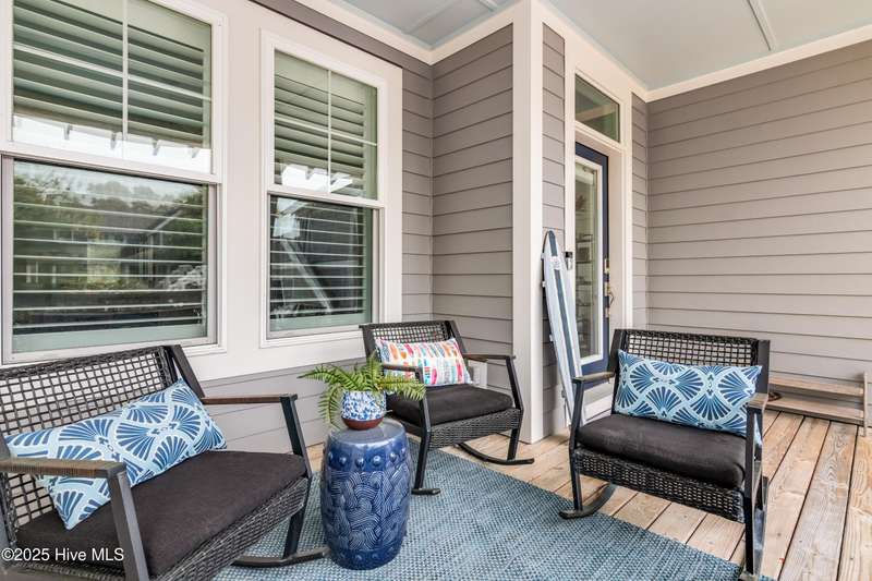 Exuding curb appeal, this four-bedroom, 3.5-bath 2017-built home has been so well maintained, it presents as new. Located in sought-after Cape Fear Station, its charming white picket fence embraces a generous gated front yard with a boardwalk leading to the house's covered front porch. Here's the perfect spot for lingering while listening to bird or surf song. Inside, the warm LVP flooring of this open floor plan's foyer leads to a very comfortable living area that is cornered by natural light-sharing windows and accented by a handsome shiplap wall. Across, the dining space is banked by more sunlit windows and easily accommodates seven. Nosh here or at the adjacent breakfast bar. The spacious, multi-chef kitchen boasts yards of granite counter space, stainless appliances, proximity to the powder room, and offers egress to the house-length back screened porch. This is where to savor alfresco bites or a quiet read while nature-watching in Bald Head's Maritime Forest. The bright Primary King suite also accesses the screened porch as well as tenders two closets and its own ensuite with a shower and his/her vanity. Upstairs are two more sunny corner bedrooms. The first is a serene Queen who shares the convenient large hall full bath (with tub) with the nearby Twin bedroom. For those craving more privacy, another suite is located in the crofter, just above the garage. Its tree-top site reveals great views as well as an elegant daybed and its own full bath. Close to popular East Beach, the Shoals Club, and the Conservancy, this property conveys with both a six- and a four-passenger golf cart. There is a transferable BHI Lifestyle Club membership Minimal exclusions.