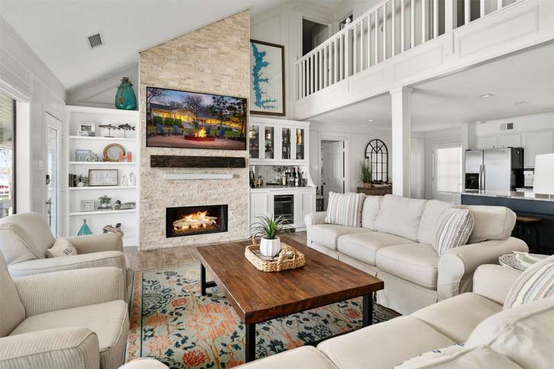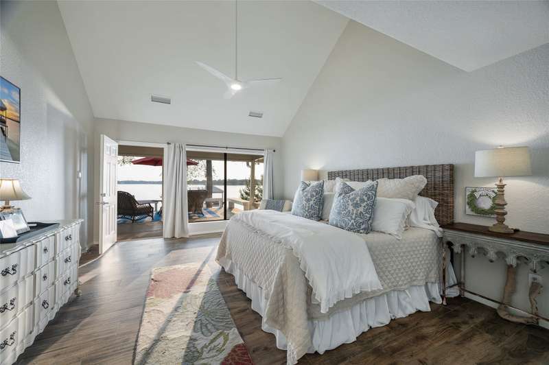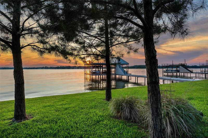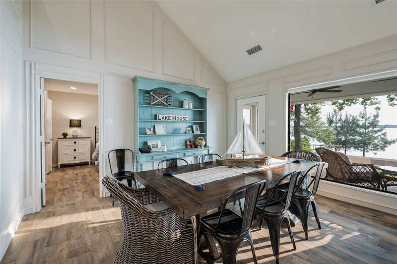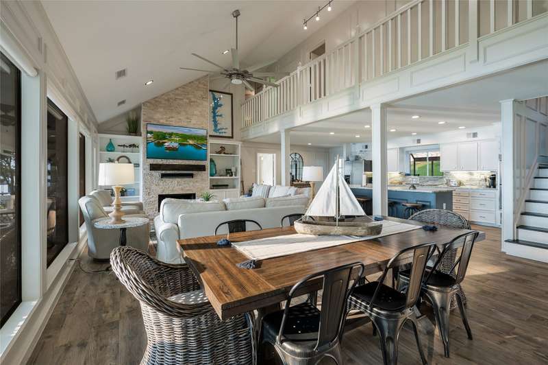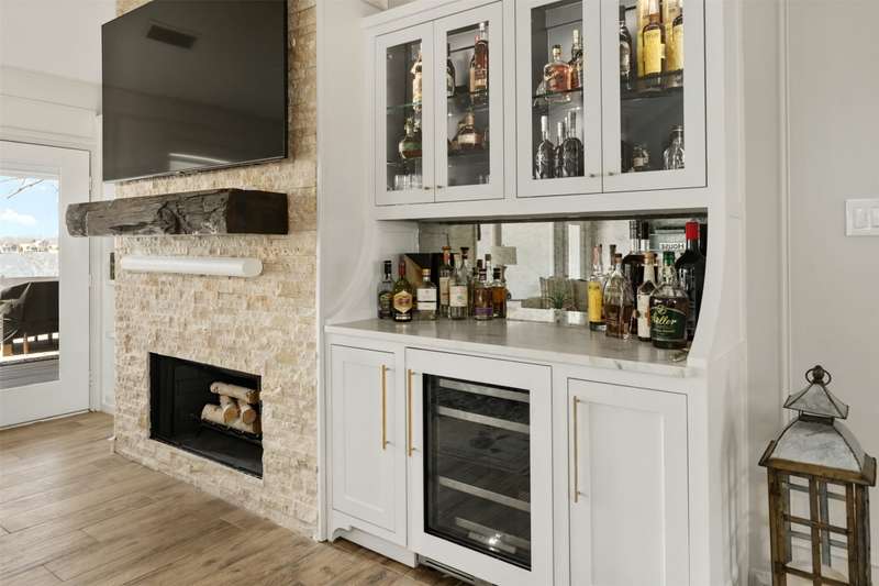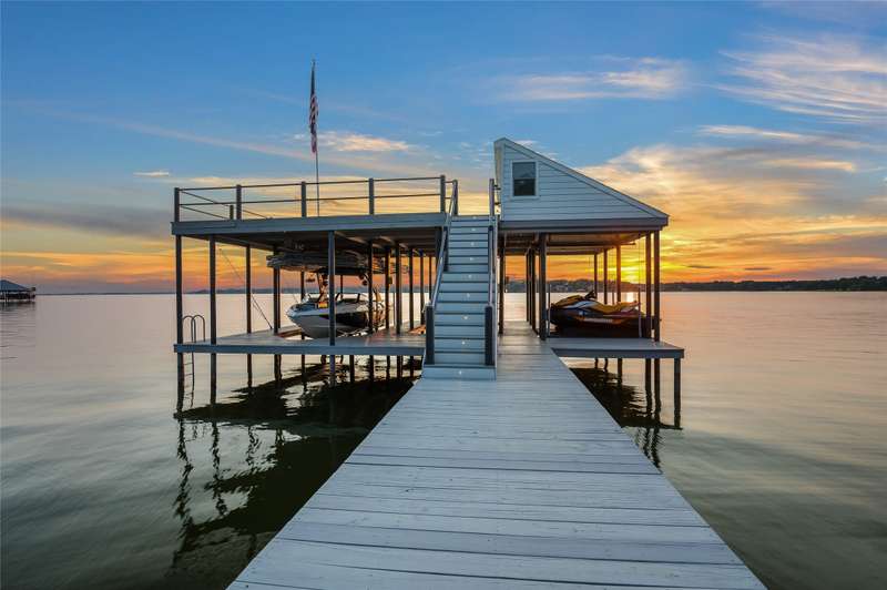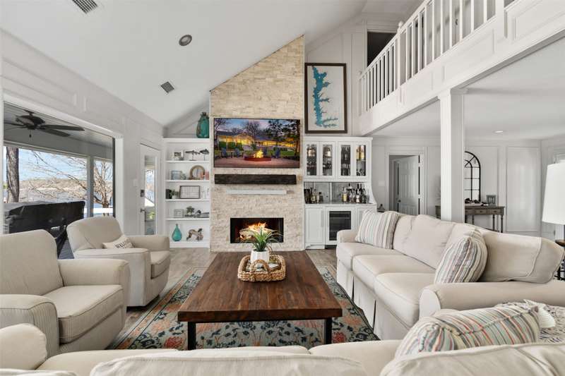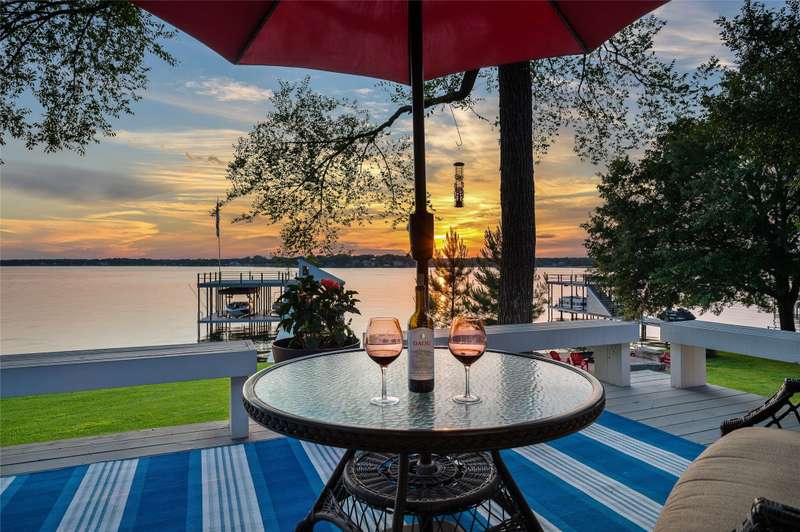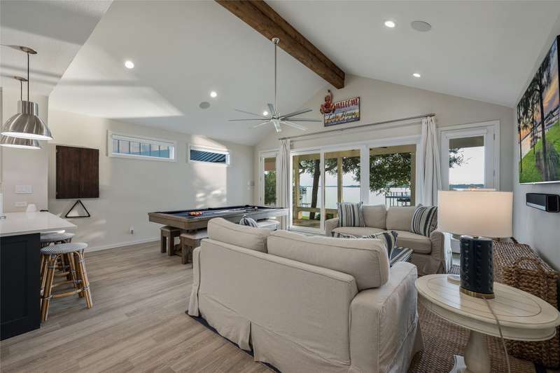 Stunning double lot estate with main home and guest house totaling 3,165 sf on one-half acre with wide open water views and some of the deepest water you'll find on Cedar Creek Lake. This tastefully updated home gives modern, coastal vibes and has room to sleep and entertain a crowd. The main home has 4 bedrooms, 3 and 1 half baths, soaring vaulted ceilings, wood-burning fireplace, built-in bar with wine cooler, a sunroom that can double as a guest bedroom, full utility room, and walls of glass to the lake. The guest house, built in 2019, shares a deck with outdoor kitchen and includes a bunkroom and full bathroom, kitchen, and laundry. The large, updated boathouse has two boat slips - one is equipped with heavy duty, double cable, double motor lift system for your wake boat - double Sea-Doo lift, and plenty of storage for all your water toys. Extras include a touchless boat cover, spider misting system, sprinkler system from lake pump, golf cart garage, under deck storage with work bench and professional landscaping with outdoor lighting, and a beautiful firepit area at the water's edge to enjoy amazing sunsets.
