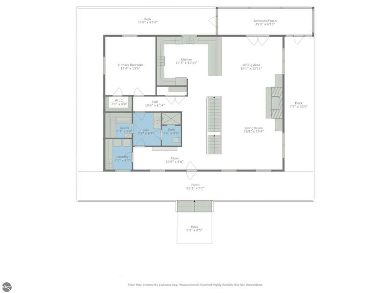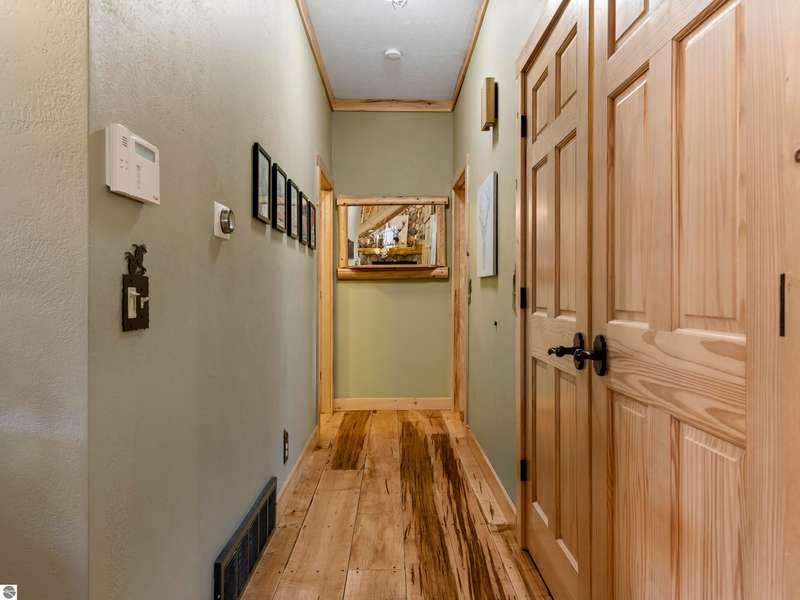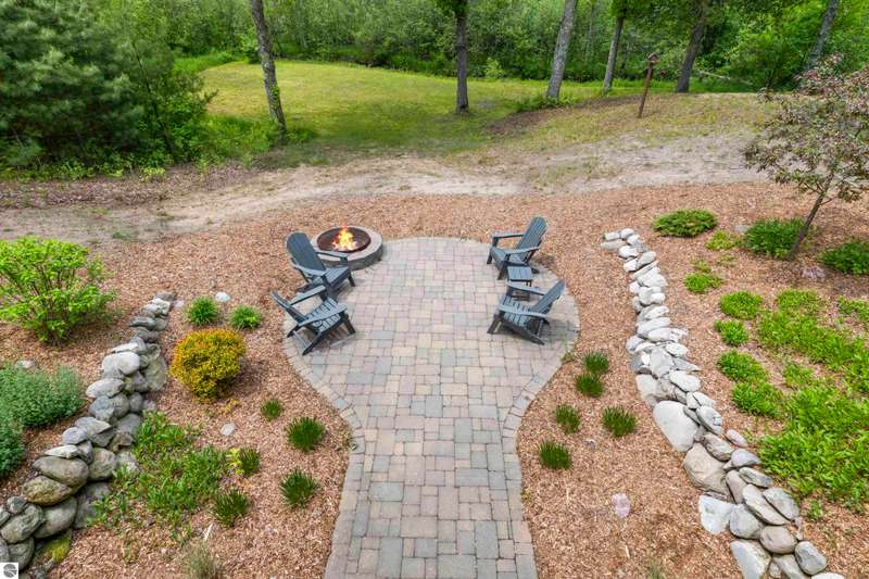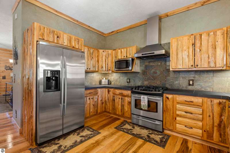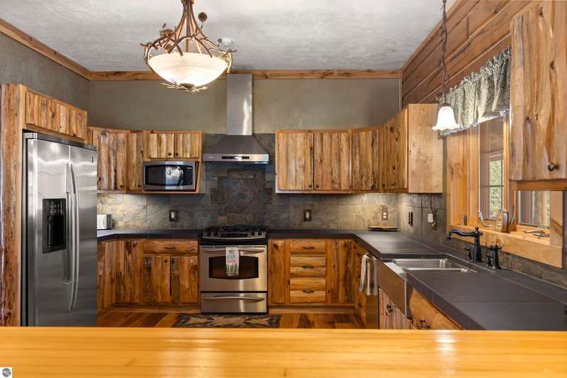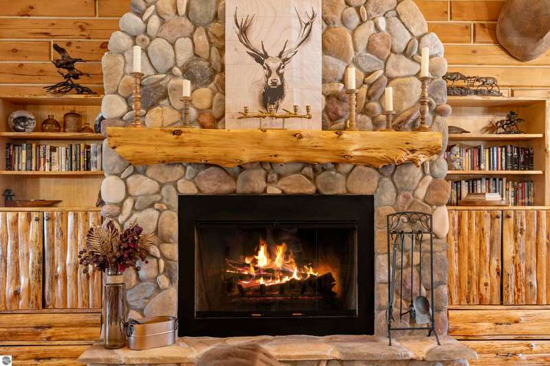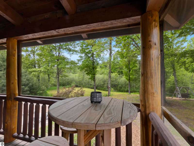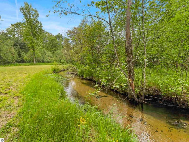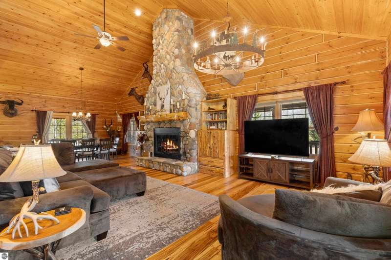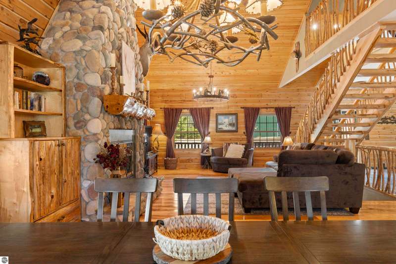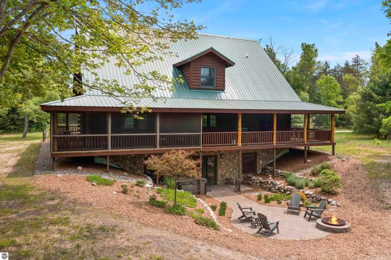 Tucked into 8+ wooded acres with nearly 1,000 feet of private First Creek frontage, this one-of-a-kind log home offers privacy, peace, and a front-row seat to nature's magic. Every corner of the property invites you to slow down - watch the salmon and steelhead run, wander the trails, or sit under the stars by the fire pit. Step inside and you're greeted by soaring ceilings, a grand fieldstone fireplace, and a floating log staircase that sets the tone for this custom-built retreat. The chef-ready kitchen blends rustic charm with modern function, while the wrap-around porch (with a cozy screened section) is made for morning coffee, evening drinks, and everything in between. Main-floor living includes a spacious primary suite with a bathroom, sauna, and tranquil views. Upstairs offers room to sleep, read, or simply spread out, complete with a thoughtfully designed split bathroom. Downstairs? That's your go-to hangout space--wet bar, game room, walkout access, plus a guest bedroom, office/flex space (non-conforming bedroom), and a full bath. The home also has a strong rental history with many five-star guest reviews, and most furnishings are negotiable--making it easy to step right into the Up North experience. A 32x48 pole barn with water and 200-amp service handles your storage needs--whether it's for tools, toys, or future projects. And if you're into adventure, you're in luck. State land is right across the road, with access to snowmobile, horseback, and ATV trails. Crystal Mountain is a quick 7-minute drive. Sleeping Bear Dunes, Frankfort, and Traverse City are all close enough for spontaneous day trips. It's more than a home--it's a sanctuary where you can reconnect, recharge, and write your next chapter. Strong rental history and potential.