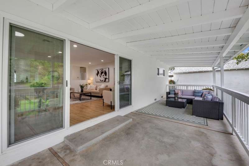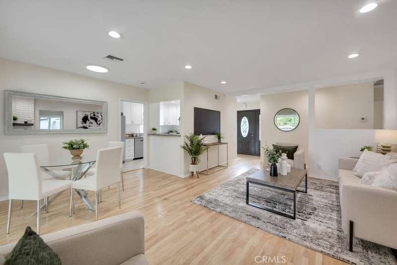 Located South of the Blvd on a tree-lined Woodland Hills street, this single-story 3 bed, 2 bath home offers 1,320 sq ft of bright, easy living on a 6,252 sq ft lot. An open living/dining area showcases hardwood floors, recessed lighting and a painted brick fireplace, with large sliders that extend the space to a covered back patio, ideal for outdoor dining and entertaining. The cheerful kitchen features white cabinetry, granite counters, a gas cooktop, double ovens, stainless refrigerator and a convenient pass-through to the dining area. The bedroom wing includes a serene primary plus two comfortable secondary bedrooms, served by two updated baths, one with a glass-enclosed shower and another with a dual-sink vanity and tub/shower combo. The backyard is lush and grassy with mature landscaping, offering plenty of room to play and relax. An attached two-car garage and wide driveway provide ample parking. Moments to Ventura Blvd restaurants, The Village and Westfield Topanga, with easy canyon/101 access.