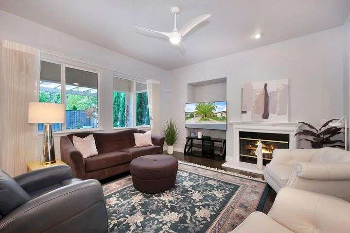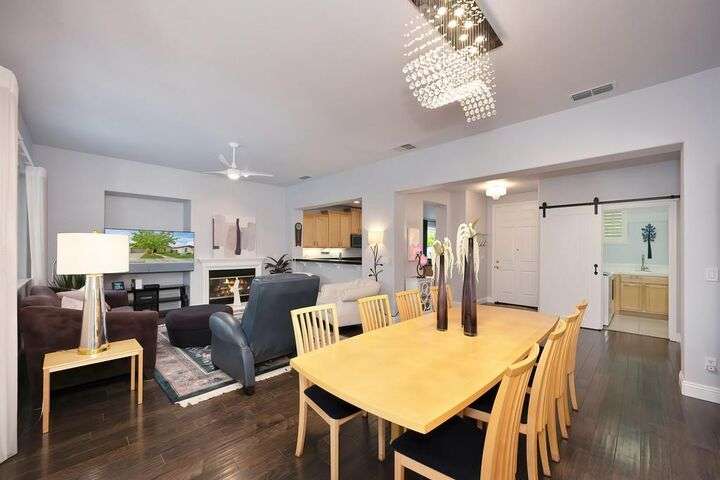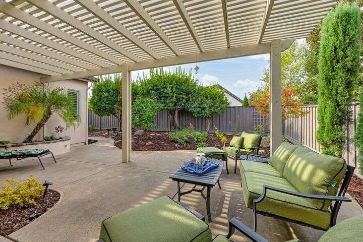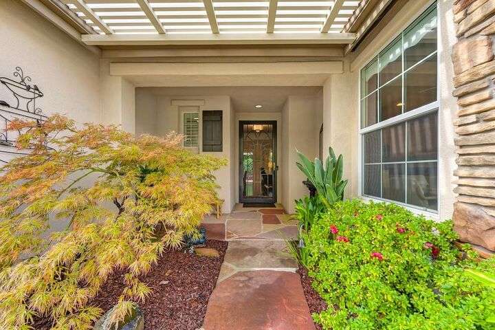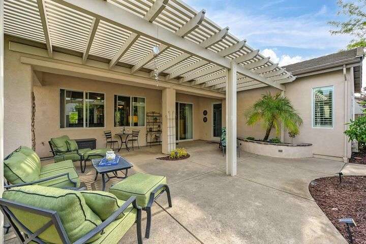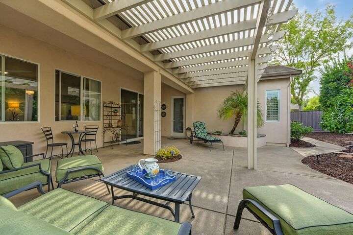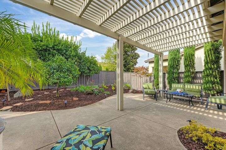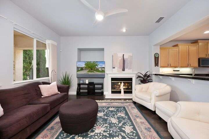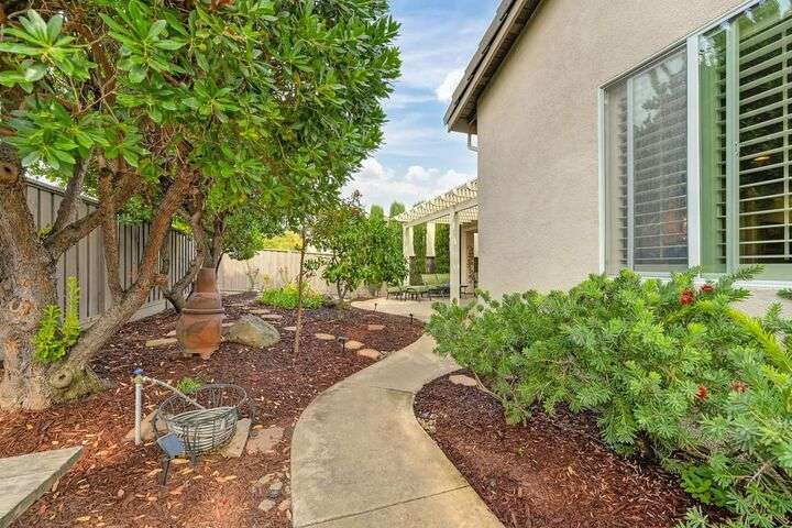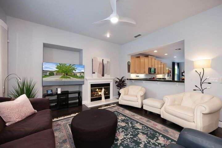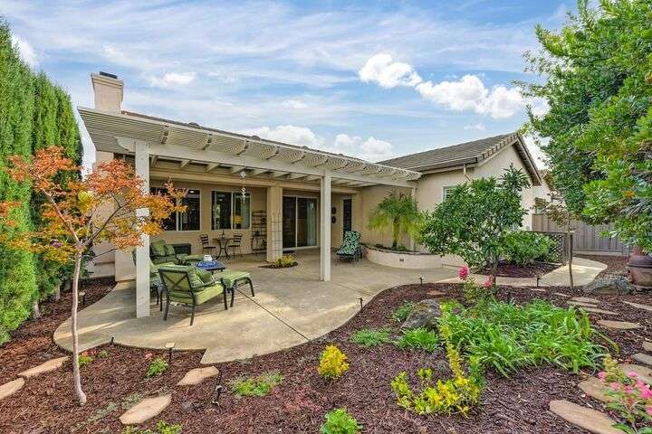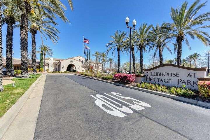 An entertainer's dream in the premiere 55+ active adult gated resort community of Heritage Park. This desirable light-filled open-concept home offers 2 beds/2 baths in 1722 sf. A front patio and a gracious foyer lead to a spacious living/dining room w/ engineered wood floors, a gas fireplace and large windows with views of the backyard. The eat-in kitchen w/ many windows to the front yard includes granite tile counters, breakfast bar, large island, quality appliances and loads of cabinets for ample storage including the laundry room and 2 car garage. The guest bedroom and bath are away from the living areas and the main bedroom is secluded in the back w/ a large en-suite bathroom and walk-in closet. The front and backyard landscape is well-designed to be low maintenance w/ seasonal color and has beautiful trees which offer shade and privacy. The back covered patio w/ extended pergola invites al fresco dining w/ family and friends or relaxing w/ a glass of wine. Heritage Park's world-class amenities include a 25,000 sf clubhouse w/ indoor/outdoor pool, a restaurant, ballroom, library, fitness center, aerobics room and 5 one-acre parks for activities like gardening, biking, walking, water volleyball, bocce ball, tennis and pickle ball. A friendly and welcoming community awaits you!