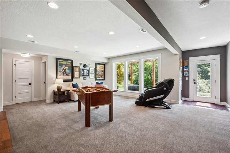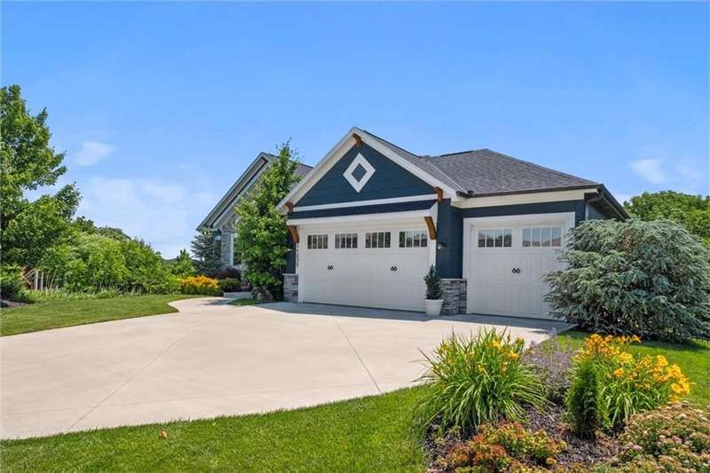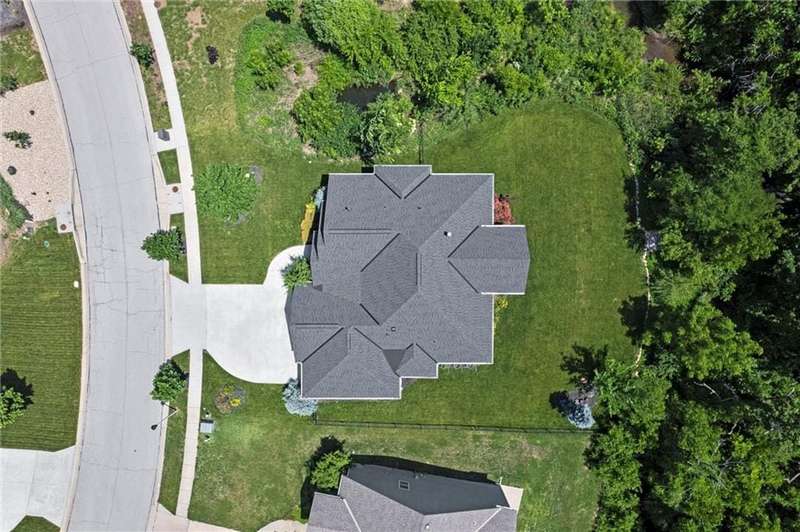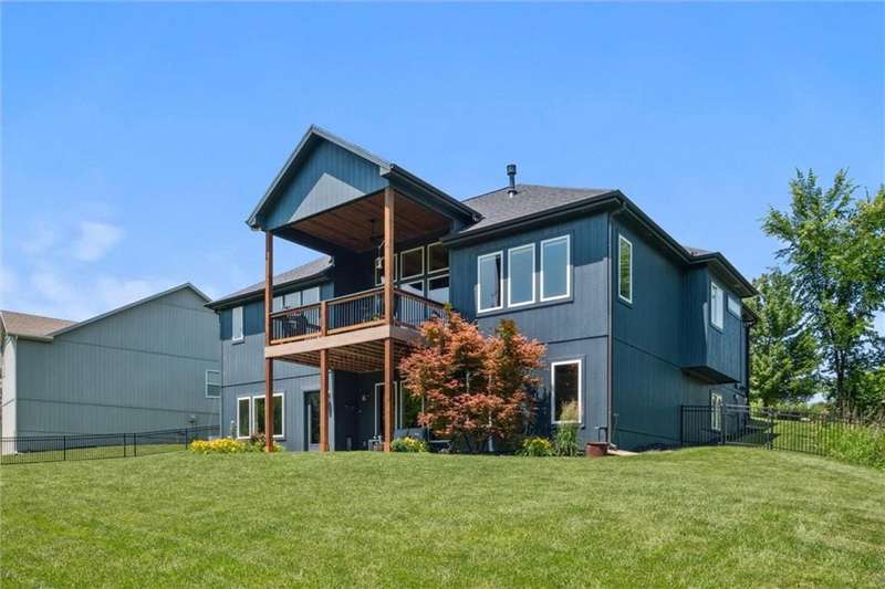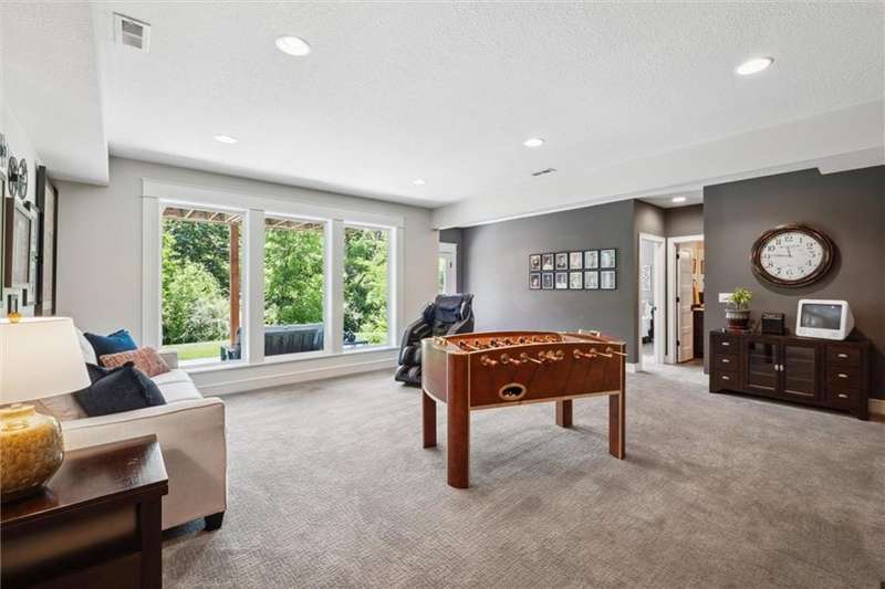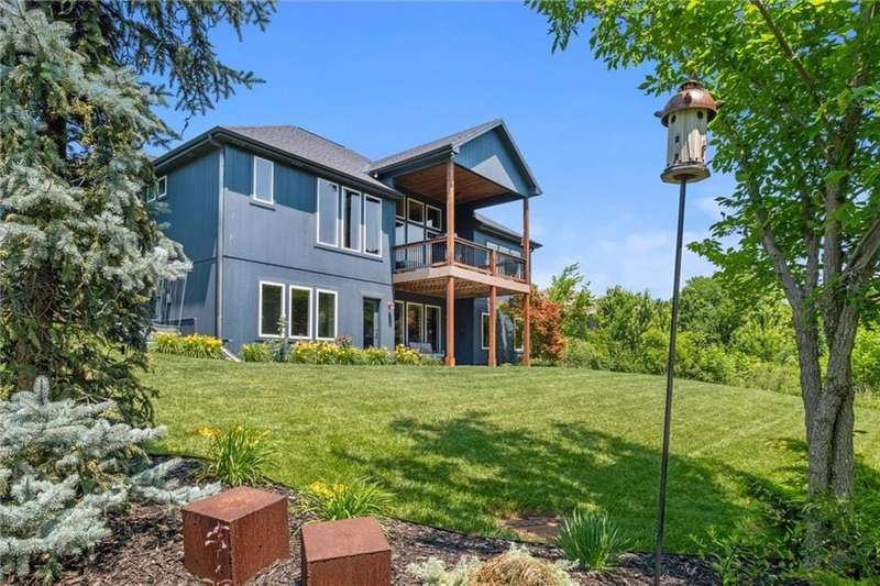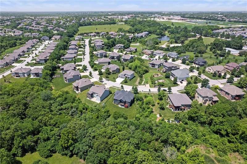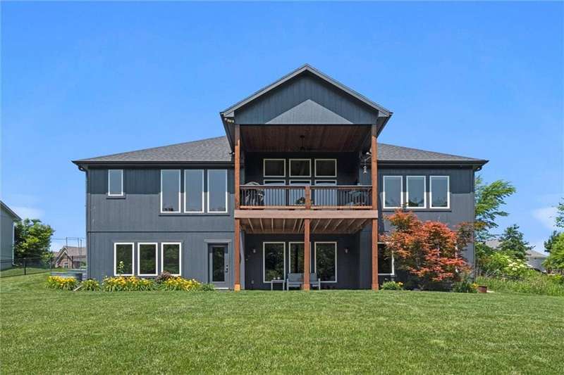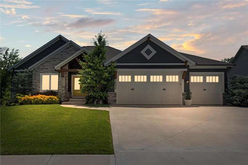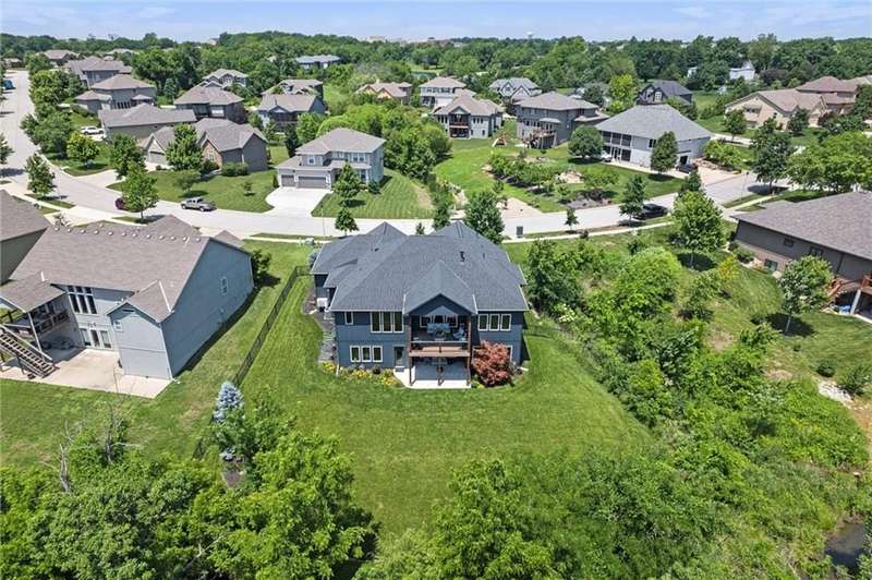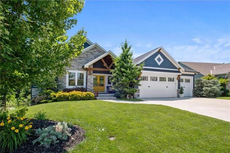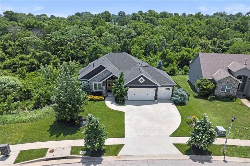 Welcome to this meticulously designed and impeccably maintained Reverse 1.5-story home that blends luxury, comfort, and convenience. Located in the heart of JOCO, this beautiful residence offers easy access to major highways, putting countless amenities just minutes away. From the moment you arrive, youre welcomed by stunning, mature landscaping that sets the tone for whats inside. The spacious main level boasts an open floor plan centered around a striking stone fireplace with built-ins and floor-to-ceiling windows that fill the space with natural light. The main-level primary suite includes power blinds, deck access, and a spa-worthy en suite featuring custom mosaic tilework laid-piece-by-piece and a walk-in steam shower and heated whirlpool tub for ultimate relaxation and wellness. The kitchen features a farmhouse sink, mosaic tile backsplash, wine cooler, and a walk-in pantry with a built-in coffee bar/drink stationperfect for mornings or entertaining. Also on the main floor: a secondary bedroom, private office, laundry room/mud room, and access to the oversized garage, equipped with a mini-split for year-round comfort. The walkout lower level offers three additional bedroomstwo sharing a Jack & Jill bath, and one with a private ensuite. A second living area with a full bar makes for an ideal gathering or entertaining space. Dont miss the HIDDEN, CLIMATE_CONTROLLED ROOM under the suspended garageperfect as a retreat, home gym, or theater. Additional highlights include: New roof (2024) with 40-year Class 4 shingles (transferable warranty), tankless hot water heater, whole-home water softener and purifier, all major mechanicals replaced in 2017, plantation shutters, and diamond-cut concrete in the driveway and covered patio. Pool Table, Card Table & Couch in secret room, all stay with the sale! Home backs to greenspace. This residence stands out with high-end finishes, thoughtful design, and exceptional functionality truly one-of-a-kind.