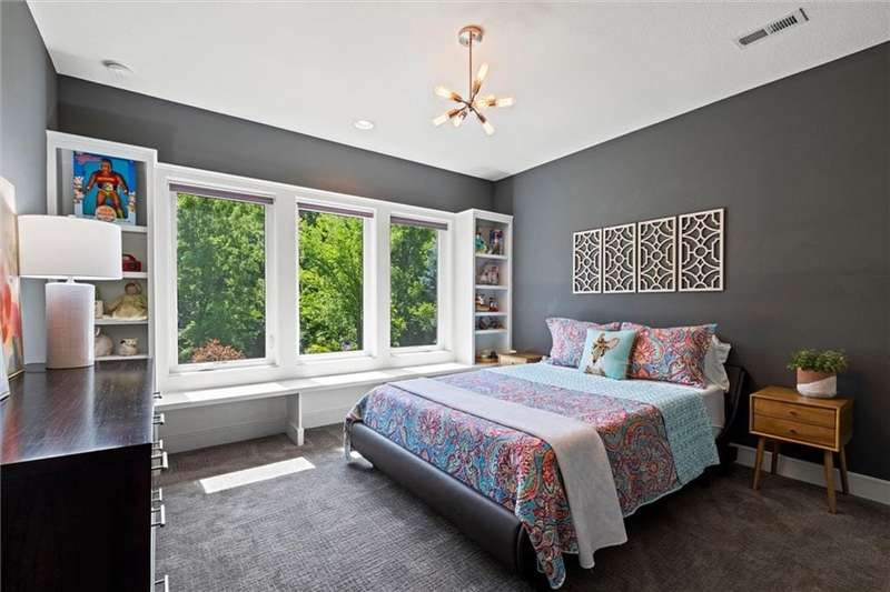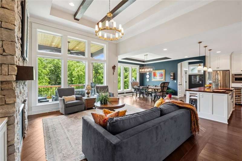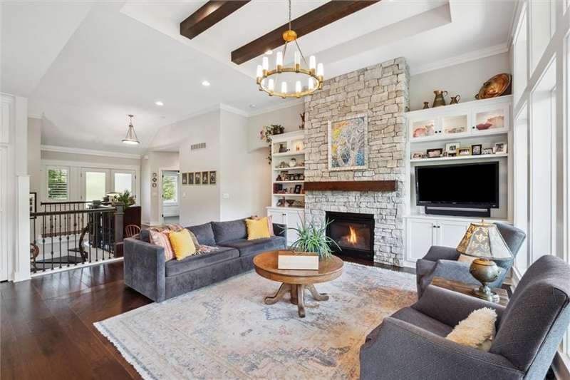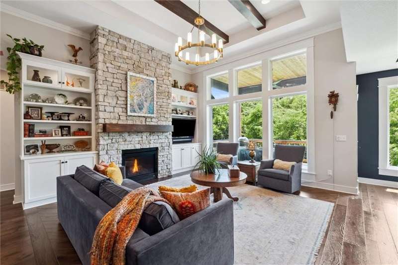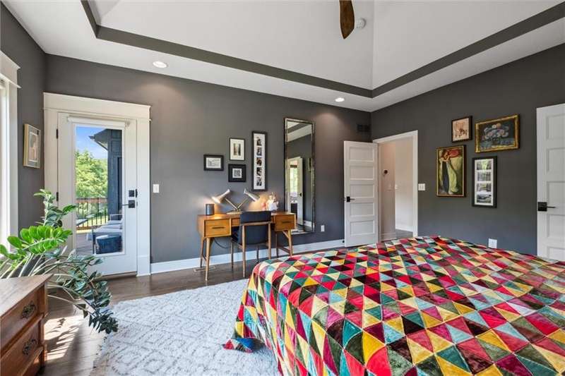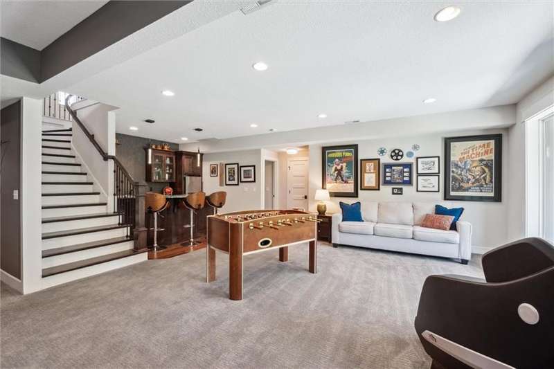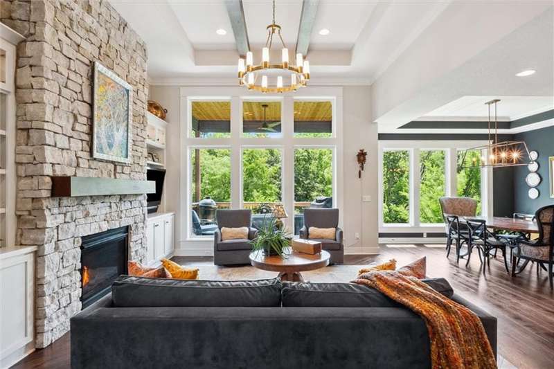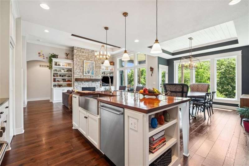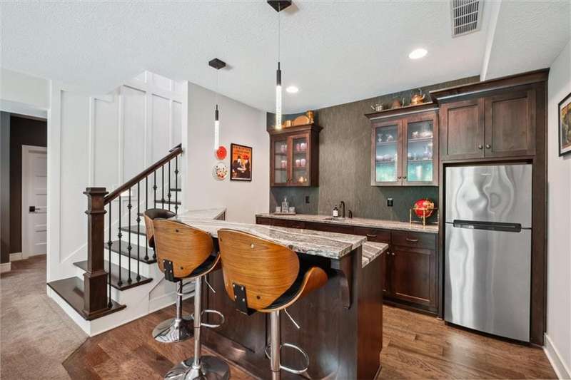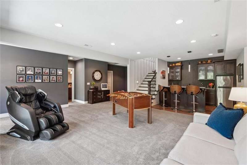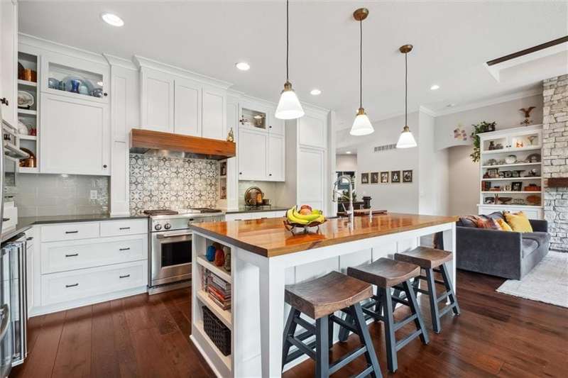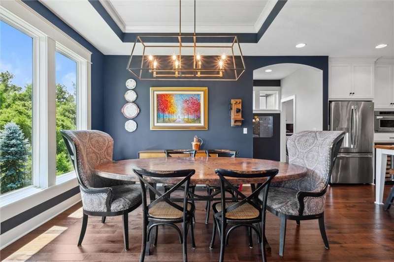 Welcome to this meticulously designed and impeccably maintained Reverse 1.5-story home that blends luxury, comfort, and convenience. Located in the heart of JOCO, this beautiful residence offers easy access to major highways, putting countless amenities just minutes away. From the moment you arrive, youre welcomed by stunning, mature landscaping that sets the tone for whats inside. The spacious main level boasts an open floor plan centered around a striking stone fireplace with built-ins and floor-to-ceiling windows that fill the space with natural light. The main-level primary suite includes power blinds, deck access, and a spa-worthy en suite featuring custom mosaic tilework laid-piece-by-piece and a walk-in steam shower and heated whirlpool tub for ultimate relaxation and wellness. The kitchen features a farmhouse sink, mosaic tile backsplash, wine cooler, and a walk-in pantry with a built-in coffee bar/drink stationperfect for mornings or entertaining. Also on the main floor: a secondary bedroom, private office, laundry room/mud room, and access to the oversized garage, equipped with a mini-split for year-round comfort. The walkout lower level offers three additional bedroomstwo sharing a Jack & Jill bath, and one with a private ensuite. A second living area with a full bar makes for an ideal gathering or entertaining space. Dont miss the HIDDEN, CLIMATE_CONTROLLED ROOM under the suspended garageperfect as a retreat, home gym, or theater. Additional highlights include: New roof (2024) with 40-year Class 4 shingles (transferable warranty), tankless hot water heater, whole-home water softener and purifier, all major mechanicals replaced in 2017, plantation shutters, and diamond-cut concrete in the driveway and covered patio. Pool Table, Card Table & Couch in secret room, all stay with the sale! Home backs to greenspace. This residence stands out with high-end finishes, thoughtful design, and exceptional functionality truly one-of-a-kind.