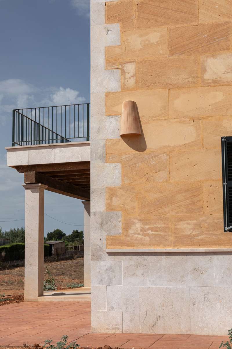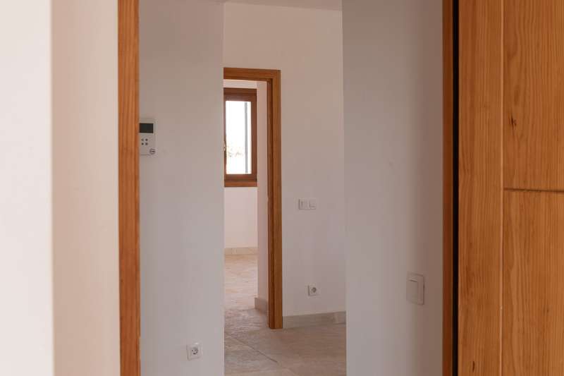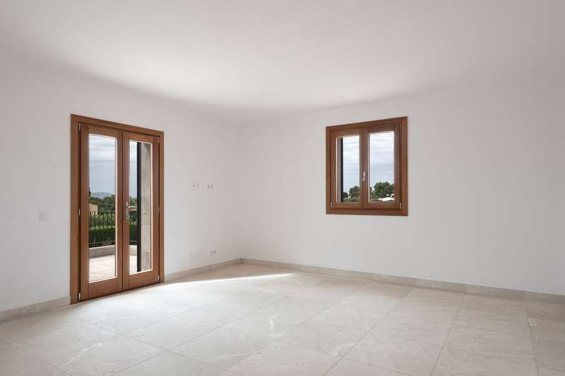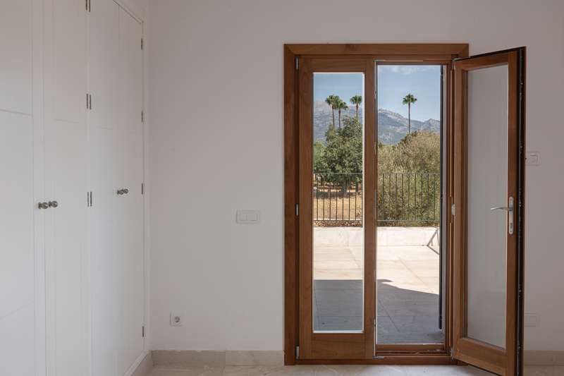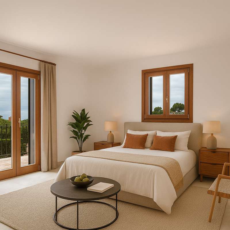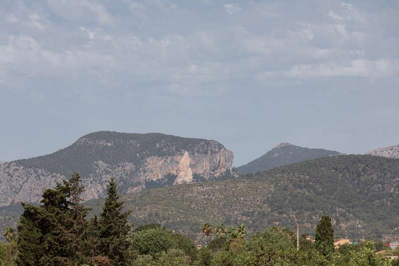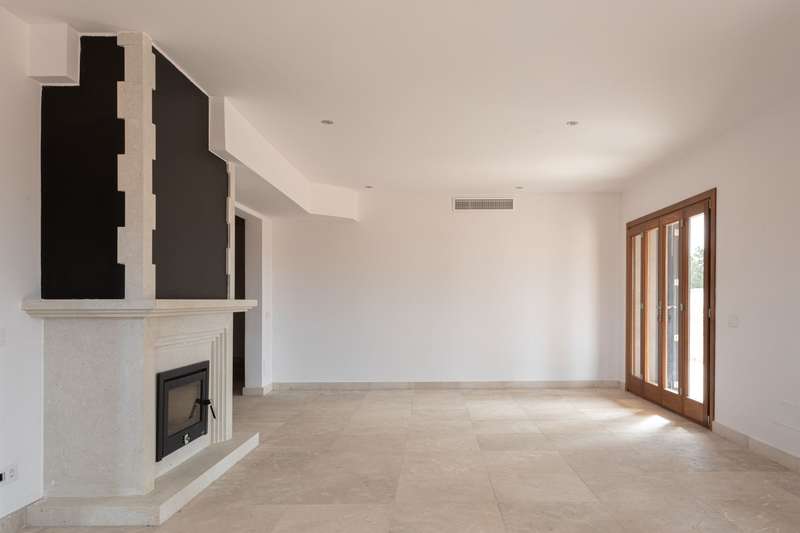 This lovely villa is located in the Pla region of Mallorca with beautiful views of the Tramuntana mountain range. It is a detached house featuring a private pool, garage, and its own water well, set on a fully fenced and enclosed plot of 15,000?m² — ideal for nature and animal lovers. As a newly built villa, completed in July 2025, it is finished to the highest standards. The house features natural Binissalem stone flooring, underfloor heating on both levels, ducted air conditioning throughout, and a wood-burning fireplace in its approx. 450?m² of living space, with the layout as follows: On the ground floor, there is an exceptionally spacious living room with a fireplace and access to a 40?m² covered porch. The living area connects through a wide opening to a large, fully equipped kitchen. This floor also includes a bedroom with an en-suite bathroom, a guest toilet, and an impressive entrance hall. On the first floor, there are four bright and spacious bedrooms, two of which have en-