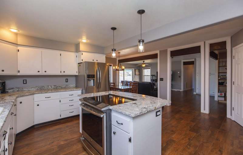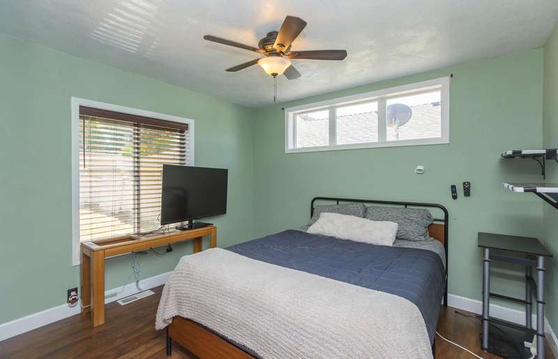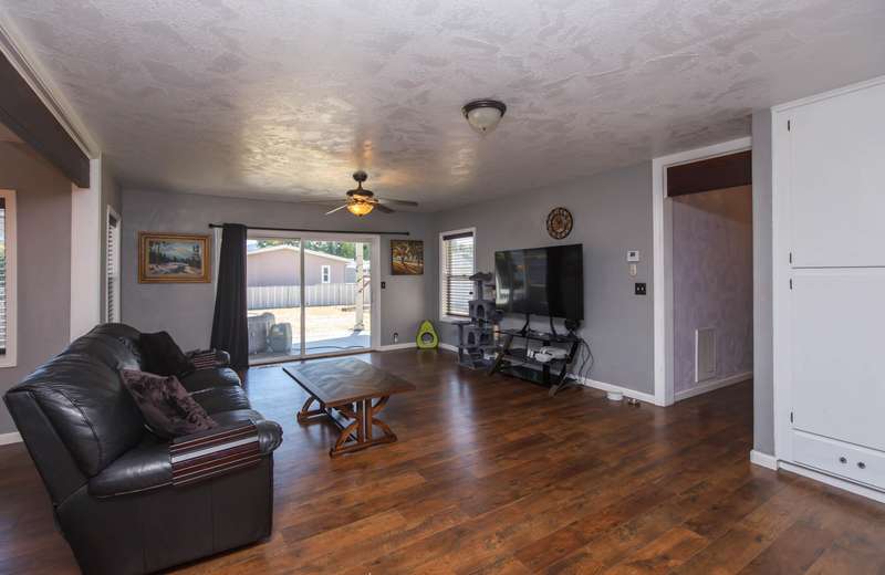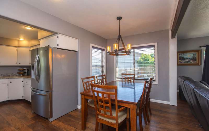 This home has many nice upgrades and is full of charm. Open floor plan with a slider to the backyard patio from the living room. The dream kitchen is spacious with granite counters, stainless appliances (included), island, pantry and adjoining Dining room area. The laundry room has a door leading to the side yard convenient for accessing the detached 2 car garage. Primary bedroom features double closets and an en-suite bathroom with a walk in shower. The living area, bedrooms and kitchen have laminate flooring, tile in bathrooms and laundry room. Both front and back covered patios are custom stamped concrete. The detached garage has room for a workshop, fenced back yard w/firepit, R.V. parking w/hookups. You won't want to miss this one.