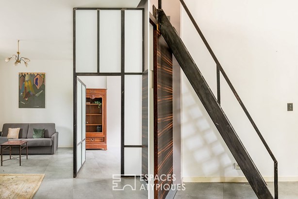 Hidden behind a glass roof, a spacious and quiet bedroom, facing a courtyard, an elegant bathroom with a walk-in shower, and a custom-made dressing room complete this level.