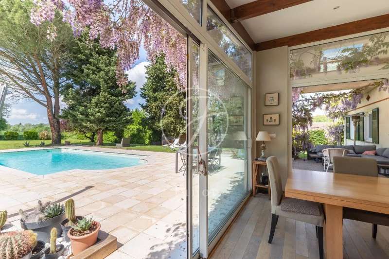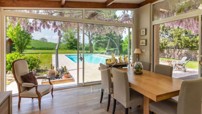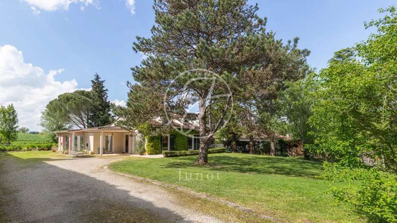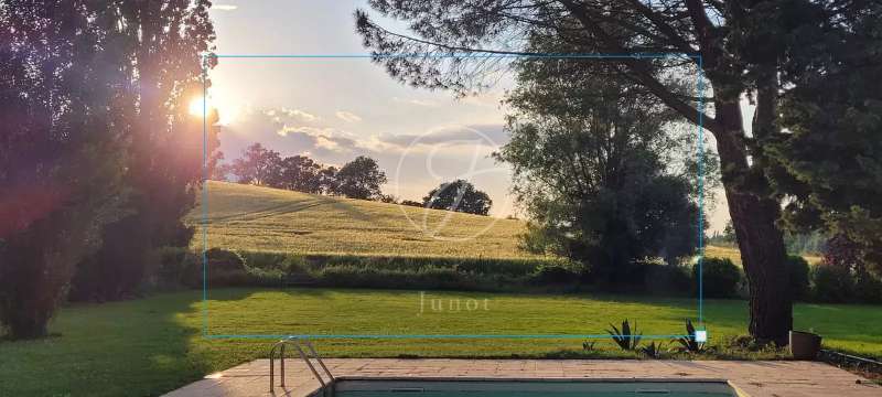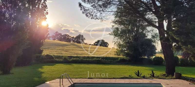Just 12 Minutes from Toulouse – A Family Haven in the Heart of Pin-Balma Nestled in a peaceful, verdant setting just a stone’s throw from Toulouse, this exceptional family home unfolds across a rare 2,770 m² plot, including a 1,000 m² buildable section to shape as you wish. A breathtaking, unobstructed view stretches out to the horizon, offering an ever-changing tableau of sky and light. Outside, a delicate harmony between landscaped garden and natural woodland invites you to experience life in all its richness. Every corner is designed with care: generous play areas for children, shaded nooks for heartfelt family gatherings, and elegant spaces perfect for refined entertaining. Thoughtfully conceived to welcome both large families and cherished guests, the home offers five spacious bedrooms and three bathrooms spread over two levels. On the ground floor, you’ll also find a home office overlooking the garden, a high-end sauna, a sun-drenched kitchen, a cozy TV lounge, and a stunning veranda-style living room. Bathed in natural light through expansive glass doors, this exquisite space opens directly onto a shimmering pool — a seamless union between the warm, inviting interior and the convivial outdoors. The covered terrace extends this tranquil atmosphere: even on the sunniest days, it provides a welcome breath of coolness, perfect for peaceful moments of rest and reflection. Meticulously maintained and crafted to the highest standards, this home is a testament to quality and timeless charm. Here, every moment is lived in harmony — a sought-after lifestyle where understated elegance meets the simple joy of being together.