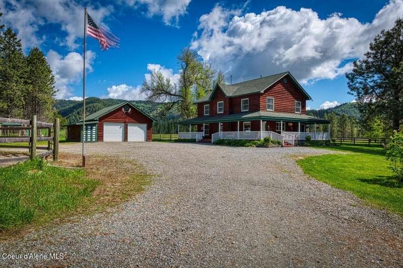 Escape to your own private Idaho paradise with this impeccably maintained farmhouse, nestled on 10.8 acres of fertile, fenced pasture and timberland, framed by breathtaking mountain vistas. Just 30 minutes from the pristine shores of Priest Lake—Idaho's Crown Jewel—and an hour from the world-class slopes of Schweitzer Mountain, this property offers the ultimate blend of serenity and adventure. Step inside this 3,600 sq ft cedar-sided retreat, where rustic charm meets modern elegance. With 6 spacious bedrooms, 4 well-appointed bathrooms, an office, and a cozy family room, this home is designed for both relaxation and connection. Custom finishes elevate every corner—gleaming hardwood floors, intricate tile work, fresh paint, and a cottage-style kitchen with custom cabinetry that's as functional as it is beautiful. Perfect for hosting, the open layout flows effortlessly, inviting gatherings large and small. Outside, unwind on the expansive wraparound covered porch or extended deck.