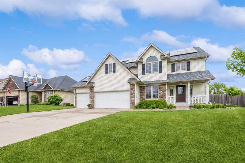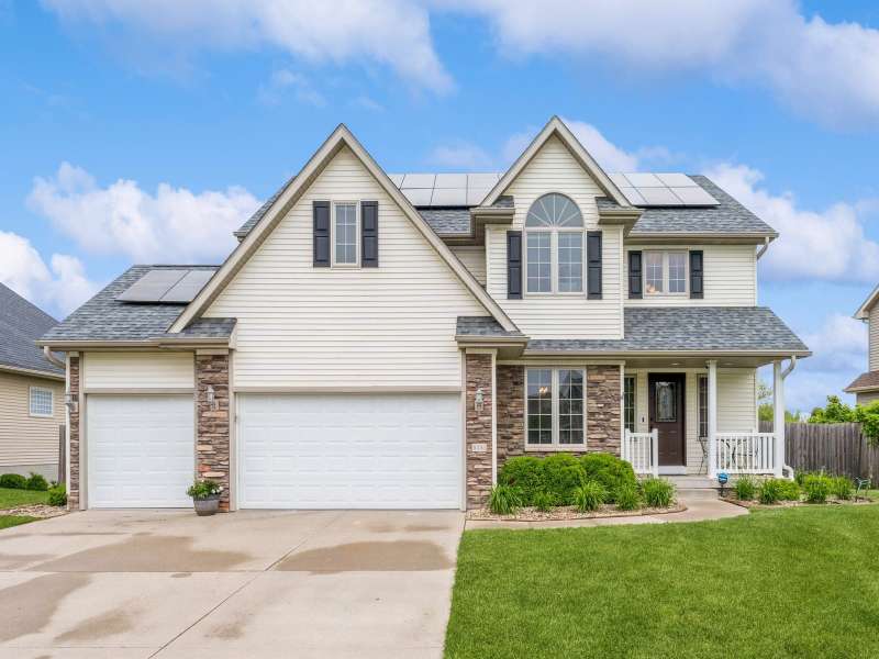 Location! Location! Nestled just west of Jordan Creek mall, north of Valley View Aquatic Center surrounded by architecturally designed neighboring homes. This beautifully designed two-story home offers 5 bedrooms and 4 bathrooms, perfect for spacious and comfortable living. The open kitchen flows into the dining and large great room with gas fireplace. Step outside onto the large deck, complete with stairs leading down to the yard and stamped concrete patioideal for outdoor entertaining relaxing with family. Upstairs, the primary bedroom & ensuite features a double vanity, tile shower, soaker tub and large walk-in closet, providing ample storage and a private retreat. Three additional nice sized bedrooms share a full bath & laundry is upstairs for ease of use. The lower level boasts a rec room wired with Dolby Atmos surround sound with stone fireplace, 5th bedroom, and full bath Upgraded Kitchen cabinets. 3 Car Garage. Walking distance to Brookview Elementary. Make sure to note the included solar panels with 25 year transferable warranty ensuring low energy costs. Make sure to see this one!