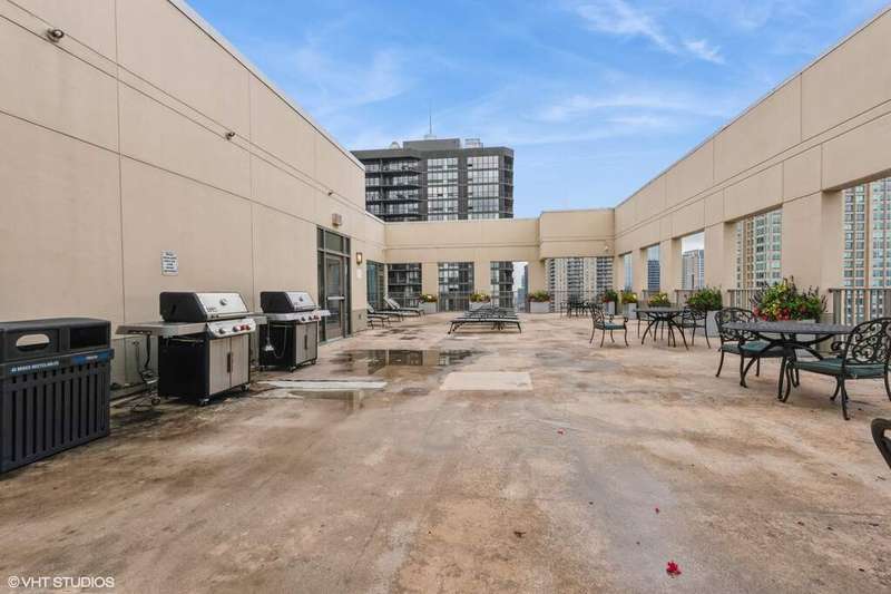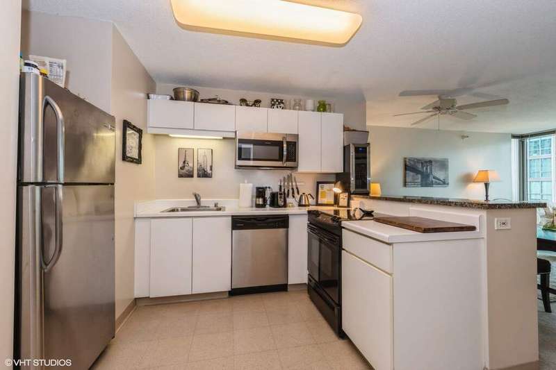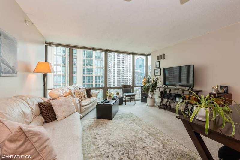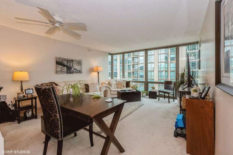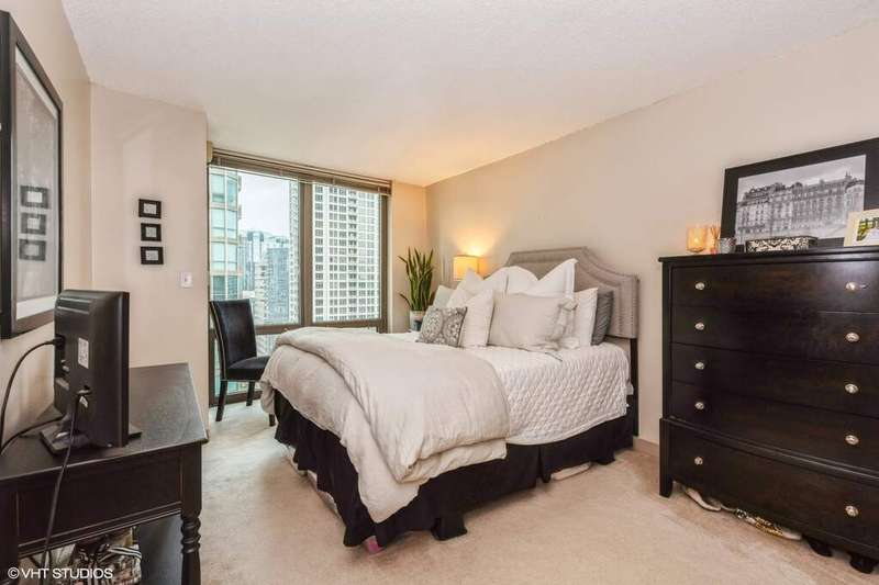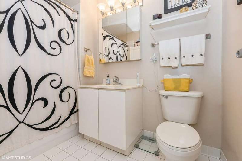 Live in the heart of River North with everything at your doorstep. This stunning home boasts floor-to-ceiling windows framing spectacular city views. The open-concept kitchen features stainless steel appliances and seamlessly connects to a spacious living/dining area-perfect for entertaining, whether it's an intimate gathering or a large crowd. The primary bedroom easily accommodates a king-size bed, dresser, and nightstands, and comes with a huge walk-in closet. You'll also enjoy the convenience of an in-unit washer and dryer. The updated bathroom offers generous space and a full tub. All of this is just steps from grocery stores, shopping, public transit, and a wide array of restaurants.