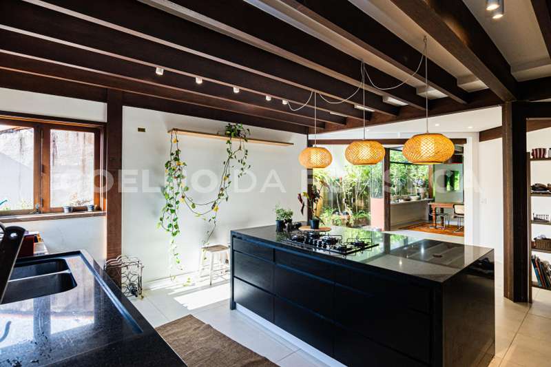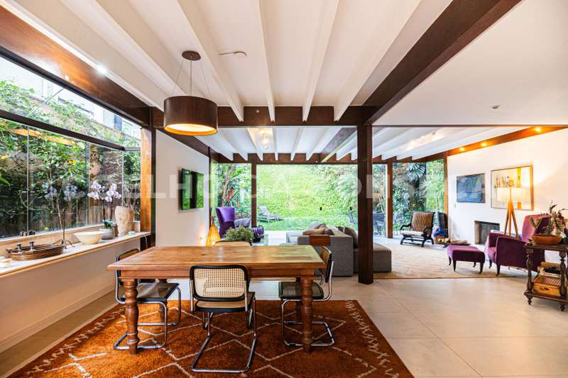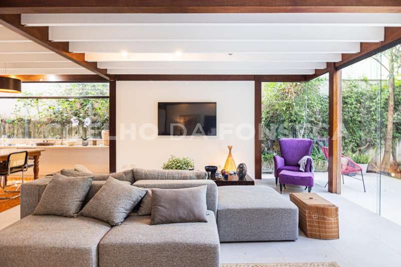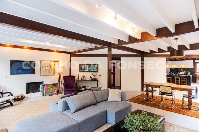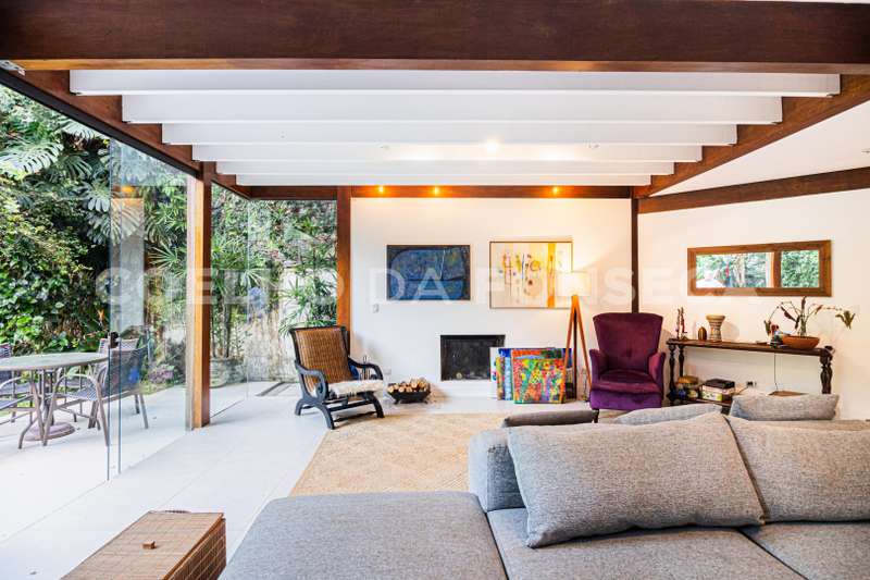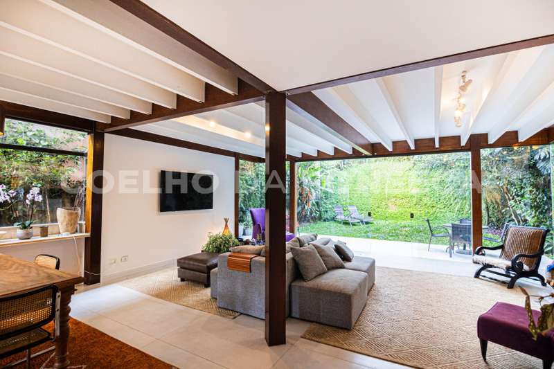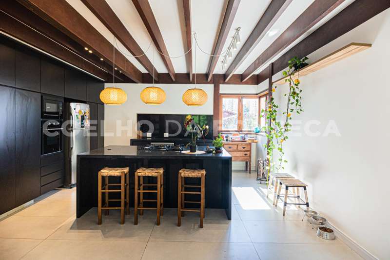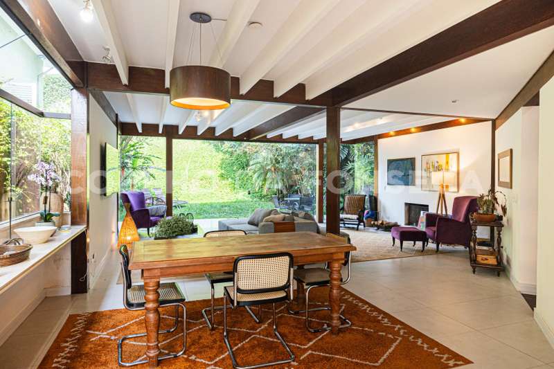 Cozinha atualizada com marcenaria de muito bom gosto e aberta para o living. O living com lareira está voltado para o jardim passando a sensação de tranquilidade.