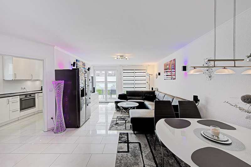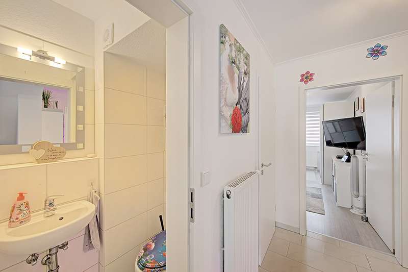 This offer is for a south-facing terrace apartment with a garden. The floor plan has a total of four rooms with two bathrooms and a guest WC, a partially covered terrace and a garage with an electric door and direct access to the apartment. A side staircase takes you to your own front door and to the main living level with access to the terrace and garden. The kitchen and the bright living/dining area face the garden, while the two bedrooms face the quiet residential street. The beautiful daylight bathroom with bathtub and shower, a storage room with washing machine connection and a separate guest WC round off the harmonious picture very comfortably. A staircase leads down to the spacious basement room with a separate dressing room and another shower room. From here you have direct access to your own garage with a further storage room and shelves for supplies, etc. If you are looking for a timelessly modern apartment in a quiet location in Schüren, call and arrange your individual viewing appointment. We look forward to seeing you.
