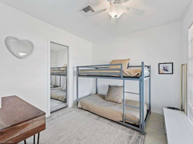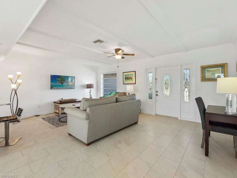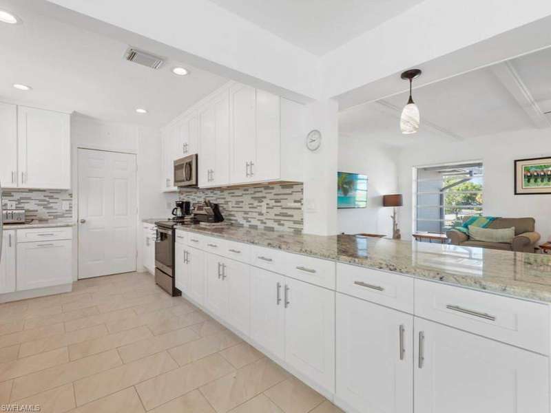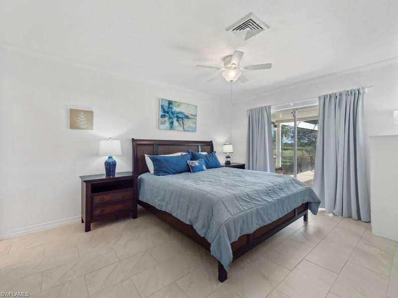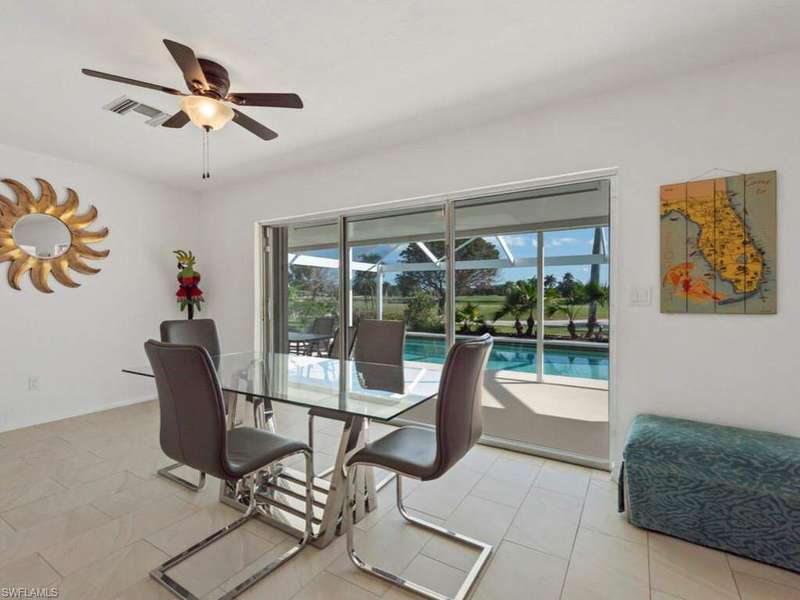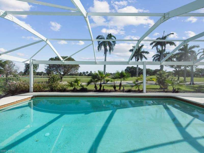 Enjoy remarkable golf course and lake views from this updated home. Set on an oversized lot (100 x 150 ft.), this single-level residence features an open-plan living, dining, and kitchen area, with newer tile throughout, all overlooking the golf course, serene lake, and screened refinished pool. The light-filled kitchen boasts new cabinets, granite counters and glass tile backsplash, breakfast nook, and breakfast bar for three, with a formal dining area nearby. The ensuite primary bedroom with updated primary bathroom, opens directly onto the lanai, while two split bedrooms share a full bath. Perfect for enjoying the indoor/outdoor lifestyle, covered dining and lounging areas, an outdoor shower, a grill, and a grassy yard beyond. Partially furnished and move-in ready, the home also includes upgraded electrical, picture windows, ceiling fans throughout, and a garage with storage and laundry. A circular driveway provides ample parking, complemented by mature landscaping. Just a 5-minute drive to the beach, this home is ideal for a family getaway or a fantastic rental opportunity in a desirable Marco Island neighborhood.