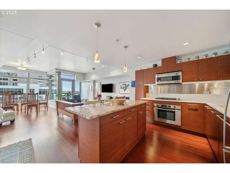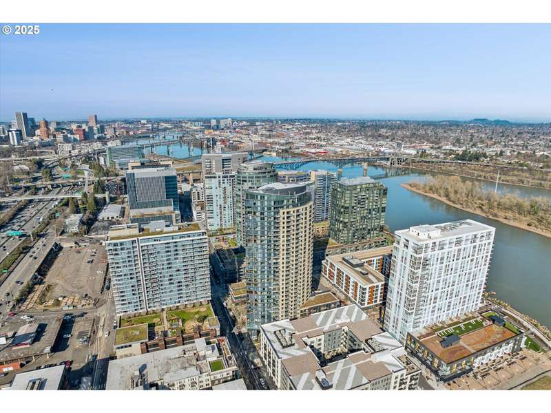 Perched on the 25th floor, this exquisite 2-bedroom, 2-bathroom South Waterfront condo offers breathtaking views of the Willamette River, Mt. St. Helens, & SW Hills. Step inside to discover an open-concept living space that is both sophisticated and inviting. The kitchen is equipped with stainless steel appliances, abundant storage and elegant granite countertops. A spacious living room provides the perfect place to unwind or entertain, while the dining area offers Willamette River views. The primary bedroom is generously sized, boasting a large closet and a bathroom complete with a soaking tub and walk-in shower. The second bedroom/den can serve as an office or guest suite, complete with a murphy bed and easy access to a well-appointed guest bathroom. Step outside onto your private balcony and enjoy the 25th floor views or take advantage of the building’s first-class amenities, including concierge services, a community room and gorgeous rooftop gardens. Secure parking with 2 deeded spots. Located in the heart of the serene South Waterfront neighborhood, this condo is steps from restaurants, shops, and more. Easy access to OHSU via tram. Enjoy the tranquility of a morning stroll along the river and then hop onto the Streetcar and you’re connected to the best of Portland.