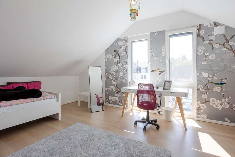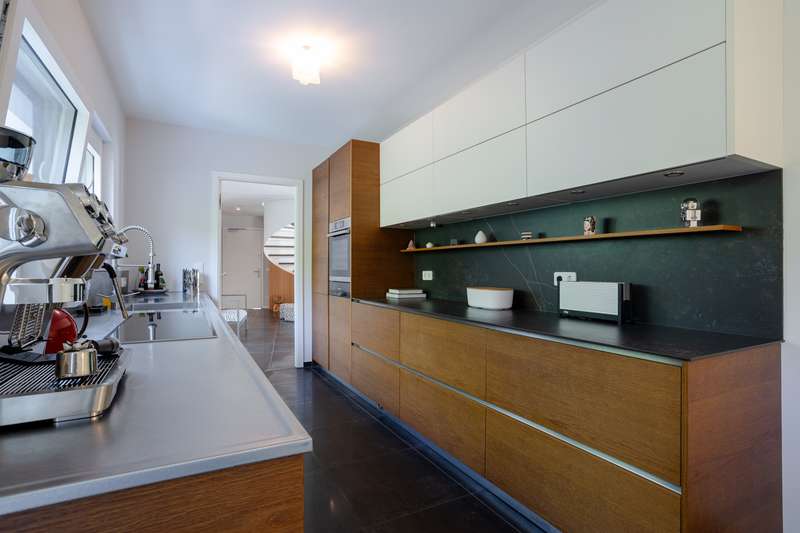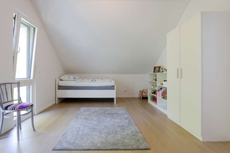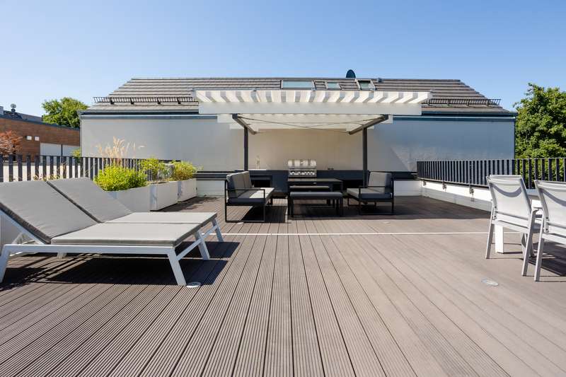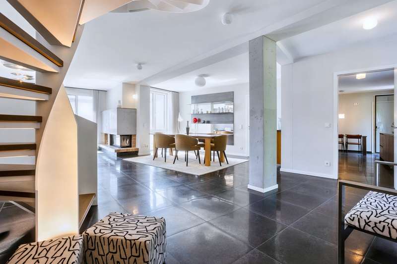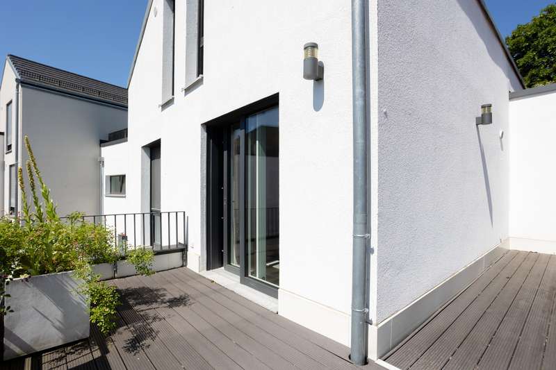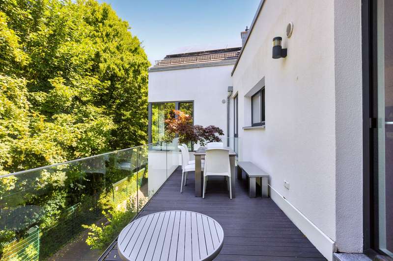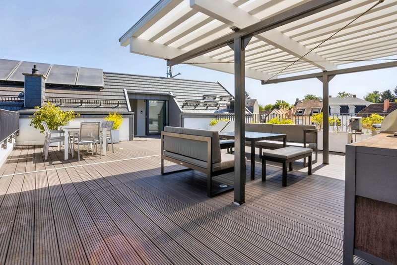 Quietly located in a cul-de-sac in charming, family-friendly Eschersheim, this exclusive penthouse maisonette reveals itself as a true residential gem. Spread over two levels and approximately 265 m² of living space, it combines architectural sophistication, well thought-out interior design and fittings that meet even the highest demands. As soon as you enter the apartment, you can sense the exceptional standards of design and quality. Spacious, light-flooded rooms with ceiling heights of up to 2.65 meters create a stylish, airy ambience. The combination of fine Swiss Bauwerk parquet flooring, large-format Italian design tiles from Fondovalle and smoothly plastered, partially white-painted and stylish exposed concrete walls and ceilings conveys modern elegance with timeless class. The open-plan living/dining area forms the heart of this property - with over 80 square meters of space, floor-to-ceiling windows with electric shutters and direct access to one of the three south-west-facing terraces. The stylish fitted kitchen with full-length stainless steel worktop, equipped with high-quality appliances from Miele and Bosch, blends seamlessly into the luxurious room concept, and from here you can also access the second terrace on this floor with a view of the greenery. On the upper floor, the panoramic roof terrace with an area of around 74 m² invites you to enjoy undisturbed moments with a breathtaking view of the greenery. An airy gallery, a total of five (bedrooms, study or children's) rooms, two exclusive bathrooms with natural light and sanitaryware from TOTO, Duravit and KLUDI, two separate guest WCs as well as several storage rooms and a utility room offer generous comfort for families, couples or individualists with a taste for the extraordinary. Another highlight is the fully integrated LOXONE smart home technology, which intelligently networks lighting, heating, blinds, audio and security - conveniently controllable via app or control element. Electric shutters, a decentralized ventilation system with heat recovery, underfloor heating and high-quality Gira colour video intercoms on each floor round off the first-class technical standard. The new build was designed as an energy-efficient KfW Efficiency House 55 - with sustainable thermal insulation, triple glazing, a solar-assisted heating system and solid masonry made from natural building materials. The offer is rounded off by two separate, spacious cellar rooms and an extra-wide garage parking space (double parking space) right next to the house. This penthouse maisonette stands for uncompromising living comfort, maximum privacy and an aesthetic quality that is rarely found - a real statement for stylish living in the north of Frankfurt.