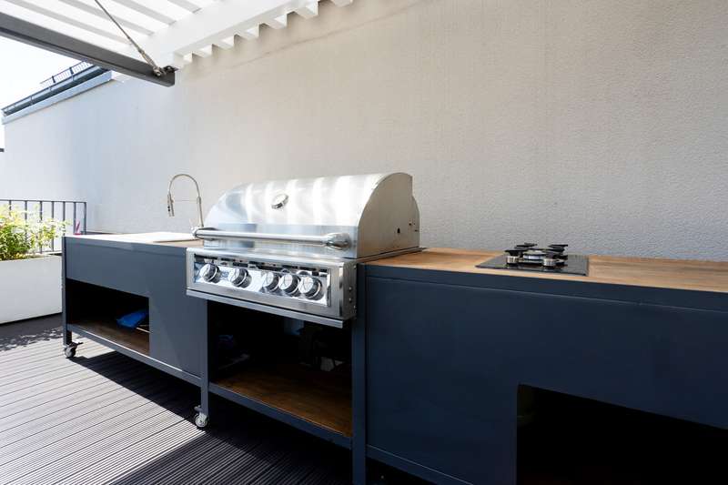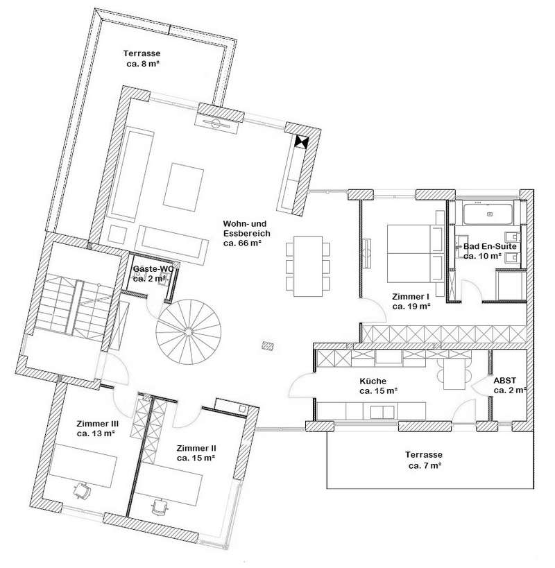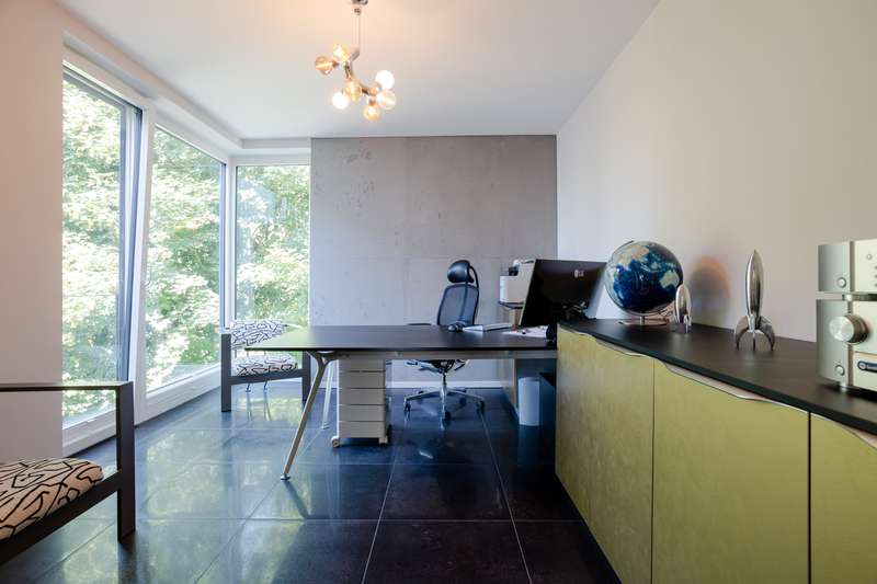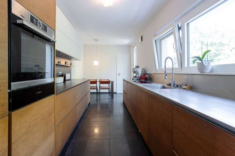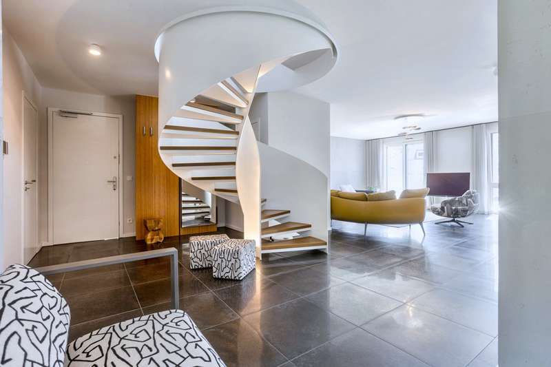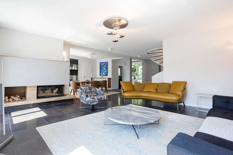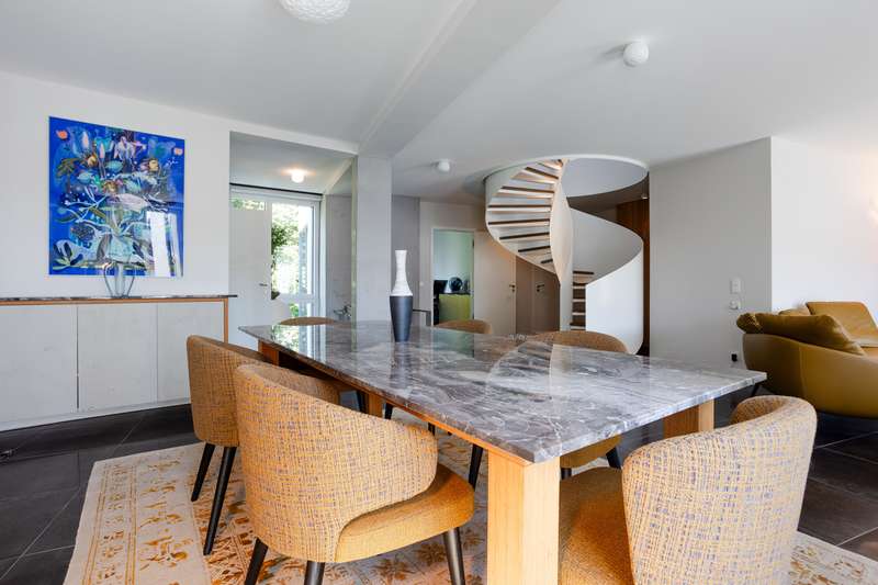 Quietly located in a cul-de-sac in charming, family-friendly Eschersheim, this exclusive penthouse maisonette reveals itself as a true residential gem. Spread over two levels and approximately 265 m² of living space, it combines architectural sophistication, well thought-out interior design and fittings that meet even the highest demands. As soon as you enter the apartment, you can sense the exceptional standards of design and quality. Spacious, light-flooded rooms with ceiling heights of up to 2.65 meters create a stylish, airy ambience. The combination of fine Swiss Bauwerk parquet flooring, large-format Italian design tiles from Fondovalle and smoothly plastered, partially white-painted and stylish exposed concrete walls and ceilings conveys modern elegance with timeless class. The open-plan living/dining area forms the heart of this property - with over 80 square meters of space, floor-to-ceiling windows with electric shutters and direct access to one of the three south-west-facing terraces. The stylish fitted kitchen with full-length stainless steel worktop, equipped with high-quality appliances from Miele and Bosch, blends seamlessly into the luxurious room concept, and from here you can also access the second terrace on this floor with a view of the greenery. On the upper floor, the panoramic roof terrace with an area of around 74 m² invites you to enjoy undisturbed moments with a breathtaking view of the greenery. An airy gallery, a total of five (bedrooms, study or children's) rooms, two exclusive bathrooms with natural light and sanitaryware from TOTO, Duravit and KLUDI, two separate guest WCs as well as several storage rooms and a utility room offer generous comfort for families, couples or individualists with a taste for the extraordinary. Another highlight is the fully integrated LOXONE smart home technology, which intelligently networks lighting, heating, blinds, audio and security - conveniently controllable via app or control element. Electric shutters, a decentralized ventilation system with heat recovery, underfloor heating and high-quality Gira colour video intercoms on each floor round off the first-class technical standard. The new build was designed as an energy-efficient KfW Efficiency House 55 - with sustainable thermal insulation, triple glazing, a solar-assisted heating system and solid masonry made from natural building materials. The offer is rounded off by two separate, spacious cellar rooms and an extra-wide garage parking space (double parking space) right next to the house. This penthouse maisonette stands for uncompromising living comfort, maximum privacy and an aesthetic quality that is rarely found - a real statement for stylish living in the north of Frankfurt.