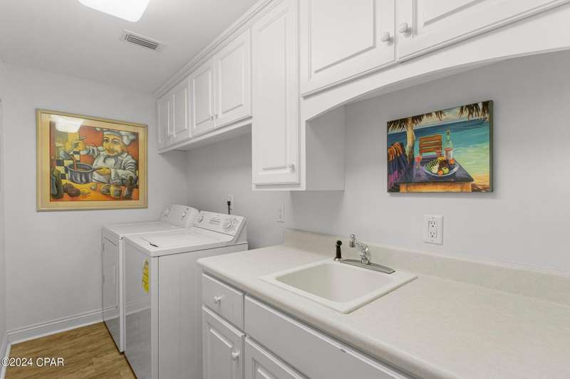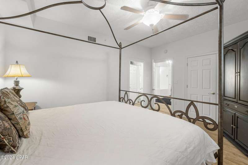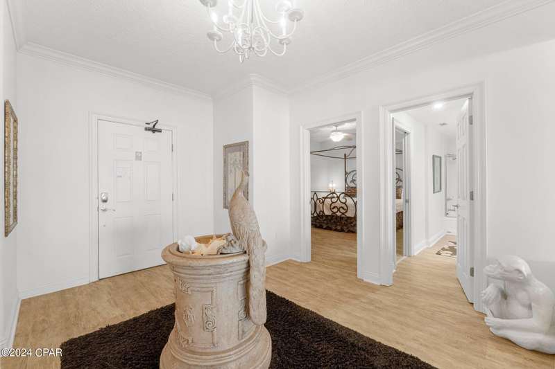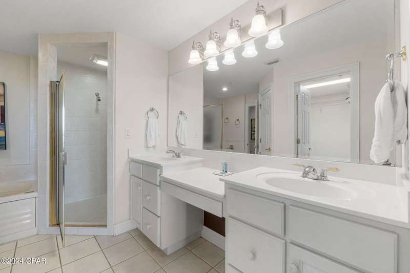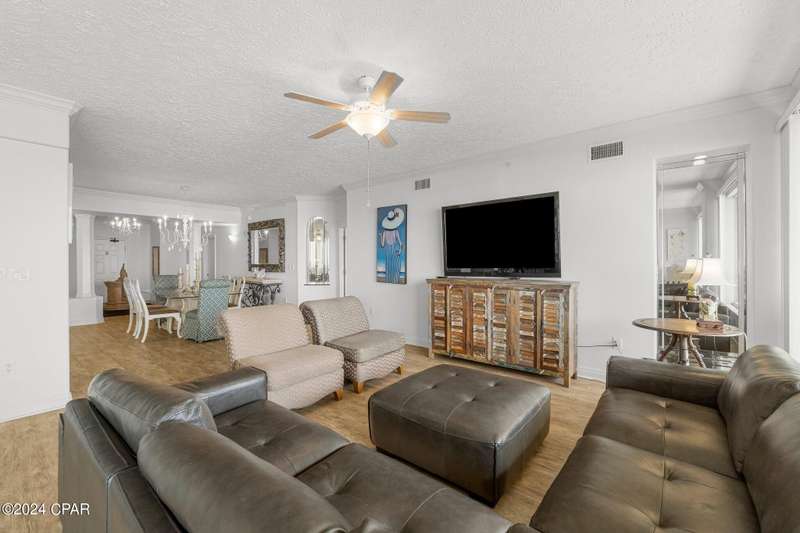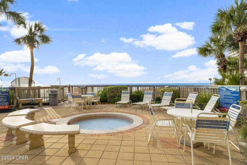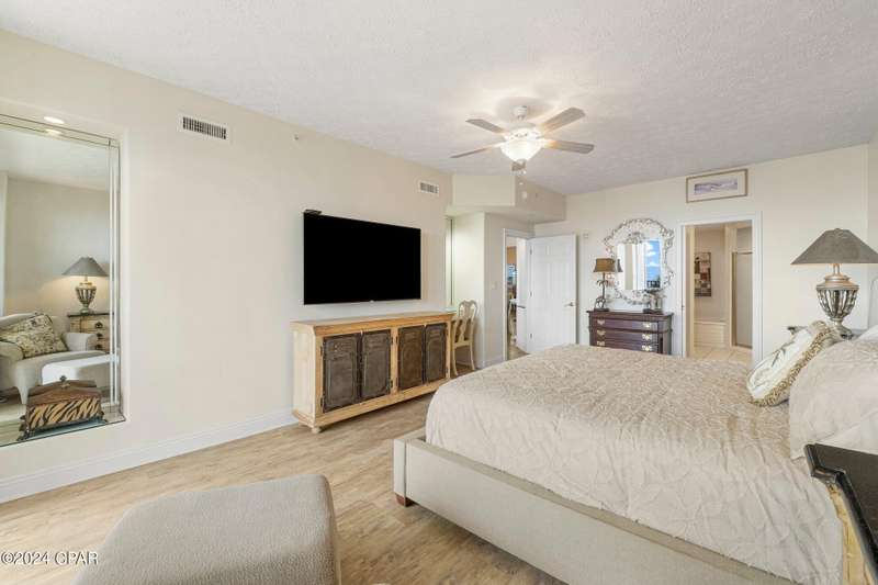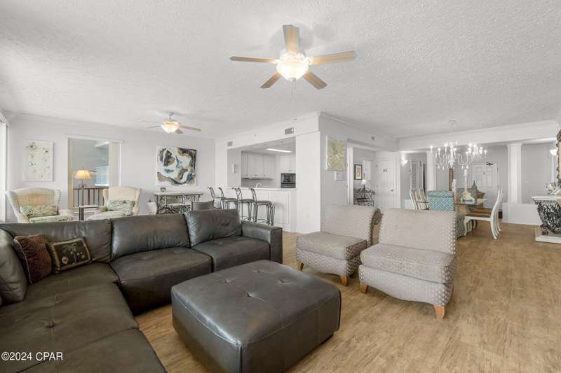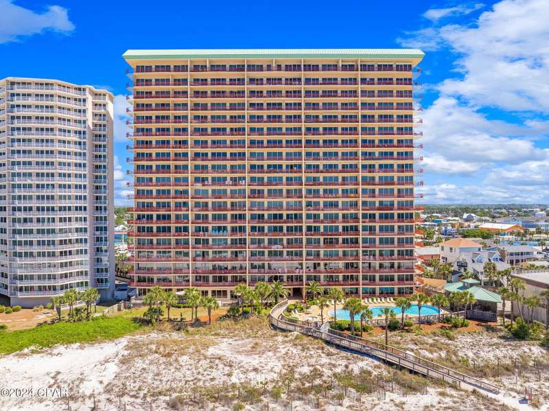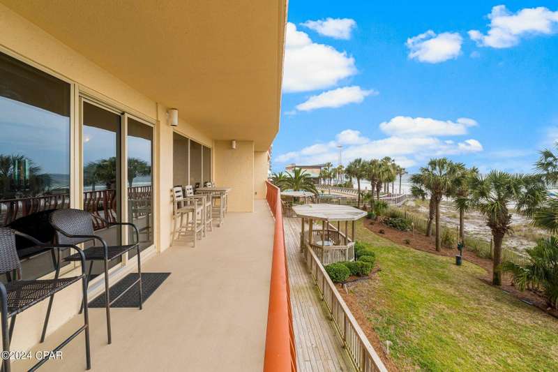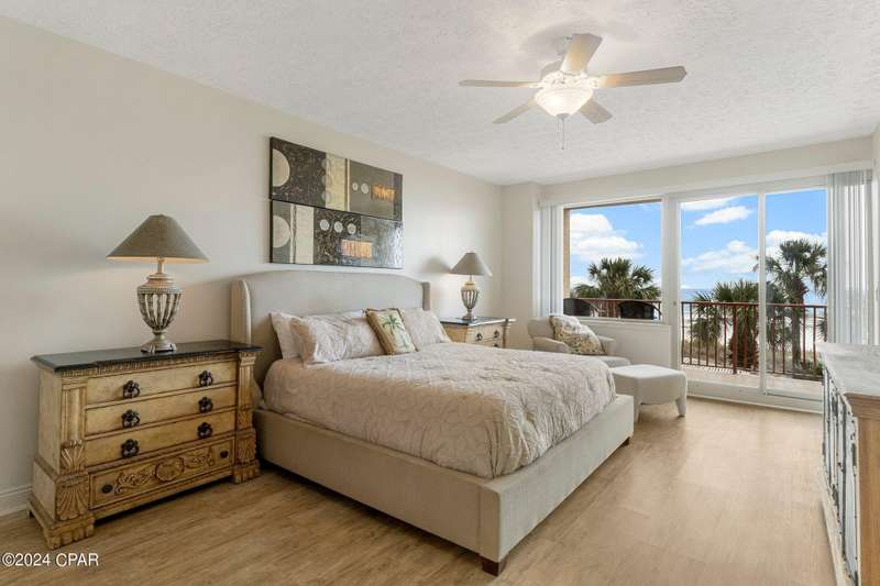 Discover a captivating corner unit in Hidden Dunes, nestled along the pristine shores of Panama City Beach. This spacious retreat spans over 2,300 square feet and boasts three generously-sized bedrooms, each with its own private bath. Embrace unparalleled beachfront living with breathtaking views and coastal luxury at its finest.Step inside to a welcoming foyer adorned with columns, leading to an open-concept living and dining area featuring hardwood floors throughout. Large windows and sliding doors provide panoramic views of the Gulf of Mexico, flooding the space with natural light and offering access to a spacious balcony--an ideal spot to soak in the coastal beauty.The expansive kitchen overlooks emerald-blue waters, perfect for culinary endeavors. The master suite beckons with a king-sized bed, en-suite bathroom featuring a garden tub, separate shower, double vanity, walk-in closet, and private balcony access. Two additional bedrooms each boast private bathrooms and ample closet space.Noteworthy is the west end wrap-around balcony, providing unobstructed views that stretch beyond the horizon. Sold fully furnished, this unit invites you to embrace the coastal lifestyle immediately. Convenience is ensured with a deeded parking space in the garage.Hidden Dunes offers a gated community experience with outstanding amenities, including a gulf-front pool, kiddie pool, fitness room, and community space for gatherings. A spacious exterior storage closet simplifies beach gear management.This condo layout feels like home--ideal for full-time residence, a family beach retreat, or a rental investment. With a proven track record of generating excellent rental revenue, this opportunity seamlessly combines luxury, convenience, and investment potential. Your dream beachfront condo awaits!