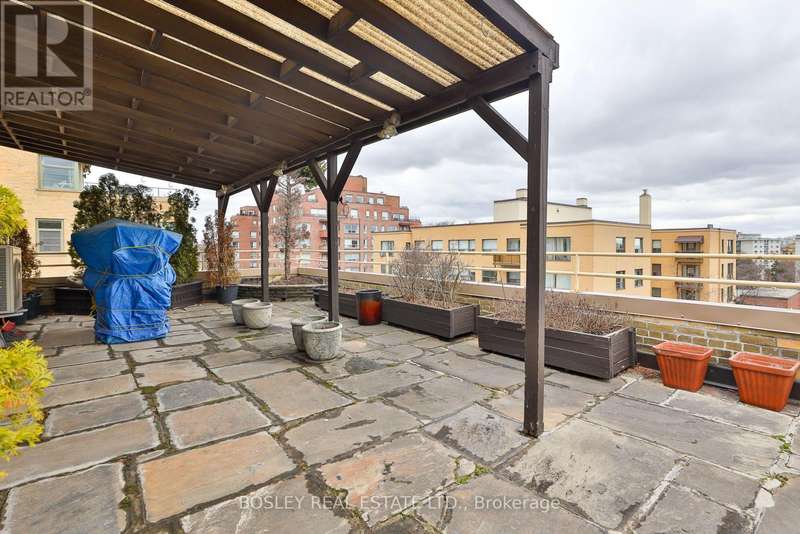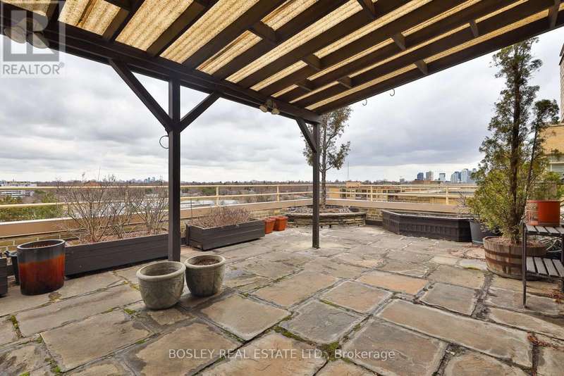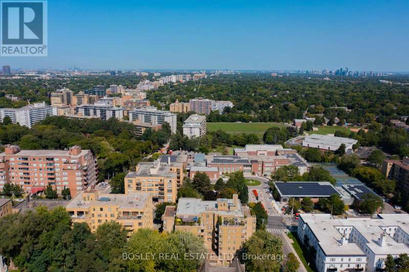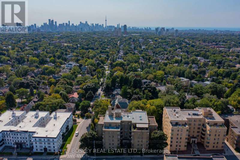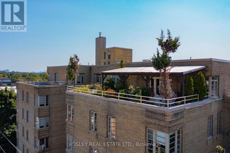 WELCOME TO THE ROYCROFT! In the last years of the Art Deco period, prominent Architect John Edward Hoare designed The Roycroft (1939). A New York style co-ownership Art Deco building at Eglinton & Old Forest Hill Rd. The minute you step into the lobby you know this isn't just any building. The elevator requires you to "open the door when the light comes on". This Art Deco treasured Penthouse is a corner suite (only 4 PHs) nearly 1200 SF of interior living space with an expansive open concept living & dining area, oversized windows & walk-out to a splendid 653 SF terrace overlooking a canopy of Forest Hill homes, parks and our City's skyline, it's breathtaking! The separate kitchen is tucked to one side with lots of natural light thx to the skylight. See rendered photos of possible open concept for kit & dining rm. The oversized primary bdrm boasts a large window w/beautiful view over the top of majestic Forest Hill homes. The 2nd bdrm is also a good size with wall-to-wall closets. This room was used as dual purpose home office/bdrm with lots of built-in bookshelves. The Roycroft is a short walk to the shops, services & restos of "Theeglintonway.com". The soon to be Chaplin subway station is a 5 min walk down the street & there's a bus right at the front door. Financing is more readily available for co-ownerships than co-ops see attached reference material. The monthly maintenance fees cover all utilities including cable/internet as well as property taxes. This suite comes with a parking & locker. These large PH suites rarely come on the market and the buyer for this incredible piece of history may want to renovate it while maintaining the integrity of its art deco charm or go with a custom decor. This property is sold in "As Is" condition.