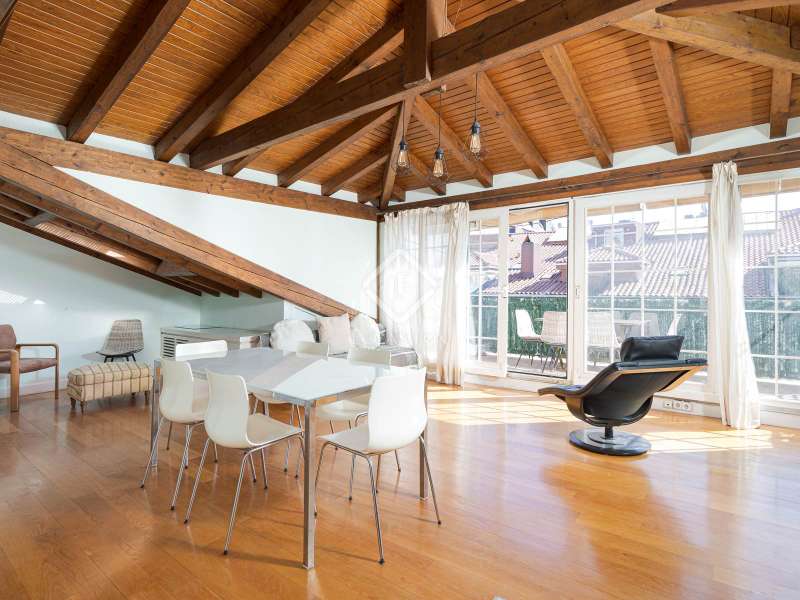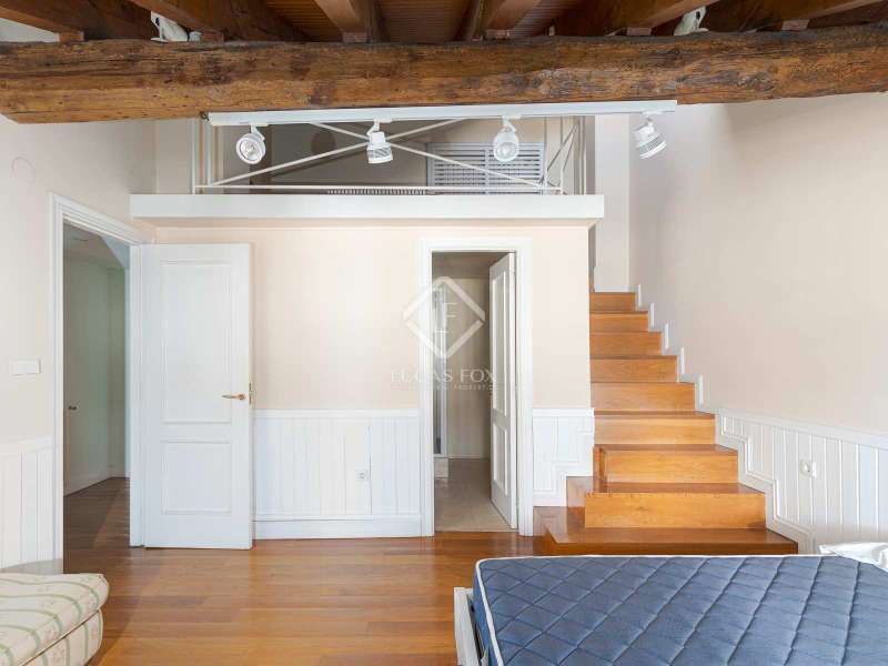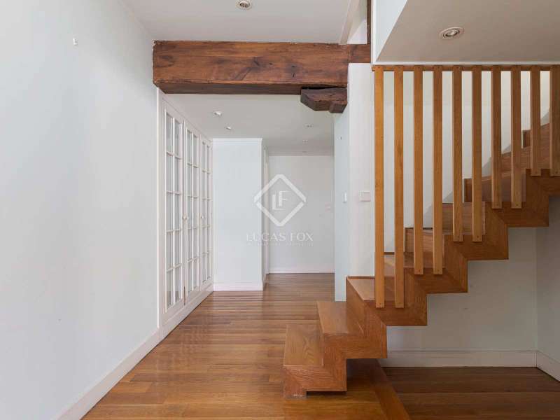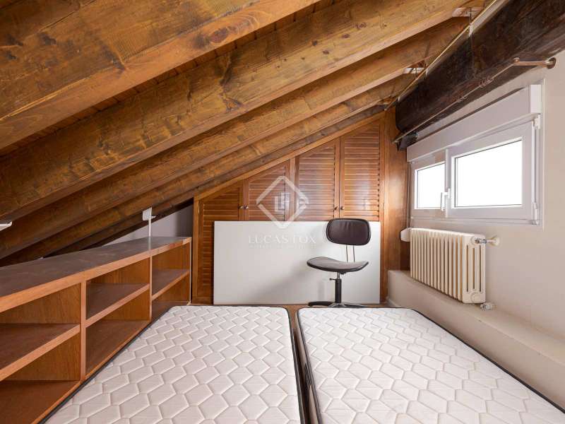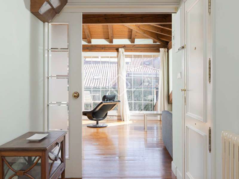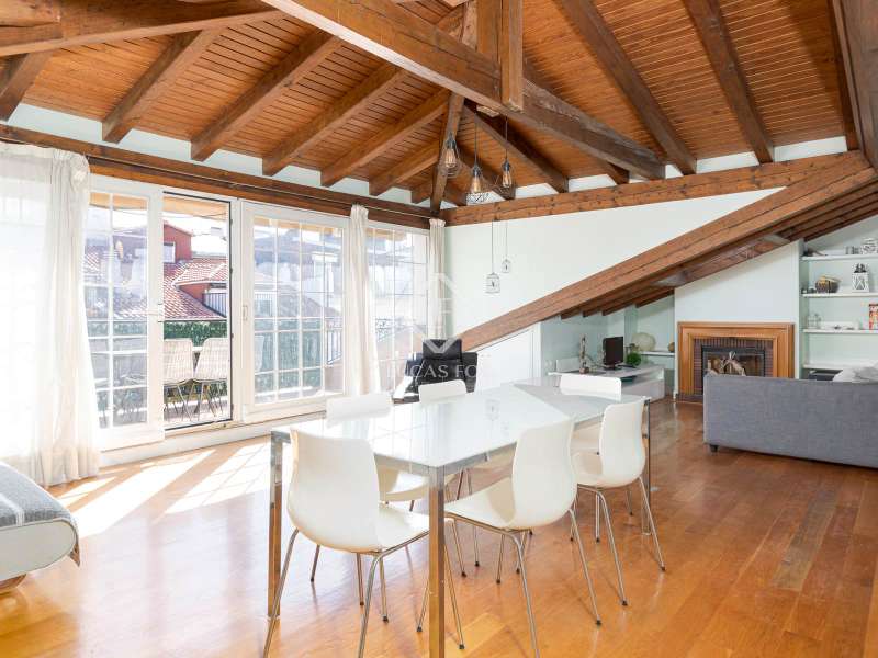 Ideal for families, this property could easily be one or two superb properties, as it also has a comfortable terrace overlooking Legazpi Street, just steps from Plaza Guipúzcoa. It is distributed in a lobby, which leads to a spacious living room room with a fireplace, a dining room , and a reading room with several clearly differentiated areas. Large windows flood the space with light and access onto the terrace for snacks and fresh air. The kitchen is equipped with appliances and connected to this space, although it has a sliding door that can separate them. On the other side of the lobby , we find a full bathroom and a staircase leading to a small attic that can be used as a storage room or service room. Next, we find two double bedrooms, each with a generously sized lower floor and a loft, and each with a full en-suite bathroom . The finishes used remind us of a typical "baserri" (Basque farmhouse), with beautiful wooden beams and sloping ceilings that reach great heights. It needs updating in some rooms, but offers great potential as the building also has east-facing rights.