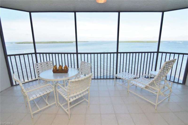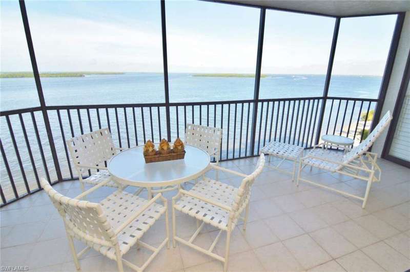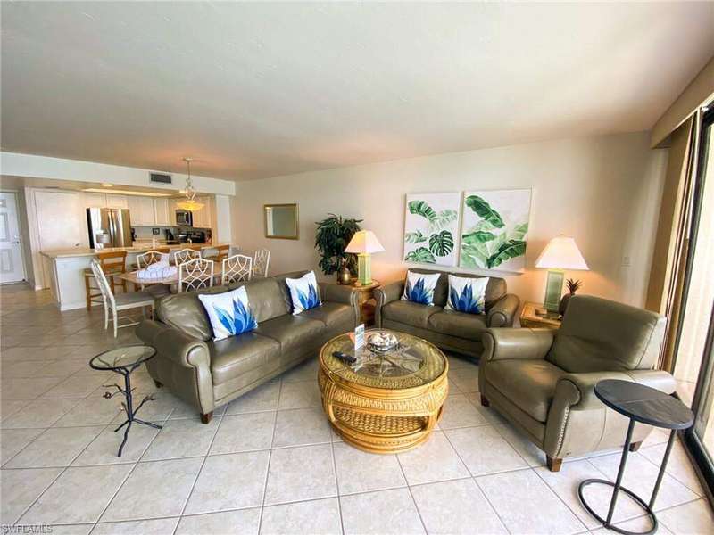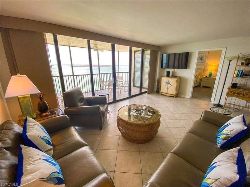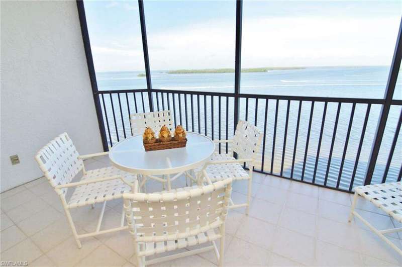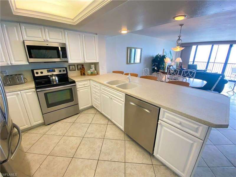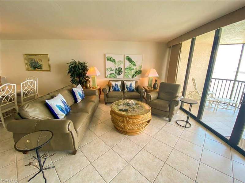 AMAZING SUNSETS from this 2 bed/ 2 bath 7th floor BEACHFRONT CONDOMINIUM boasting stunning western views of the Sanibel and intercoastal waterway. Enjoy SWFL living at it's best on your screened in lanai watching the dolphins play and birds soar while dining al fresca or relaxing with a good book in the coastal breezes from the Gulf. The kitchen is light and bright with white cabinetry and stainless steel appliances, flowing into a large open living room with a wall of sliding glass doors showcasing the amazing views. Both baths have been updated and feature a coastal vibe. Your primary is spacious with lanai access and ensuite has dual sinks and large walk in shower. Sanibel Harbour Towers offers resort style living with its own beautiful pool and beach or walk next door to the Marriott and enjoy several restaurants and bars! Marriott also offers membership to Sanibel Harbour Towers owners so you can enjoy their Spa & Fitness facilities, Tennis courts and indoor Pool!