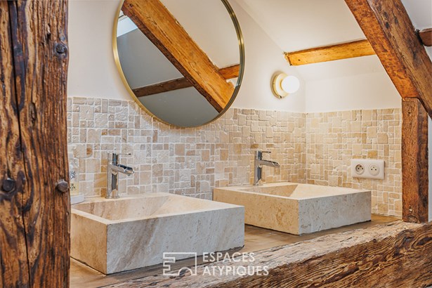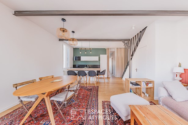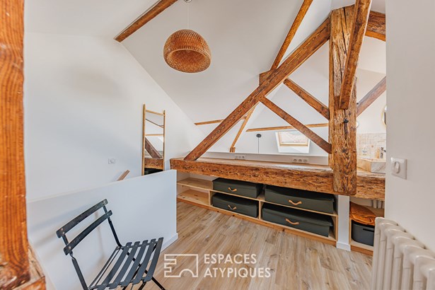 From the entrance, the tone is set: quality materials, meticulous finishes, and a warm atmosphere. The living room benefits from high ceilings and generous light, amplified by cleverly positioned windows. An intimate balcony extends off it, allowing you to enjoy beautiful sunny days. The kitchen, completely redesigned a year ago, combines modernity and functionality in perfect harmony with the rest of the building. A first sleeping area with built-in storage completes this level, as well as a bathroom and a separate toilet.