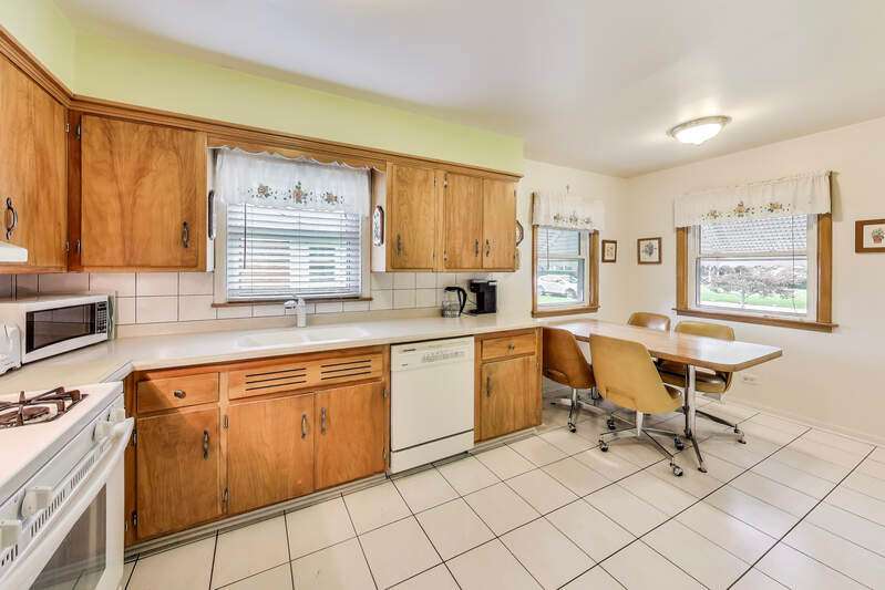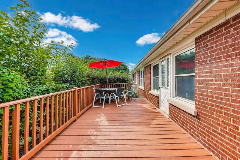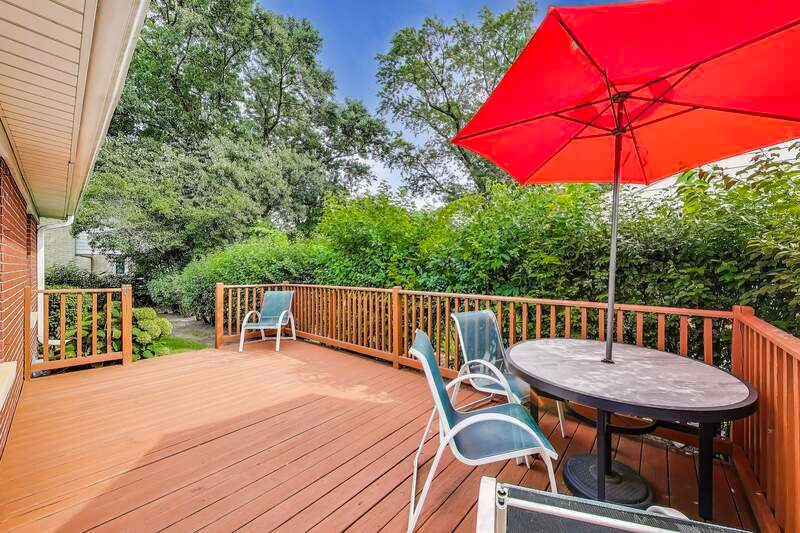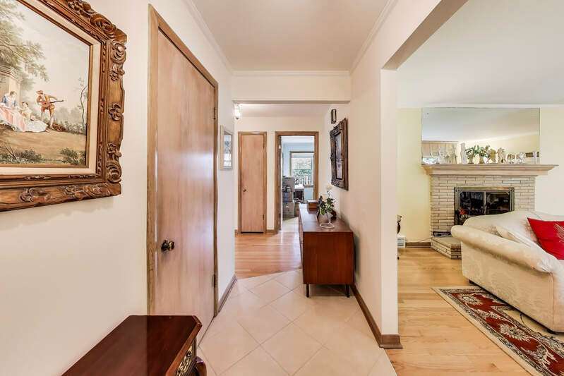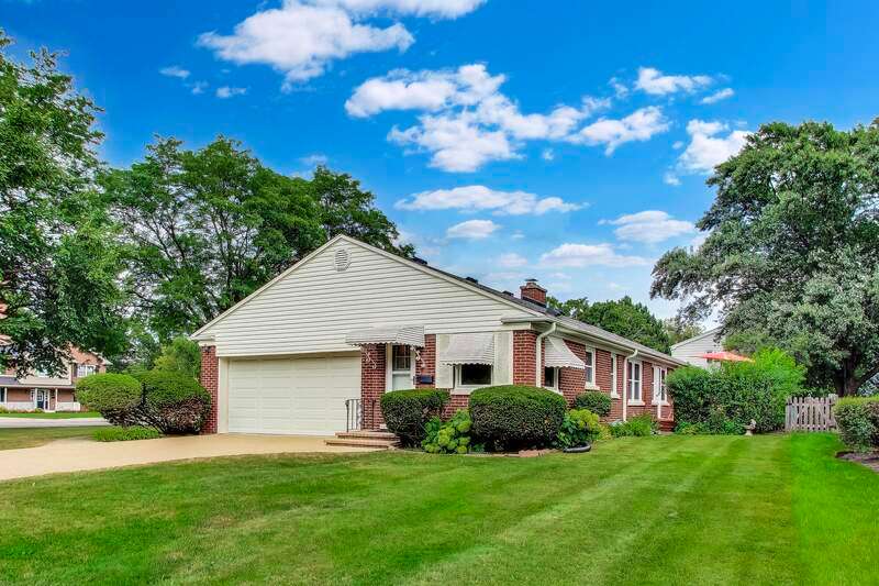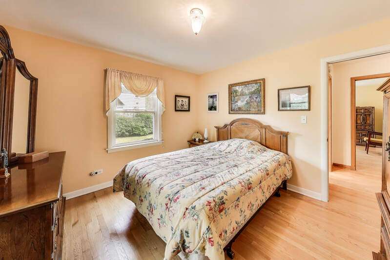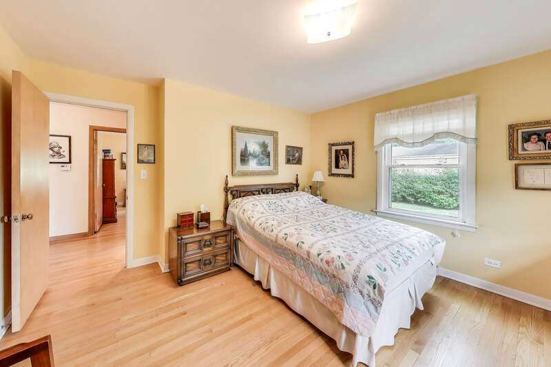 Lovingly maintained by long time owners, this beautifully cared for home offers 3 bedrooms and a rare 2.5 baths. Hardwood floors run throughout the main level, where generously sized rooms provide versatile living options. The spacious foyer opens into a welcoming living room featuring a stone wood-burning fireplace and a large picture window. The current owners have incorporated the dining area into this expansive space, while repurposing the original dining room into a den with built-in shelving and storage. The corner primary bedroom offers dual closets, while the second bedroom also enjoys corner placement with windows on two sides. The third bedroom, currently used as an office, provides direct access to the deck. The centrally located hall bath includes a tub/shower combination. The kitchen is thoughtfully designed with direct access outdoors, basement and to the fully finished two-car garage, complete with epoxy flooring. There's ample cabinets, a pantry closet, and a cozy nook for casual dining. The finished basement expands the home's living area, featuring a vintage dry bar, a spacious recreation room with built-in shelving, and a full bath with shower. The bonus room is ideal for a playroom, office or gym and has a large closet which is ideal for a wine cellar. The mechanical/storage room houses newer HVAC and has ample storage. The home also has newer windows and roof. The large laundry room with double utility sink completes the lower level. A short distance to the Glenview Metra stop and The Glen Town Center.