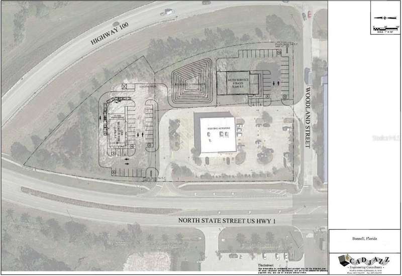 Five parcel assemblage at the junction of N State St (US-1), SR 100 W and E Woodland St. Total of 3.37 acres pad-ready for development with utilities at the site. Conceptual plan for two buildings. 300+ feet of frontage on US-1, 700+ feet of frontage on SR 100 W, 100+ feet of frontage on E Woodland St. Directly adjacent to Advanced Auto Parts and across from O'Reilly Auto Parts. Zoned City of Bunnell B-1 (Business) which allows retail, service, restaurant, automotive uses, etc. FLDOT AADT 19,600 on US-1 and 10,100 on SR 100W.
