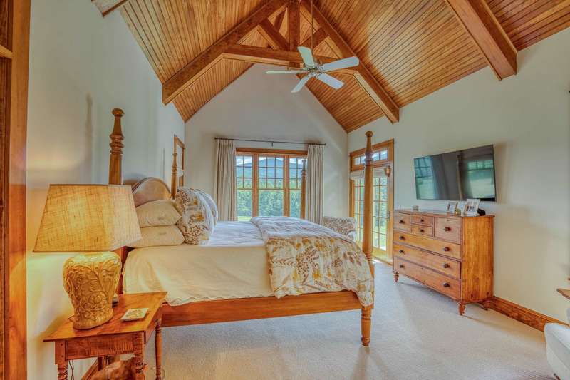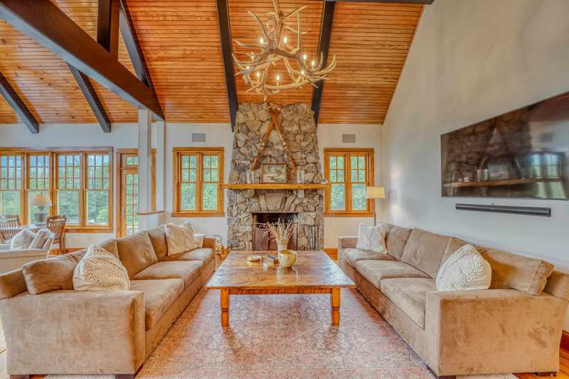 5.57 +/- Acres. A Mountain Home with elegant workmanship without compromise. Stunning views of Lafayette Mtn range and Cannon. Finish appointments of stone, wood and Fir beams all integrating home nicely with natural surroundings. A warm feeling; vaulted ceilings, lots of glass letting sunlight flood rooms and focal to view, pond and lovely outdoor patio. 1st floor appointed with primary suite. Imagine waking to magnificent views and atrium doors leading to private patio. Rounding out 1st floor is guest-ensuite, office, living room, gathering room, large open kitchen & more. Upstairs, 3 guest en-suites, office nook, nursery or "other." Walk-out lower level has ample room for movie night, ping pong, pool table and exercise. Large private pond has brought years of skating memories for this family or enjoy stocking it and fly fish in your own back yard. Property abuts State of NH with trails just out your door. Close to Franconia Village, quick I-93 access, min. to Cannon Mountain and you'll be living nearly IN Franconia Notch-as close to heaven as one can get! Kids in Ski programs? Not a problem getting to the Mtn. early! The private Profile Club across the street. Bethlehem Country Club for golf, the area will afford you miles of biking, hiking, year-round exploring in your back yard! Highly rated schools, warm community of people and a lifestyle most dream of. Come work, live and play with us! OFFERED FURNISHED (less primary suite and personal items).