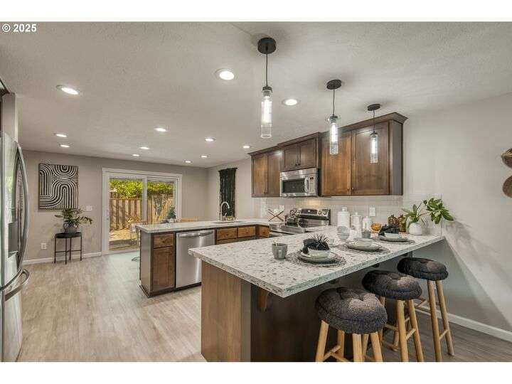 OPEN HOUSE Sat 10/25, Noon-2pm ~ Welcome home! This stunning, turn-key townhome has been remodeled from top to bottom and is just what you’ve been waiting for. Brand-new LVP flooring sprawls throughout the open great room layout, meeting a brilliantly designed kitchen featuring beautiful cabinetry and gorgeous quartz counters. The primary suite boasts double closets, private bath and brand-new luxurious carpet. Two additional large bedrooms lend countless uses and space for everyone. Outside you’ll find your own private, fully fenced, maintenance-free yard with relaxing covered patio surrounded by serene greenspace. Ample parking with your own dedicated carport and additional driveway, plus extensive guest parking throughout the neighborhood. Resort-style community completes this home with clubhouse, multiple swimming pools, community gardens and wonderful neighbors. Convenient location near shopping, transit and neighborhood parks, plus it’s just a short stroll to downtown Beaverton. Immaculate condition, move-in ready. Don't let this one slip away!