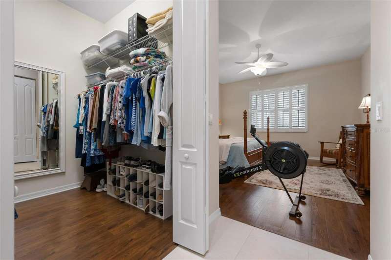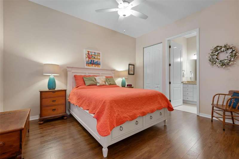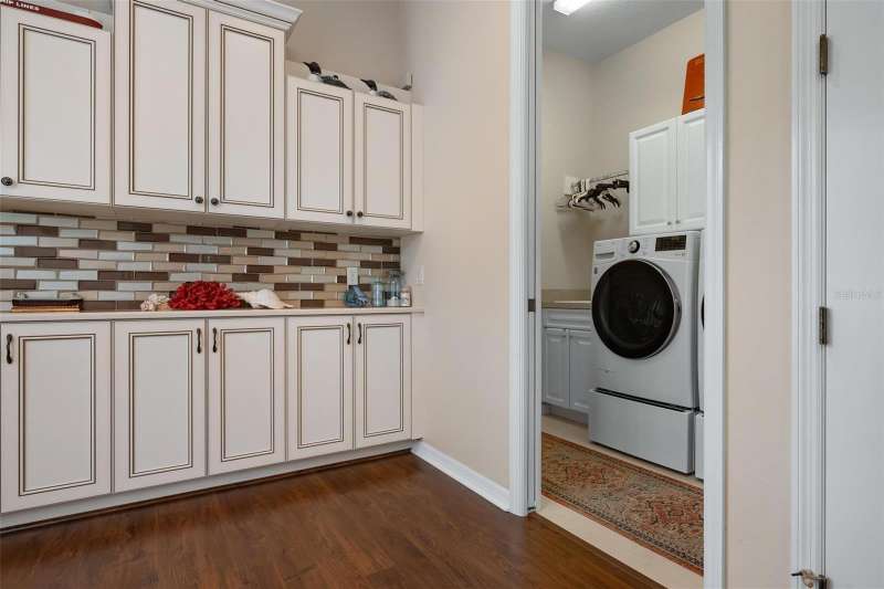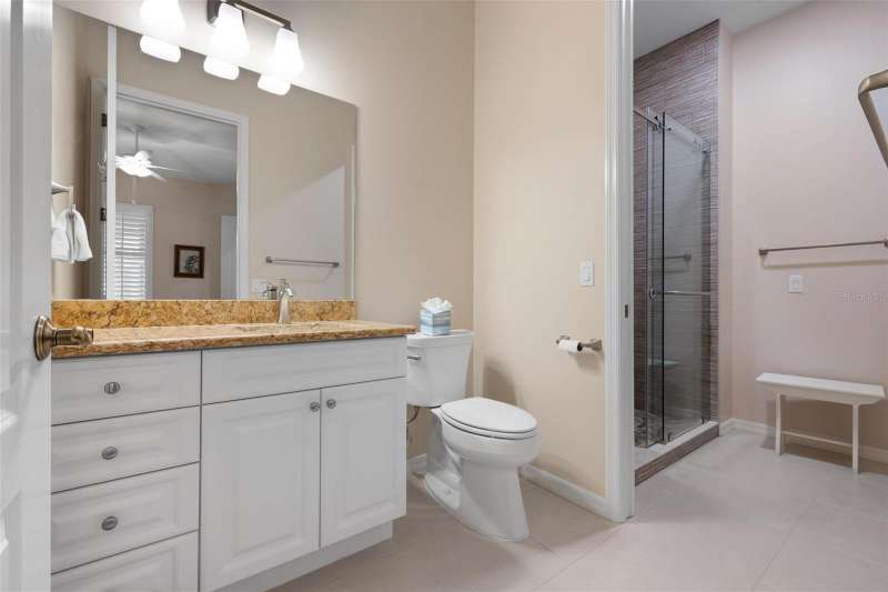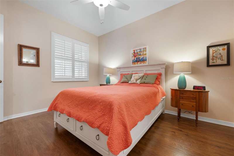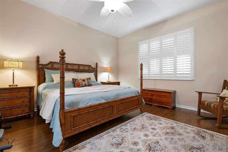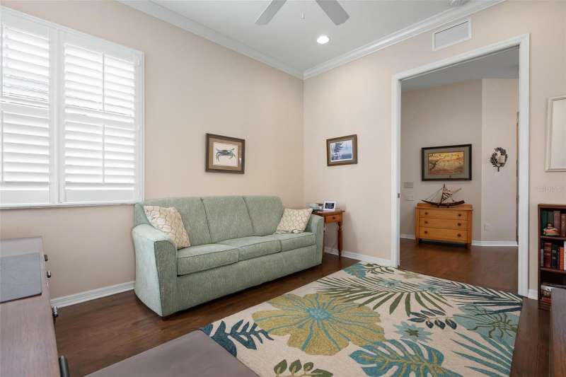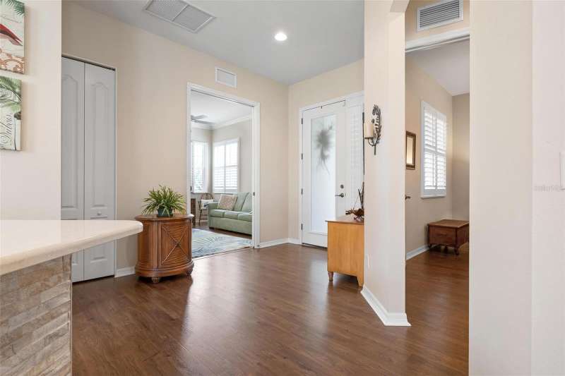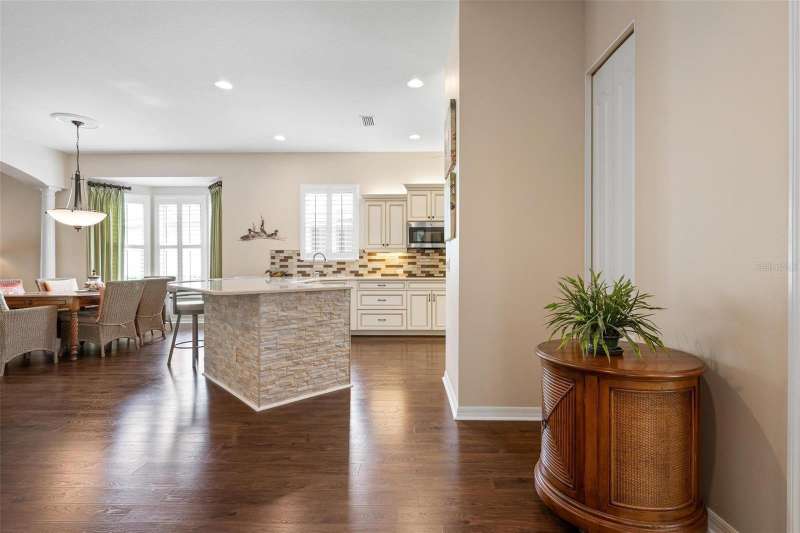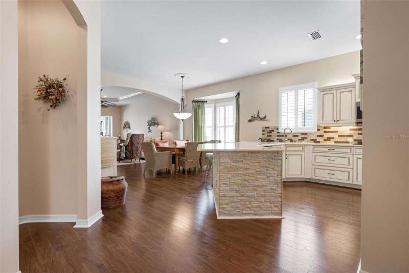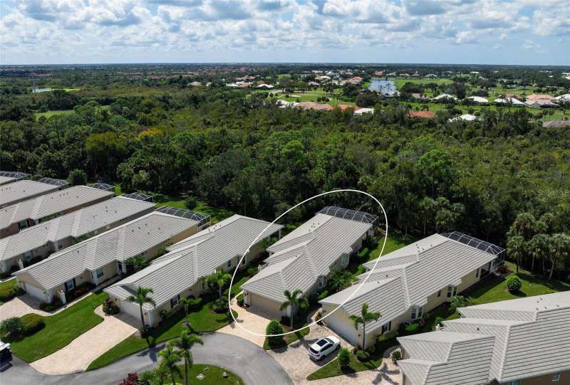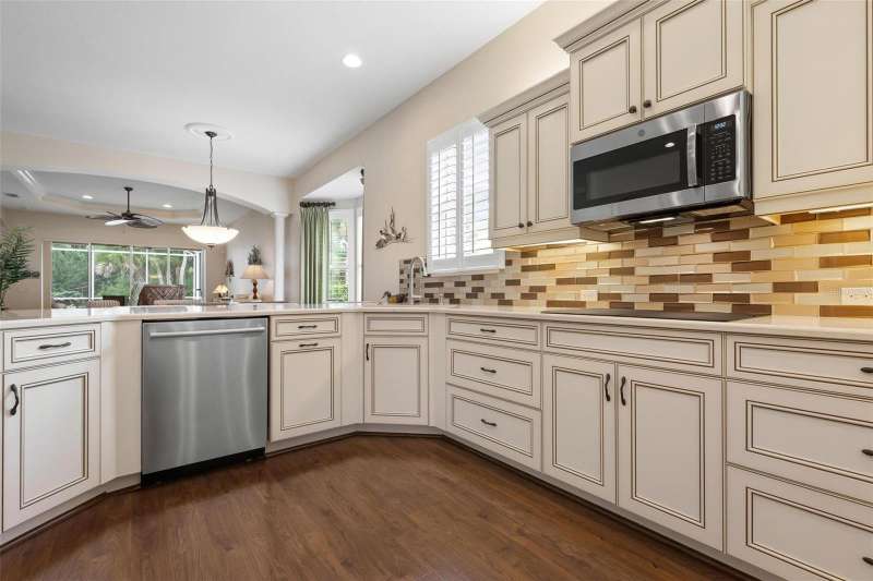 Privacy meets Convenience in this Hidden Retreat. Beautifully cared for and maintenance free, this home is ideally positioned near the end of a quiet cul-de-sac in the enclave of St. Andrews East at Plantation Golf & Country Club. Designed with a sunlit open layout and coveted southern exposure, the residence offers a seamless blend of elegance and comfort. The kitchen is a showpiece with canvas-toned cabinetry accented by cocoa highlights, quartz countertops, multiple deep drawer banks, glass tile backsplash, under-cabinet lighting, granite sink, and stainless steel appliances including a double wall oven and induction cooktop. The expansive great room impresses with a trayed ceiling, crown molding, 8-foot interior doors, and plantation shutters, all leading to a wall of sliders that open to the generous lanai and pool. A covered outdoor living area overlooks the extremely private heated saltwater pool and the lush Florida landscape beyond. The luxurious primary suite features dual walk-in closets and a spa-inspired ensuite bath with dual sinks and a curbless walk-in shower. This residence is equipped with excellent storm protection, including impact-resistant windows, accordion shutters, and a security system. Additional highlights include a finished garage, extra laundry cabinetry, and a whole-home water filtration system. For those seeking an active lifestyle, the Plantation Golf & Country Club offers two championship golf courses, pickleball, tennis, a resort pool with a cabana bar, a fitness center, and a variety of dining options, all supported by a vibrant social calendar. Optional memberships are available. Conveniently located just 15 minutes from Gulf beaches, historic downtown Venice, downtown Wellen Park, and abundant shopping and dining, this home perfectly combines privacy, style, and convenience.