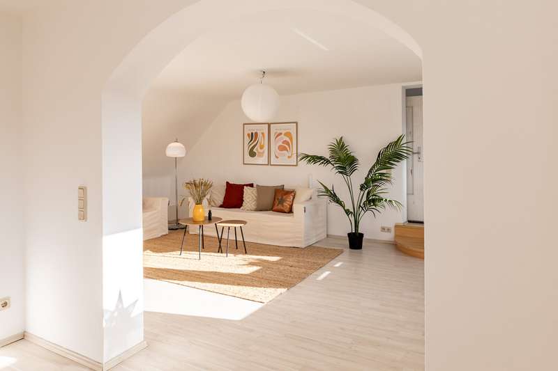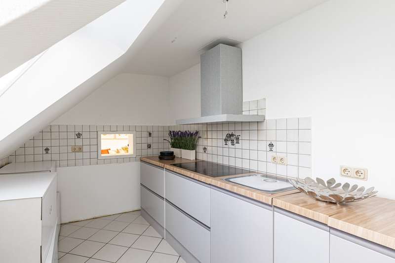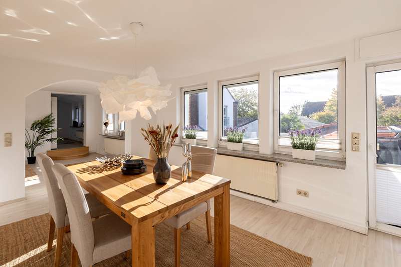 This cleverly designed, very charming condominium is located on the 1st floor of a well-kept, small condominium with 8 parties in a popular location in the south of Neuss. It offers a separate entrance and conveys the feeling of living in a "house within a house". The quiet residential area offers first-class connections to Neuss, Düsseldorf and Cologne. The house was originally built around 1940 and was completely renovated and extended between 1995 and 1997. The cellar, garage and the living areas on the upper floor are accessible from the separate entrance to the apartment. The approx. 139 m² of living space is optimally distributed over the 5 rooms. The apartment is divided into a parents' and a children's area, which are connected by the living/dining room and kitchen. The living room is connected to the dining room via a charming arched passageway. The dining room and a children's room give access to the extremely spacious roof terrace. A fantastic place for breakfast or to enjoy the evening! An open kitchen can probably be created with little effort. On the parents' side, there is a bedroom, hallway/study and a large daylight bathroom with bath, shower, washbasin, WC, bidet and urinal. The children's area offers two bright children's rooms with their own shower room. The small laundry room can also be found here. On the first floor, the entrance hall provides direct access to the garage (with plenty of storage space) and to the large, private vaulted cellar, which is only used by this residential unit. The garage has its own land register and can also be purchased for 10,000 euros. Don't hesitate to arrange a viewing appointment with us, we look forward to seeing you!