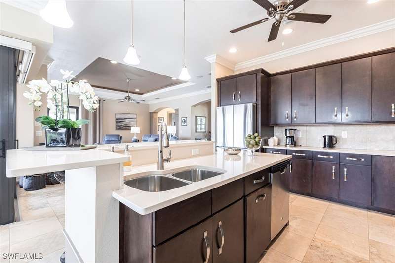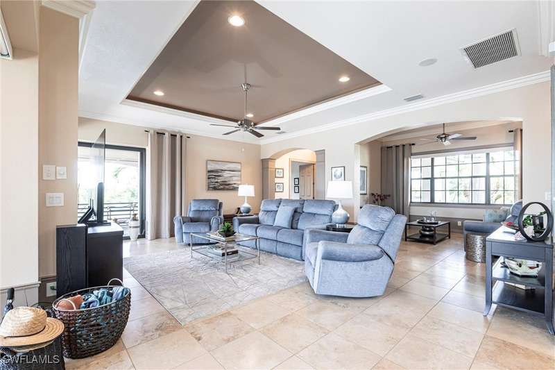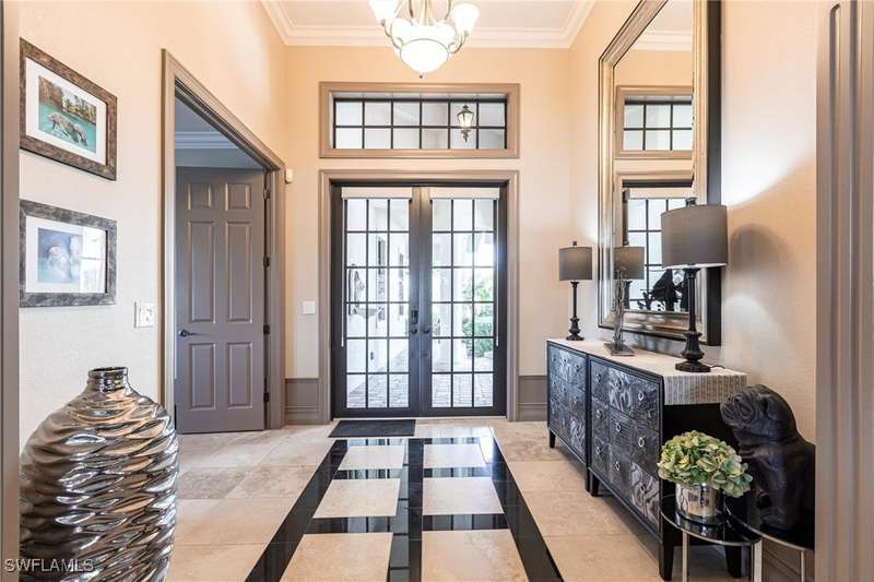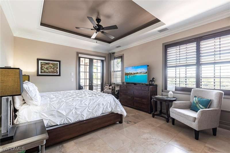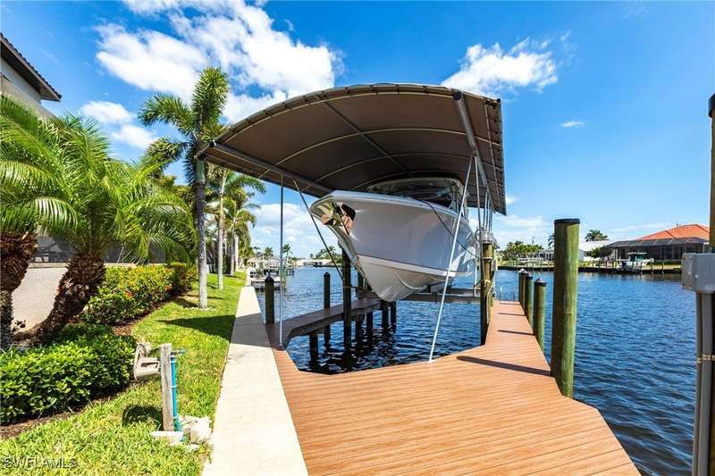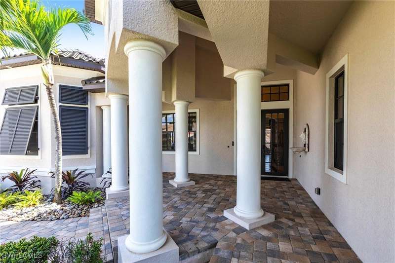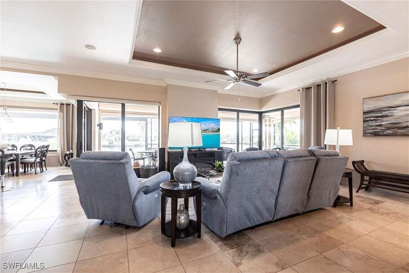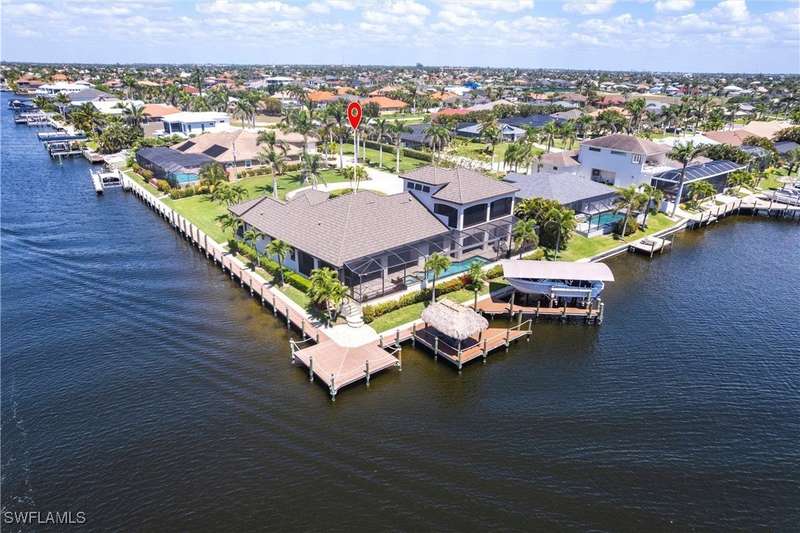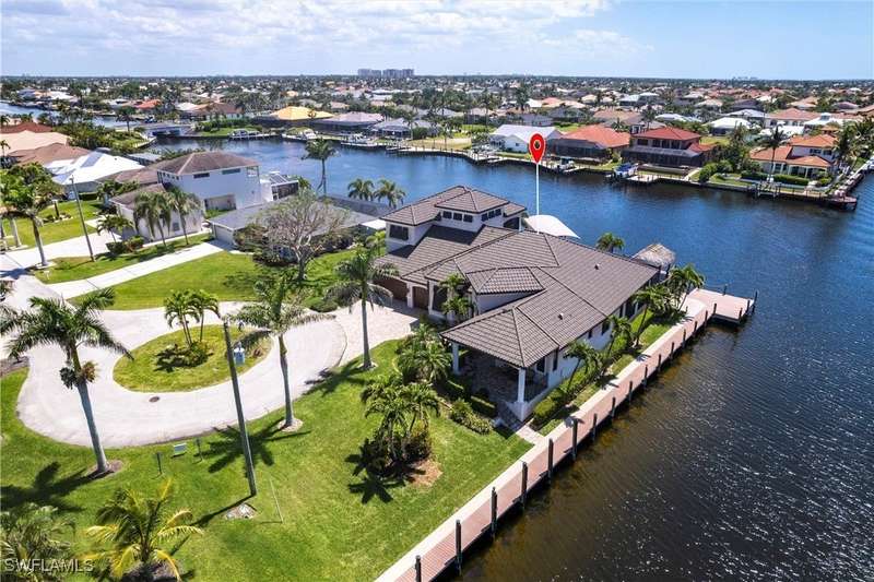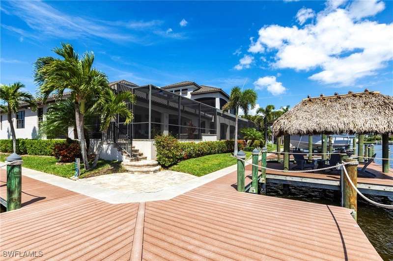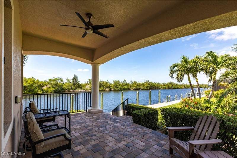 Introducing a truly unique, custom-built two-story home situated on an oversized corner lot with direct Gulf access, offering rear Southern and Western exposure. Nestled at the end of a peaceful cul-de-sac, this exceptional property boasts breathtaking preserve views at the junction of Southern Spreader and the 250-foot wide Maxwell Canal. From the moment you step inside, you'll experience a sense of tranquility in this expansive and luxurious home. With 4 spacious bedrooms and 4 beautifully appointed baths, this residence features multiple indoor and outdoor seating areas, each offering stunning water views. Every corner of this home is thoughtfully designed, from the impressive staircase to the travertine floors with intricate inlays, impact-resistant windows, and a chef-inspired kitchen. The oversized laundry room is bathed in natural light, and the large 3-car garage offers ample space for storage and convenience. This home is equipped with electric fabric hurricane shutters that also serve as sun blinds and windbreakers, providing both safety and comfort. The electric heated pool and spa, along with the expansive screened-in deck area complete with a mosquito control system, create the perfect environment for outdoor relaxation. With over 280 feet of waterfront, including a long captain's walk, a boat dock designed for sailboats, and a deck ideal for watching stunning sunsets, this property is a boater's dream. Offered turnkey, this home is ready for you to move in and start enjoying right away. Recent upgrades include a new AC system, a durable metal roof, a new heater, storm shutters, and a boat dock with a Tiki hut and captain's walk. Schedule your private showing today to see all that this extraordinary home has to offer.