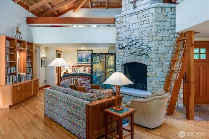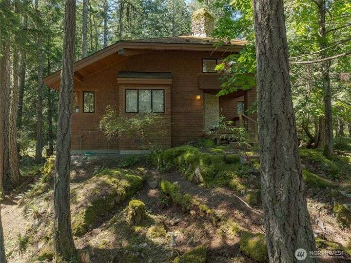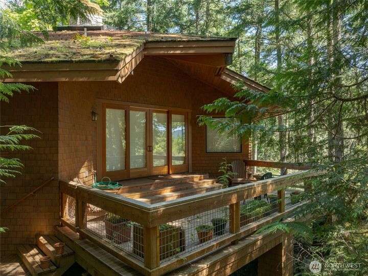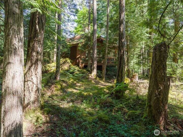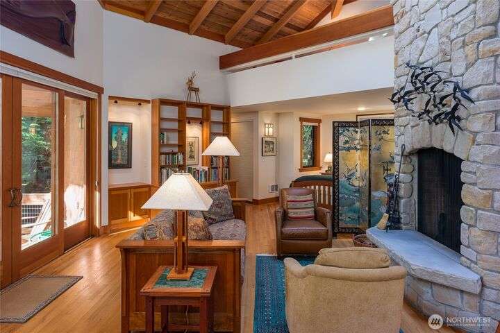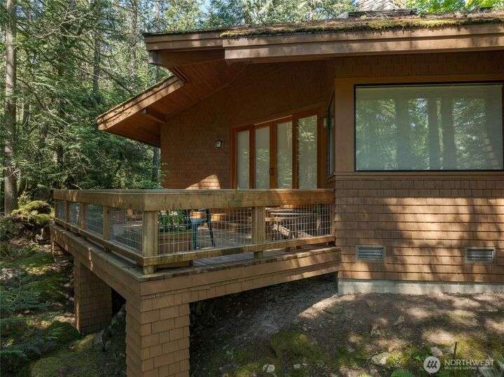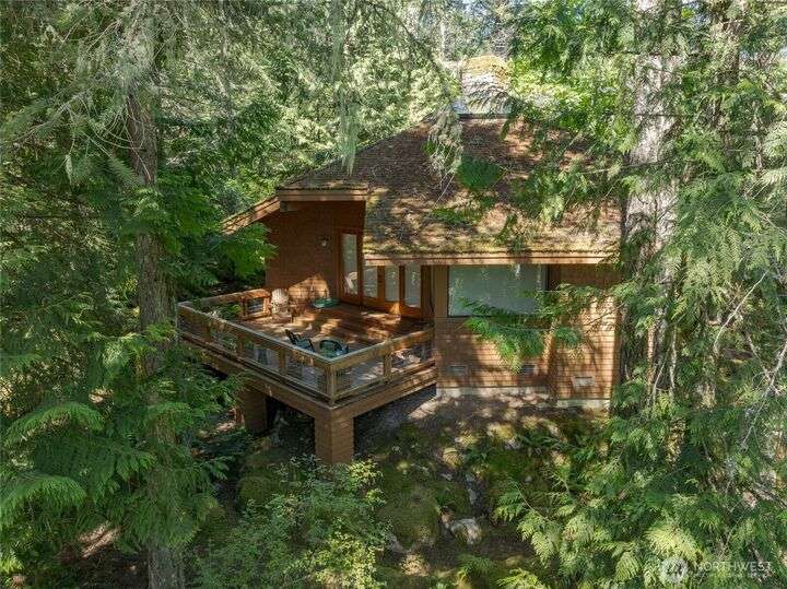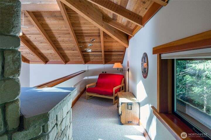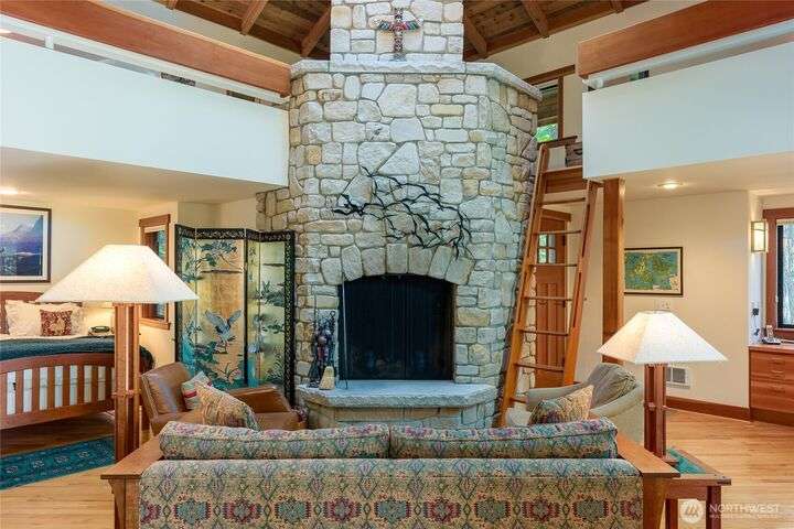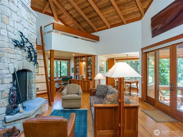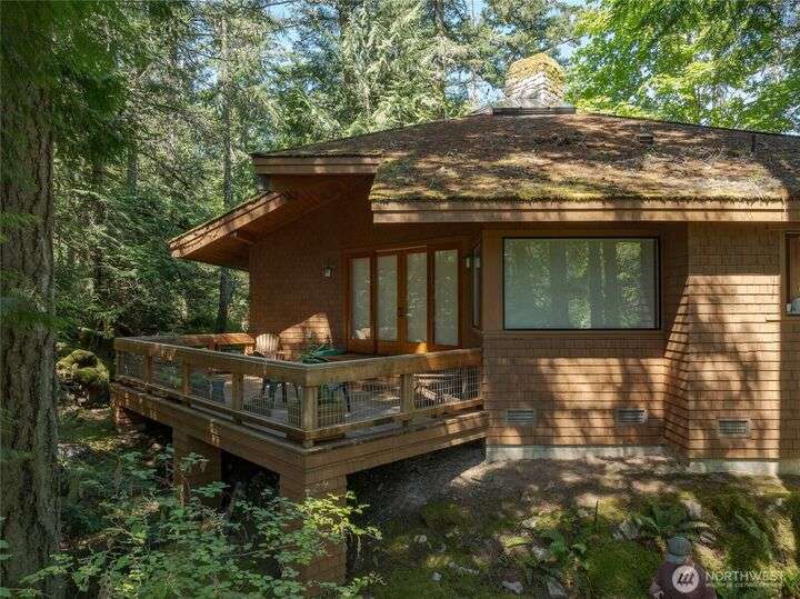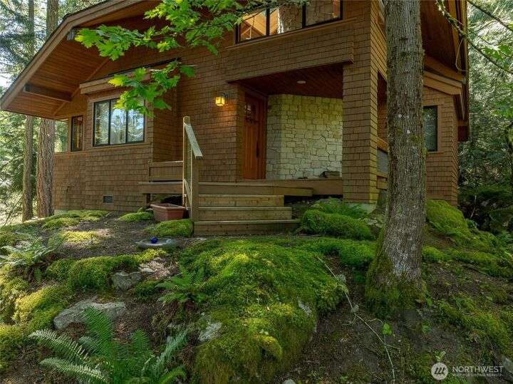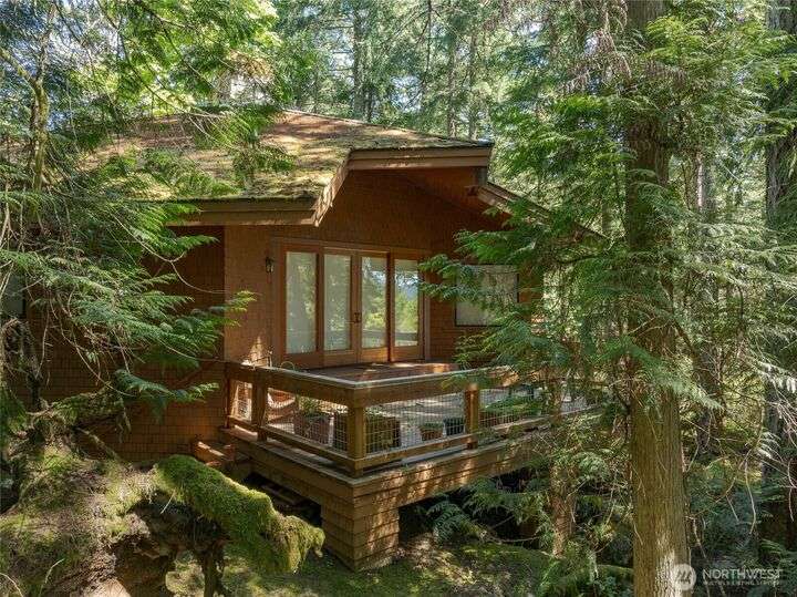 Secluded retreat on 5 acres. Craftsman cottage designed by architect Roy Lundgren and built by Delgarno Construction. House has been a loved family retreat since built in 1997. The centerpiece of the home is a masterful white stone fireplace that reaches from the ground floor through the upper lofts, and is incorporated into the entry. The efficient layout includes a kitchen, a dining area, a living space, an office, a sleeping area, ample closet, bathroom and loft. A large deck ties the home to the property. A finished basement with laundry is accessed from outside and allows for additional use. Five wooded acres surround this home with maple and firs. Privacy and luxury make this the perfect island getaway.