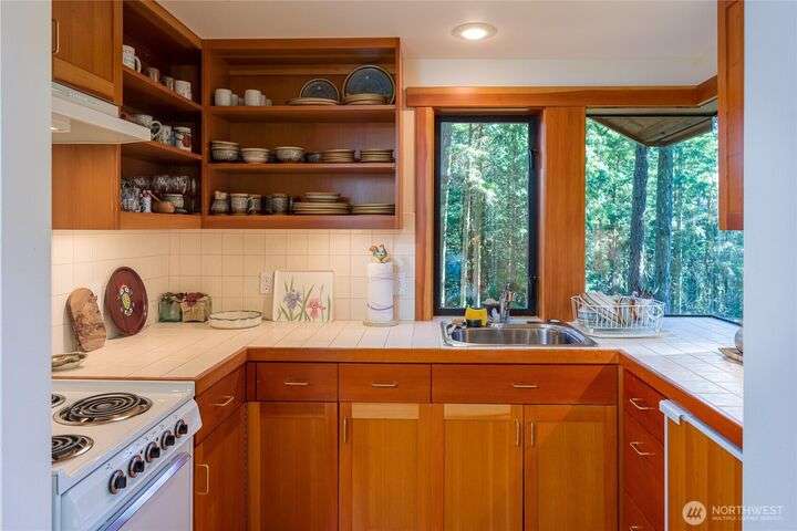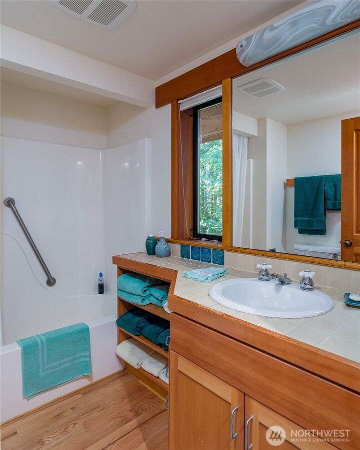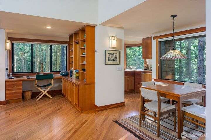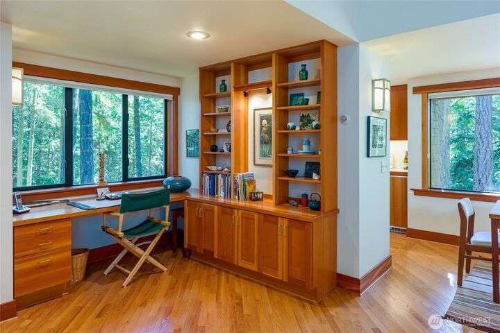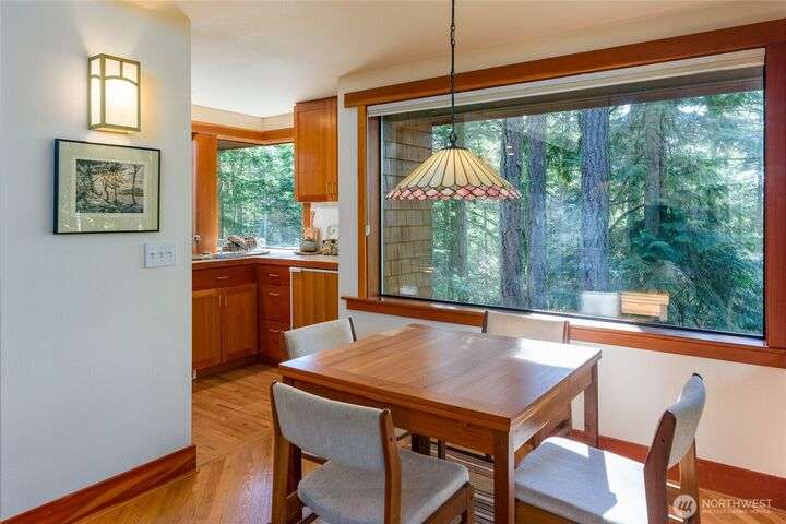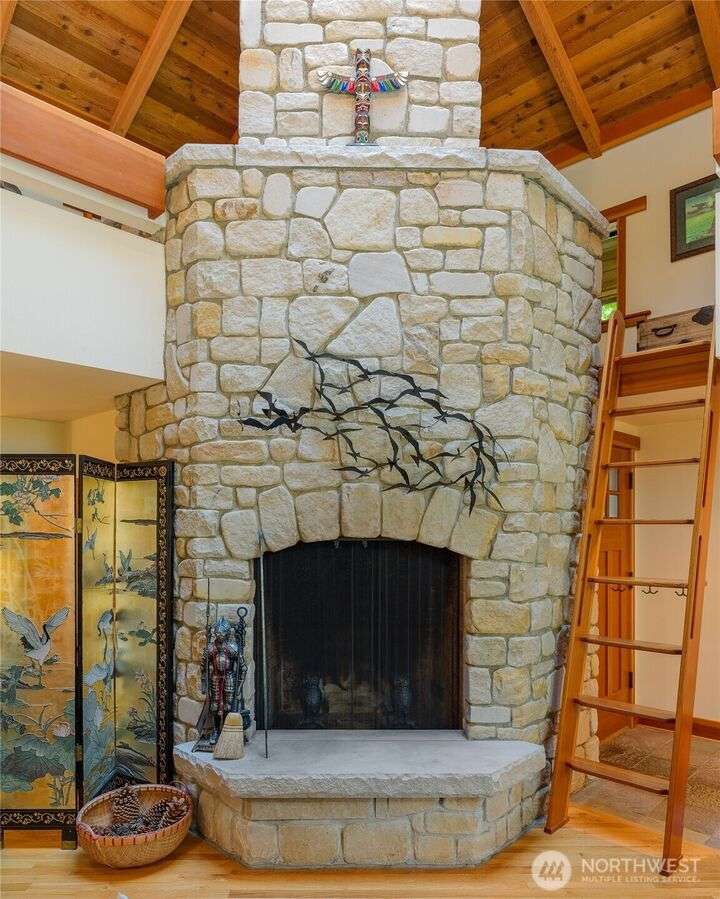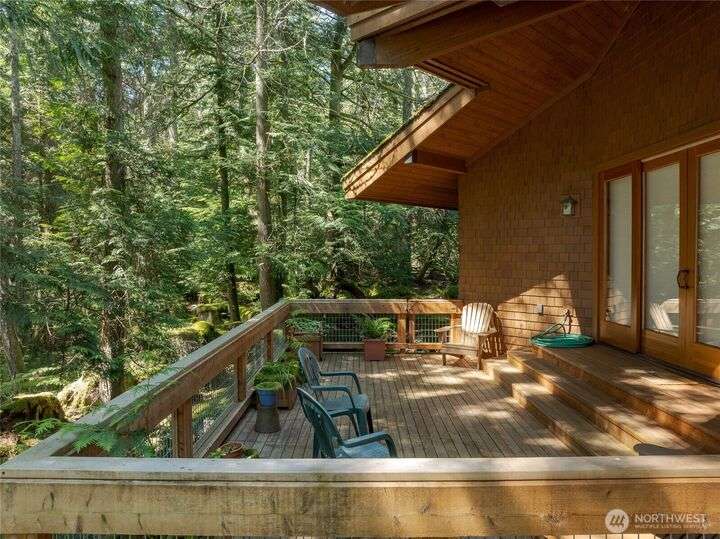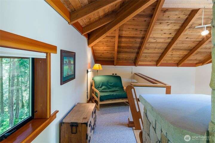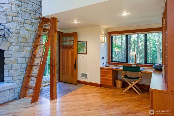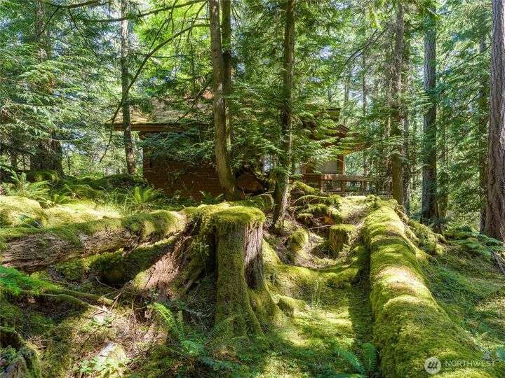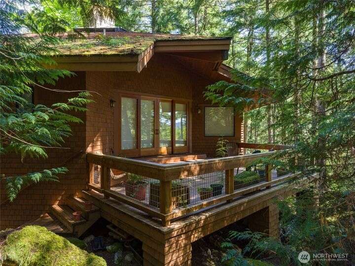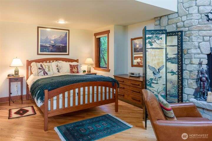 Secluded retreat on 5 acres. Craftsman cottage designed by architect Roy Lundgren and built by Delgarno Construction. House has been a loved family retreat since built in 1997. The centerpiece of the home is a masterful white stone fireplace that reaches from the ground floor through the upper lofts, and is incorporated into the entry. The efficient layout includes a kitchen, a dining area, a living space, an office, a sleeping area, ample closet, bathroom and loft. A large deck ties the home to the property. A finished basement with laundry is accessed from outside and allows for additional use. Five wooded acres surround this home with maple and firs. Privacy and luxury make this the perfect island getaway.