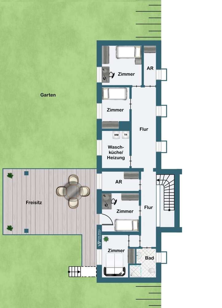 The Fern-Seh-Haus Individuality and spectacular views! An exciting property with plenty of space for the whole family. This impressive property in Essen Kupferdreh was built in 1956 in a cubic architectural style and will delight you with its individuality and phenomenal views over the Ruhr Valley. Known in Kupferdreh as the "TV house", the property is located in a quiet residential area on a slight slope, is surrounded by greenery and offers you plenty of privacy. On two floors with a total living space of approx. 188m², the unusual architectural style and the resulting special room layout give you many possibilities to design your home absolutely individually. A beautifully overgrown driveway from the main road leads to the forecourt of the house, where there is a large double garage. The house entrance with its wide glass front is very inviting and allows plenty of light into the large hallway, which you can use as a central room in many different ways. Create your dining area here or extend the room into the living room with very little effort. To the left are the guest WC, checkroom and kitchen with adjoining pantry, straight ahead leads you to the highlight of the house. Here, the "free-floating" living room with a window front spanning the entire width of the house is located in a structure that projects far forward. From here you can enjoy an unobstructed distant view and create your own feel-good area over an area of approx. 35 m². You will find a visualization proposal for the furnishings in this exposé. You can also enjoy the sun on this level of the house, as the living room leads out onto a small balcony with an awning and a staircase to the garden, which you can of course also reach via other entrances. A bedroom, a bathroom and a study are also located on the right-hand side of the upper floor, which measures approx. 124 m² in total. The basement has approx. 64 m² of living space and offers four rooms, including one room with access to the garden and patio, a shower room, two storage rooms and a boiler room with laundry room. The rooms can be used flexibly as a study or bedroom as well as a guest or hobby room. A solar system on the roof provides you with hot water and an alarm system reliably ensures your security. The property is in good condition, but requires extensive modernization (e.g. bathrooms, heating, floors) and thus offers you the opportunity to implement your individual wishes. Design this extraordinary house according to your ideas and make it your feel-good home. The architectural style, location, views and the beautiful garden with its special trees and plants, a covered terrace and a lawn with plenty of space to relax and play will delight your family. Would you like more space? The living space could be extended by adding another storey and a roof terrace with spectacular views. If we have piqued your interest, we will be happy to provide you with further information and arrange a viewing. We look forward to seeing you!