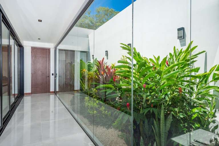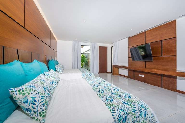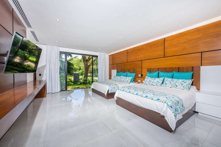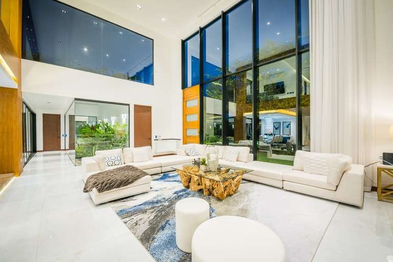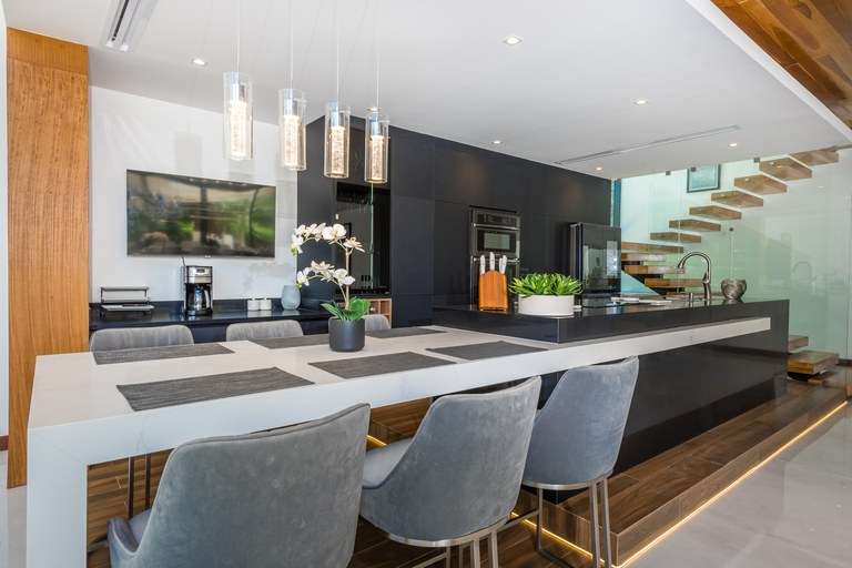 The home welcomes you through a striking 12-foot custom teak swing door into a grand 24-foot double-height living room, where a custom-made sectional comfortably seats 18 guests. Expansive floor-to-ceiling glass doors open effortlessly to a spacious terrace, creating a seamless transition between the interior and the lush tropical surroundings. The elevated dining room glows with floor lighting and a dazzling crystal chandelier, setting the mood for intimate dinners or lively entertaining.