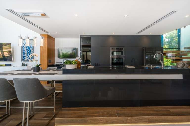 The kitchen is a true showpiece, with bold black cabinetry accented by rich teak finishes and equipped with high-end Samsung Bespoke appliances. Programmable Wi-Fi thermostats allow you to control the temperature in each room independently, while warm wood elements throughout the home provide balance and natural elegance.