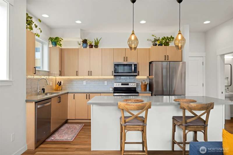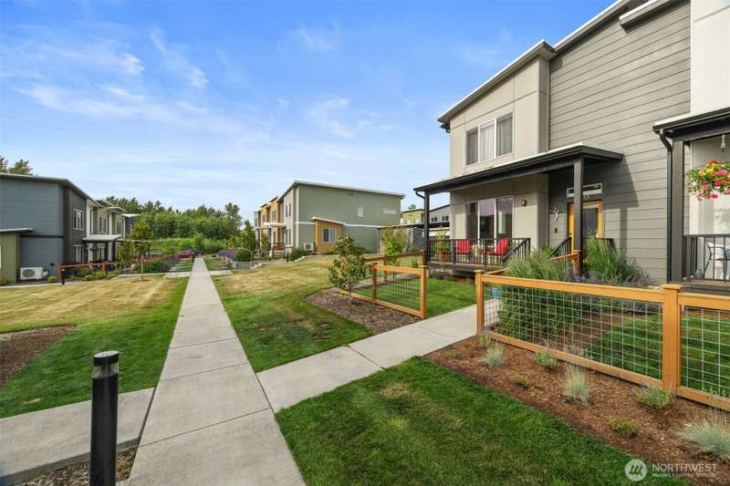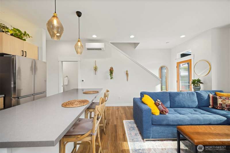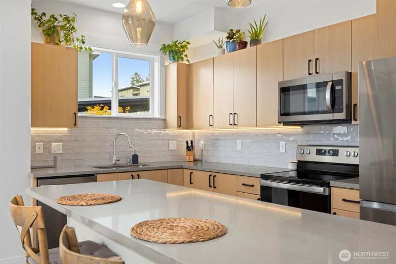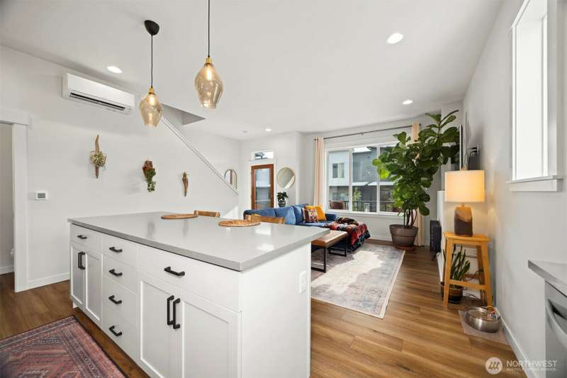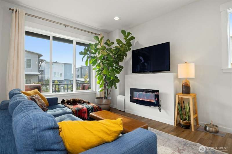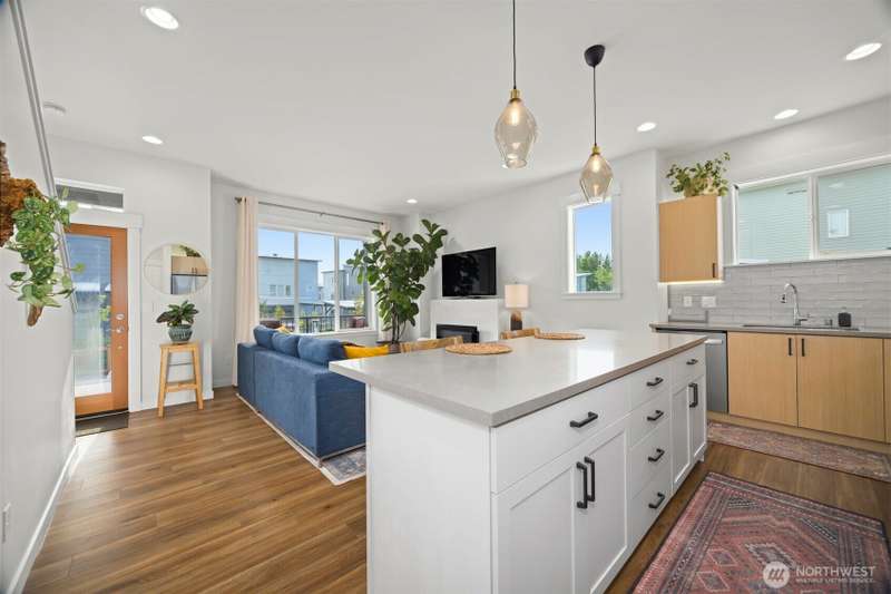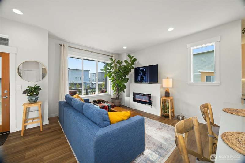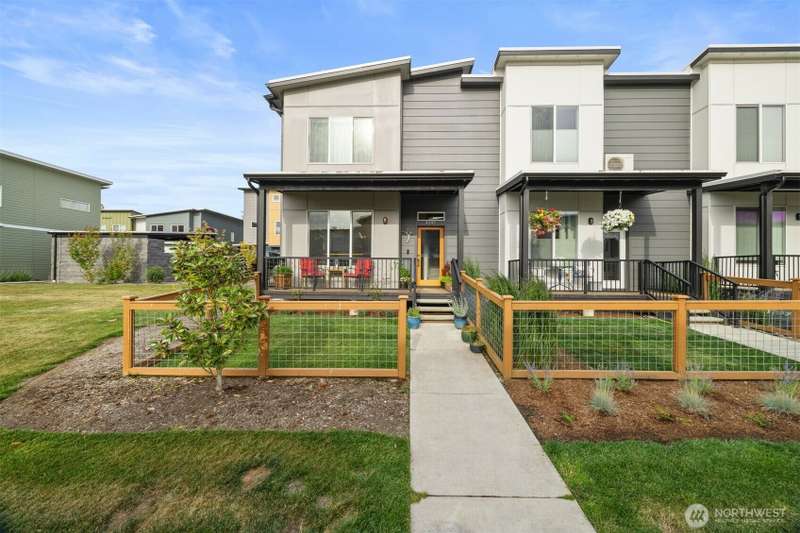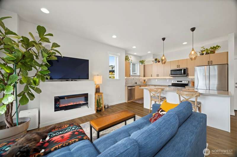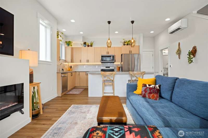 Sleek NW contemporary style meets everyday comfort in this energy-efficient end-unit townhome. Open-concept great room features 9’ ceilings, LVP flooring, & modern kitchen w/quartz counters, two-tone cabinetry, & eat-in bar. Luxe primary suite boasts a spa-like bath w/laundry nearby. 2nd bedroom & full bath perfect for guests! Stay cozy year-round w/high-efficiency mini-split system & 80-gal hybrid heat pump H2O heater. Enjoy the warmth of a fireplace, sip coffee on your charming front porch, or step into the green space just outside your door. 2-car garage adds convenience, all minutes from I-5, shopping, restaurants & trails