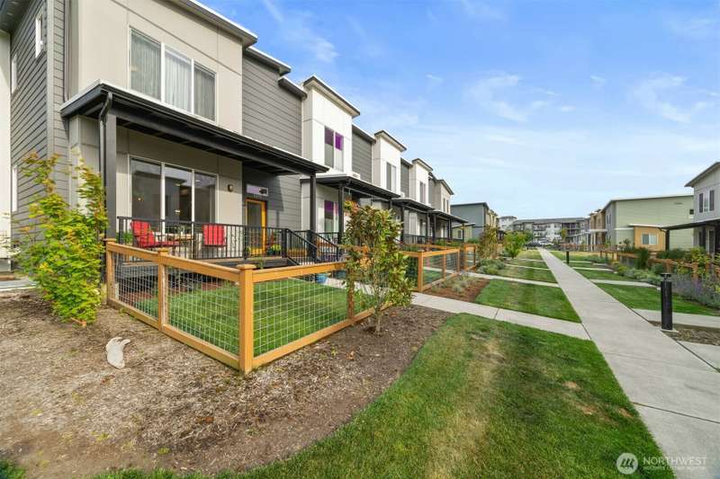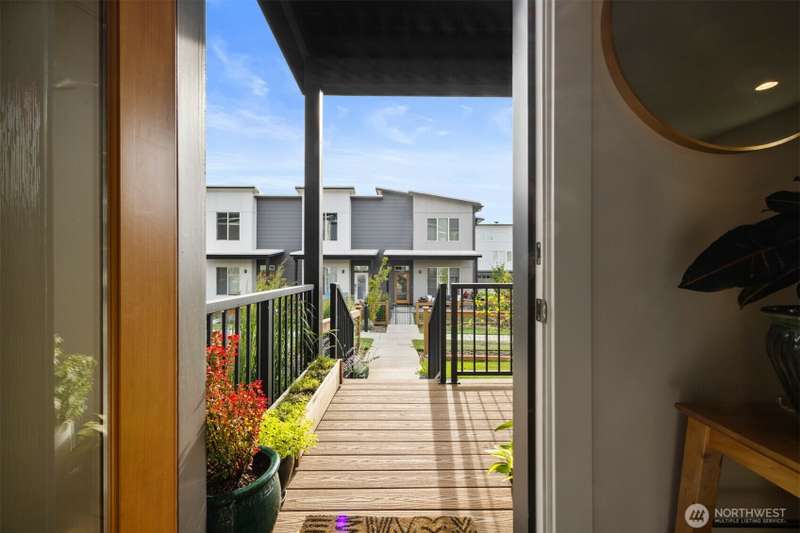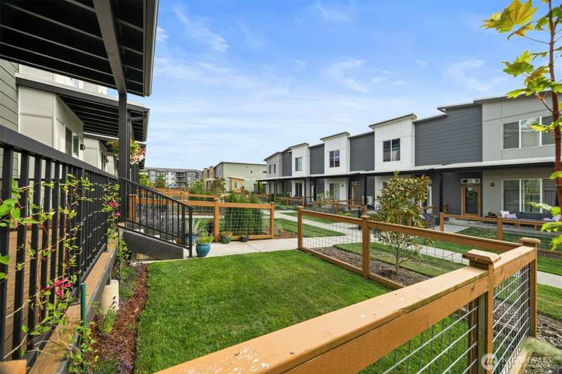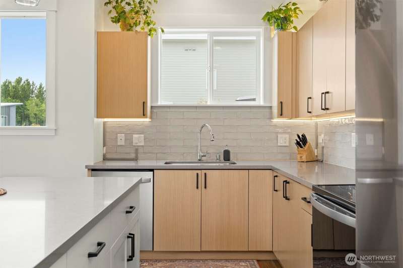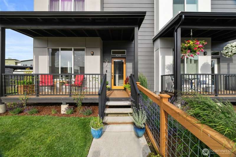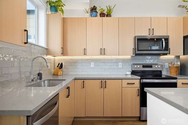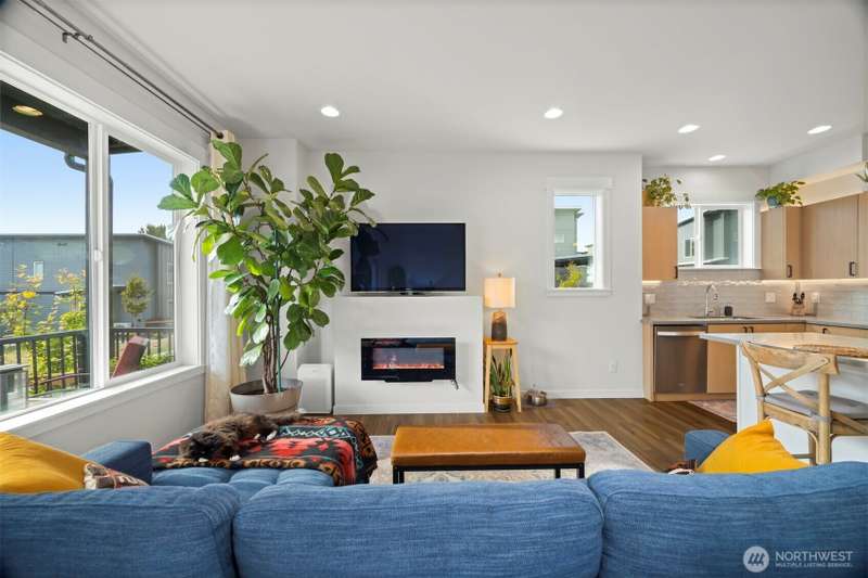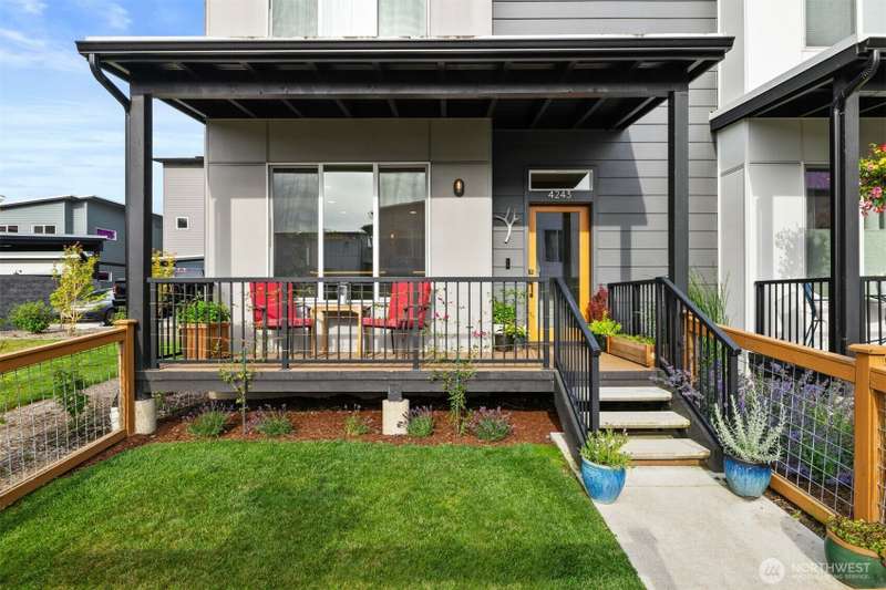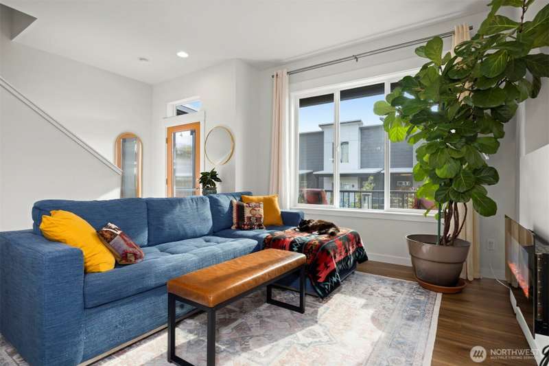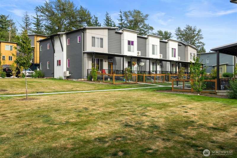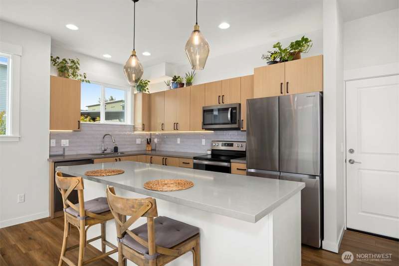 Sleek NW contemporary style meets everyday comfort in this energy-efficient end-unit townhome. Open-concept great room features 9’ ceilings, LVP flooring, & modern kitchen w/quartz counters, two-tone cabinetry, & eat-in bar. Luxe primary suite boasts a spa-like bath w/laundry nearby. 2nd bedroom & full bath perfect for guests! Stay cozy year-round w/high-efficiency mini-split system & 80-gal hybrid heat pump H2O heater. Enjoy the warmth of a fireplace, sip coffee on your charming front porch, or step into the green space just outside your door. 2-car garage adds convenience, all minutes from I-5, shopping, restaurants & trails