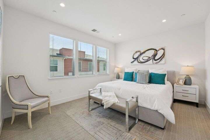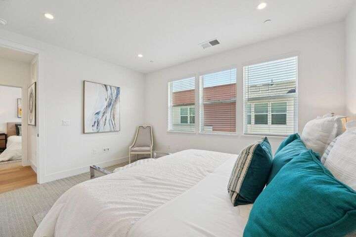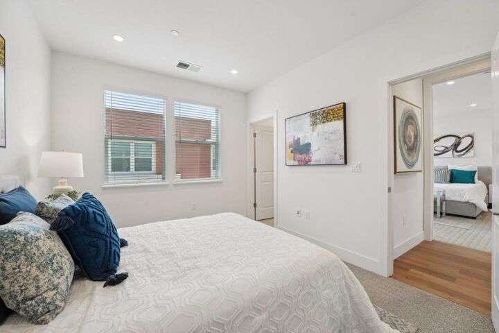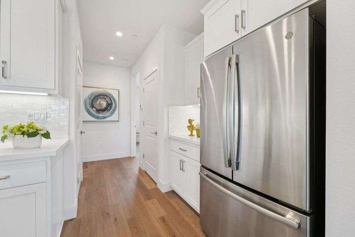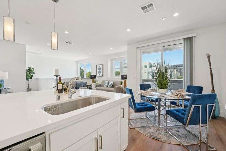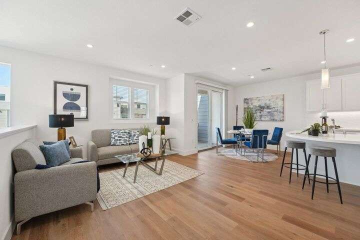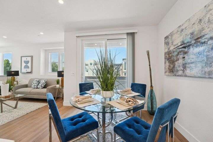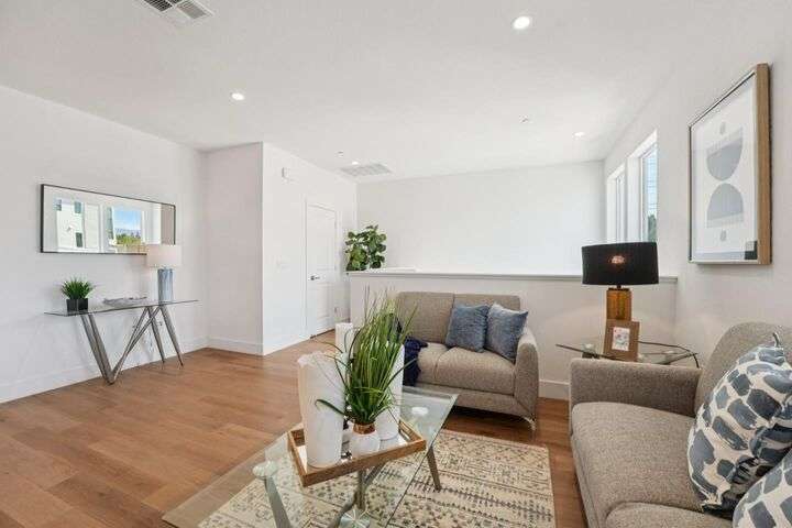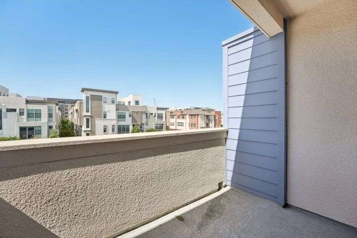 Welcome to this stunning newer-construction top-level condo, offering two private bedroom suites plus a powder room. Bright and airy with abundant natural light, the home showcases an inviting open-concept design featuring a spacious great room, engineered wood floors, and a gourmet kitchen with a large island, quartz countertops, white cabinetry, and GE stainless steel appliances. Enjoy seamless indoor-outdoor living with a balcony off the main living area and open park space outside the front door. EV charging in the 2 car side by side garage. We Located in a vibrant new urban town, residents enjoy 3 acres of parks, a community garden, basketball court, playground, and picnic area. Perfectly situated for convenience, the community is just within a short walking distance from Costco and with an easy commute to Apple, LinkedIn, Nvidia, Facebook, Google, etc and CalTrain station. This home blends modern luxury, effortless style, and unbeatable convenience.