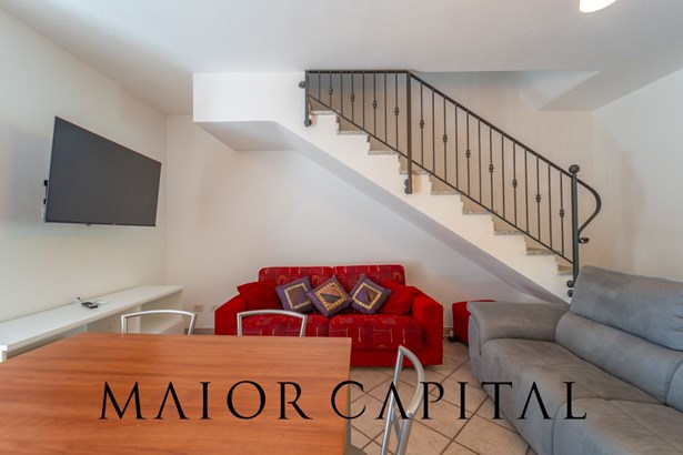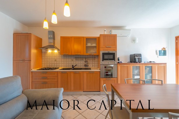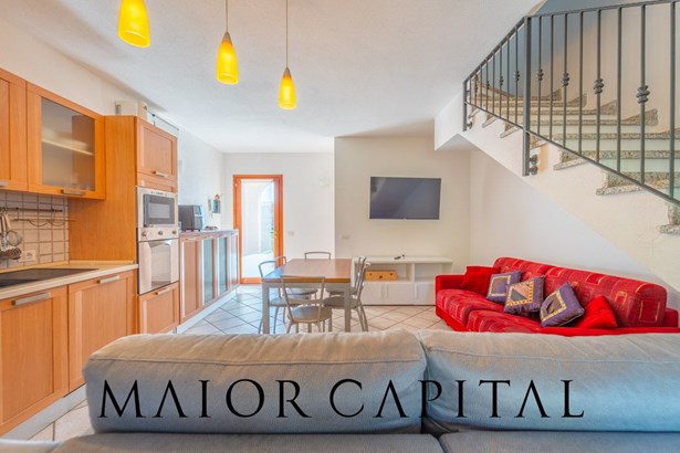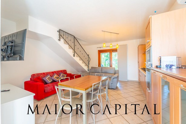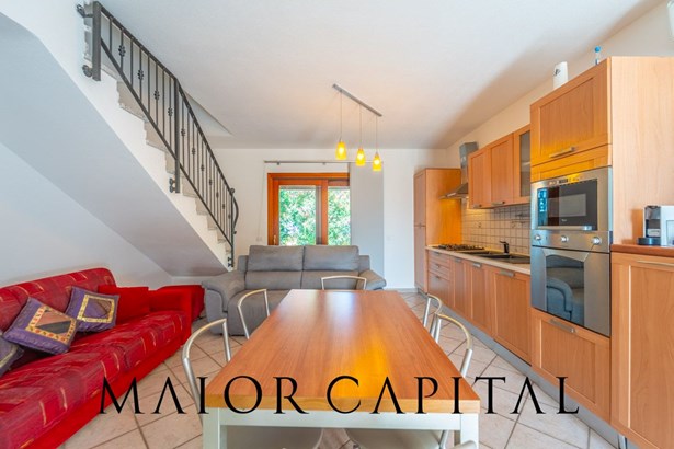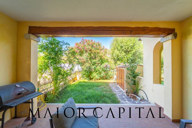 The pedestrian entrance leads to the paved front courtyard, a functional space that accompanies you inside the house. On the ground floor is a bright living room with an open kitchen and custom-made wooden furnishings that give character to the room and make the dwelling suitable for everyday life. At the back, the private garden guarantees privacy and tranquillity, with a covered veranda furnished as an outdoor sitting area, perfect for enjoying moments of relaxation surrounded by greenery.