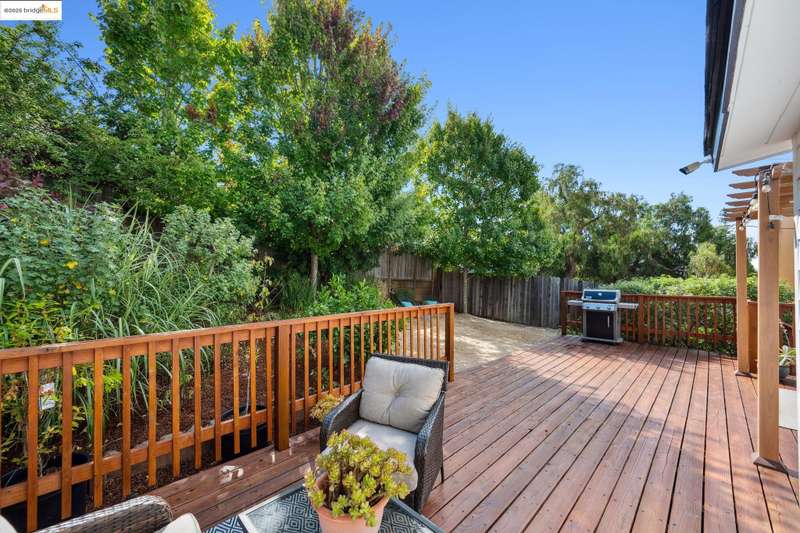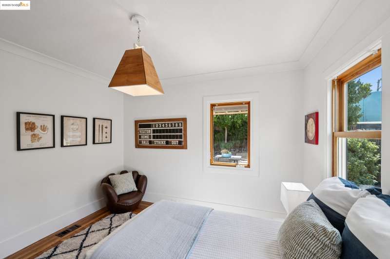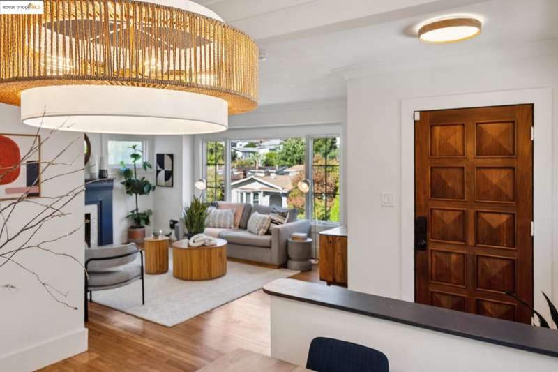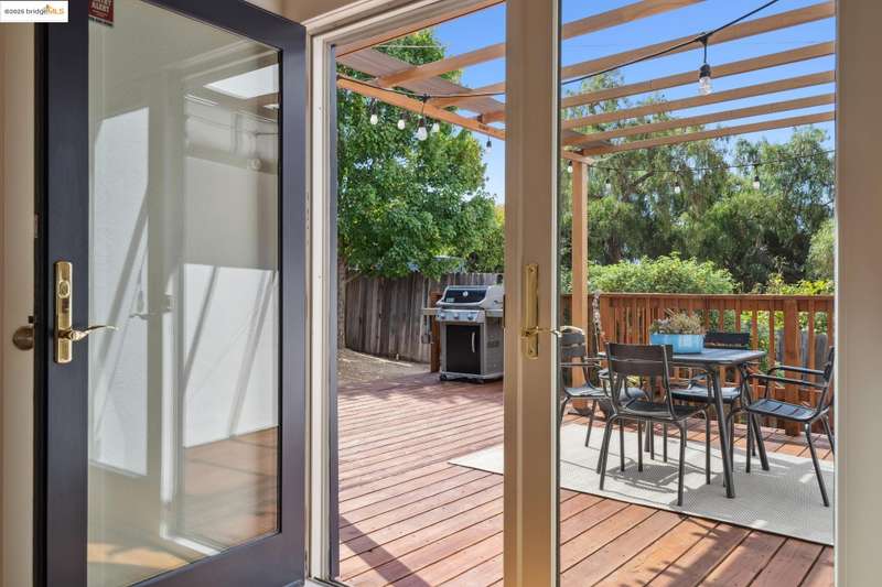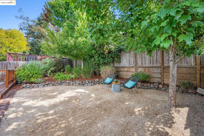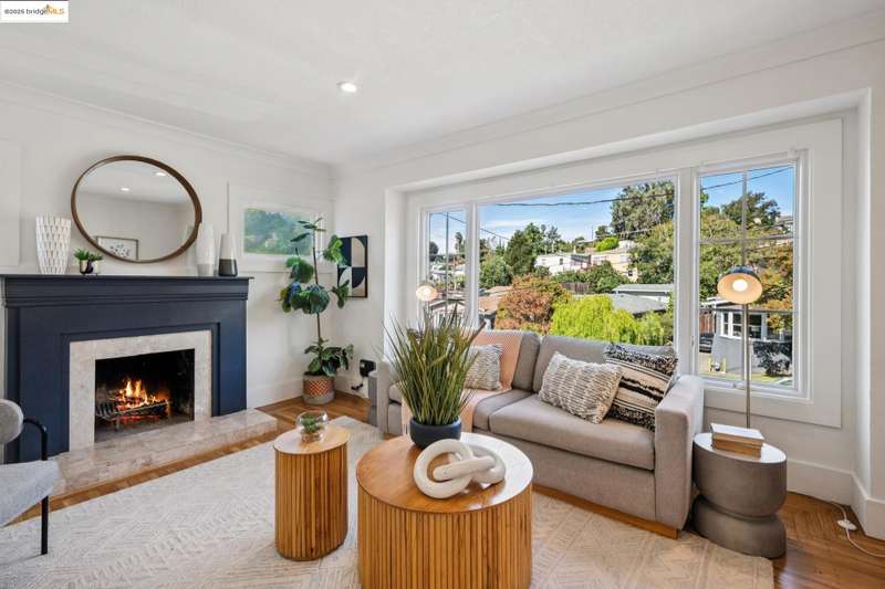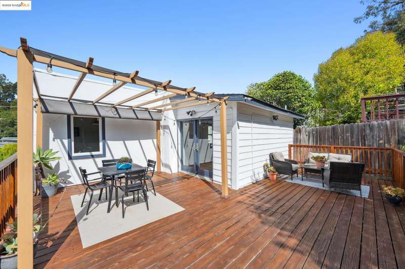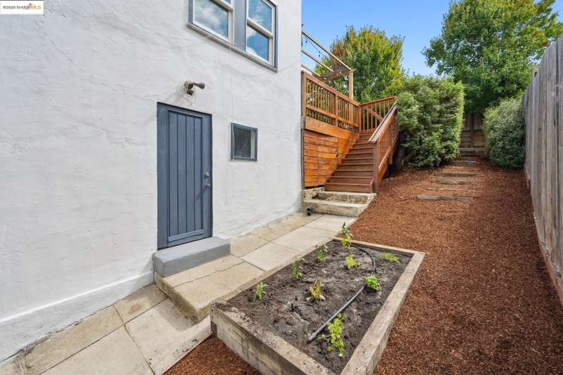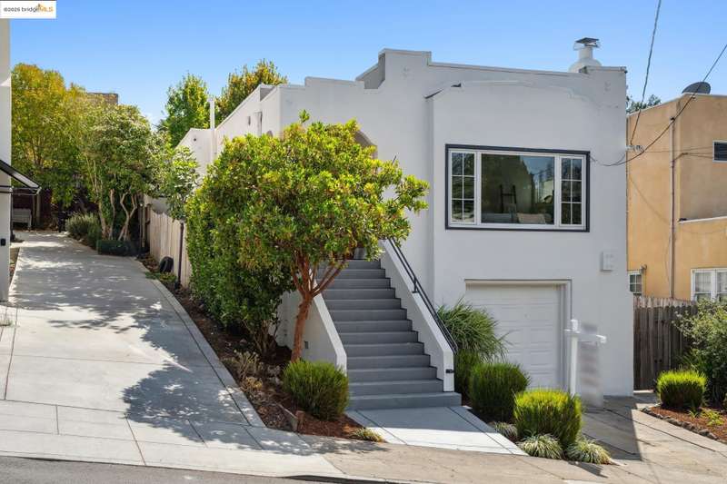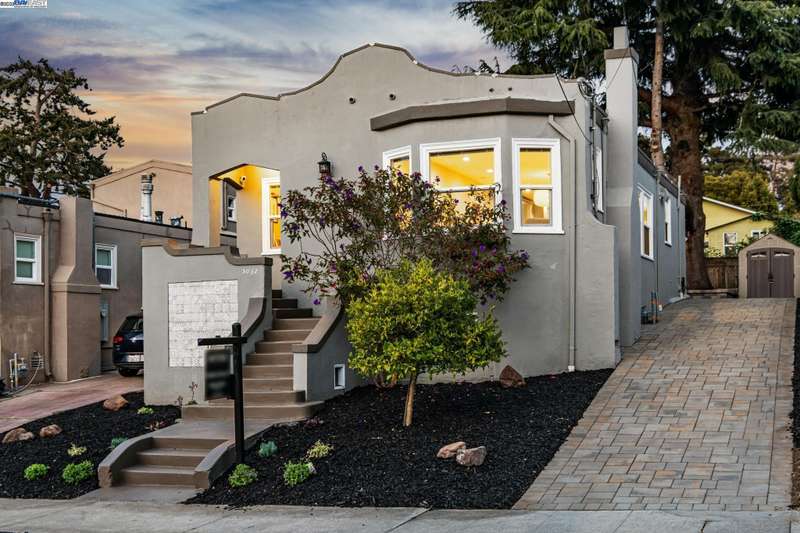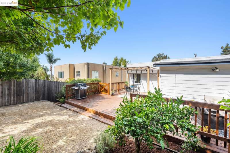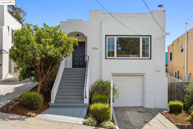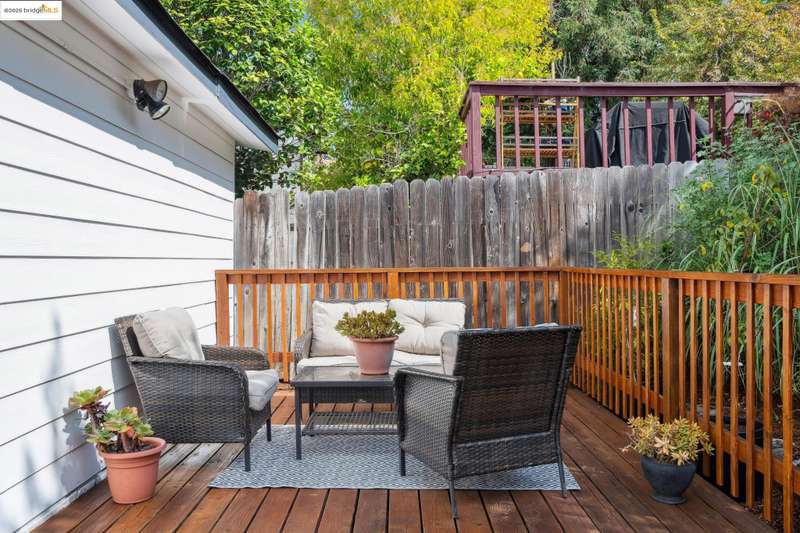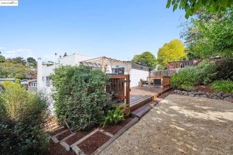 Nestled among the serenity of Oakland’s Maxwell Park neighborhood, you’ll find a charming, updated, split-level c.1925 home at 3136 Kingsland Avenue. Three bedrooms and 1.5 bathrooms grace this home. Add to that a sunny, updated kitchen, opening to a dining and living room, with brick fireplace and a front window overlooking the neighborhood. Hardwood floors glow throughout the home, while dual-pane windows add to the peacefulness within. Both renovated bathrooms feature cheerful tile work. A laundry room is tucked away on the ‘mezzanine’ level off the kitchen, opening to the side year, while another bedroom and the primary bedroom suite are located a few steps up, with French doors to the back deck. The backyard oasis features a redwood deck shaded by a pergola with retractable awning, with loads of space for hosting family gatherings and guests… or peaceful moments of morning coffee and yoga, or evening meals. Step from that into an urban garden, with mature fruit trees and raised bed gardens. So unexpected, and lovely for indoor/outdoor entertaining! A one-car garage with loads of storage completes the picture. Move-in ready and minutes away local shops, restaurants, parks, theaters, art galleries and convenient access to 580, 13, and public transportation. Home sweet home!
