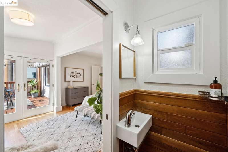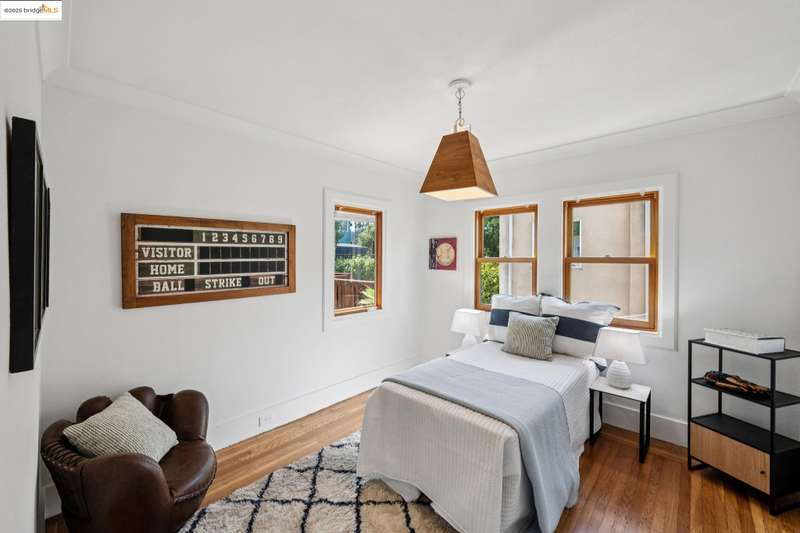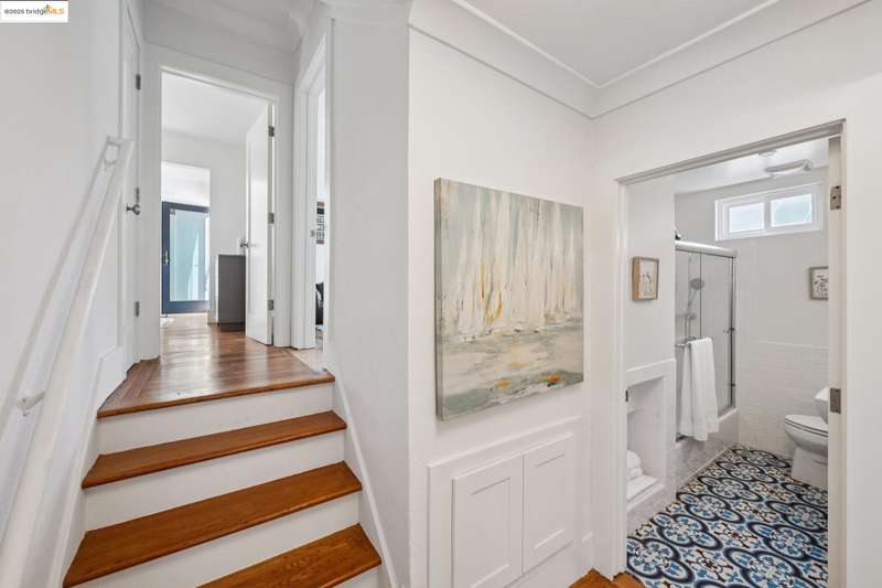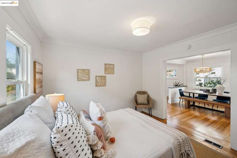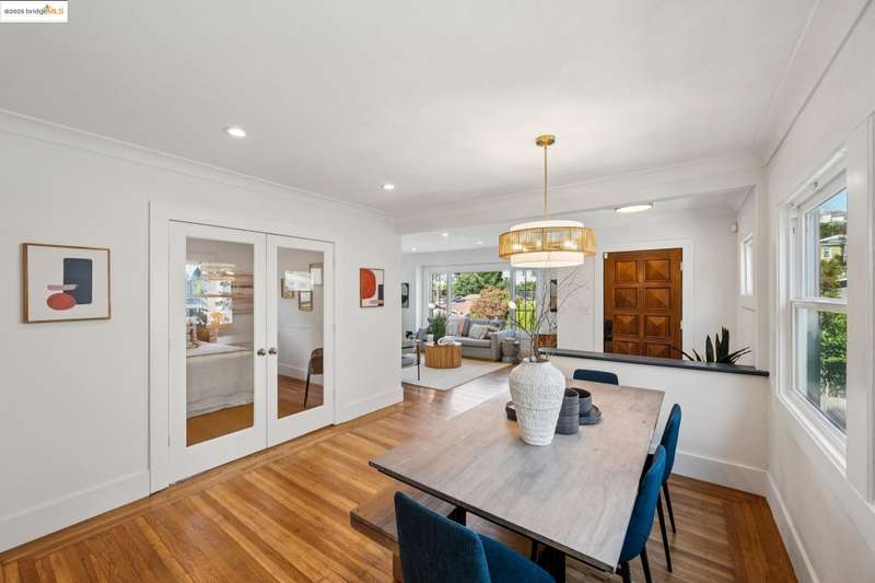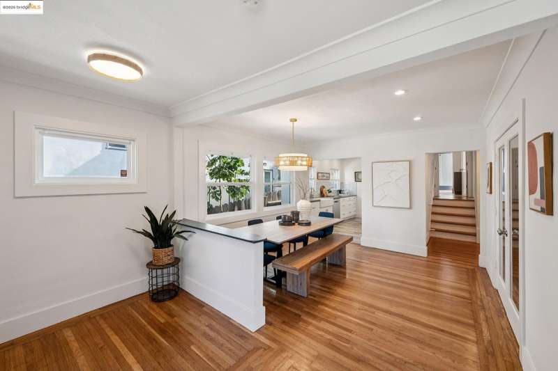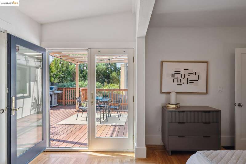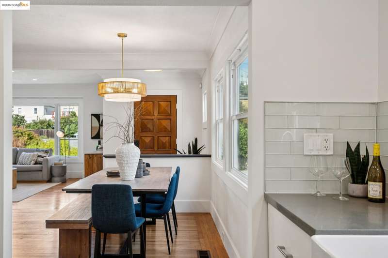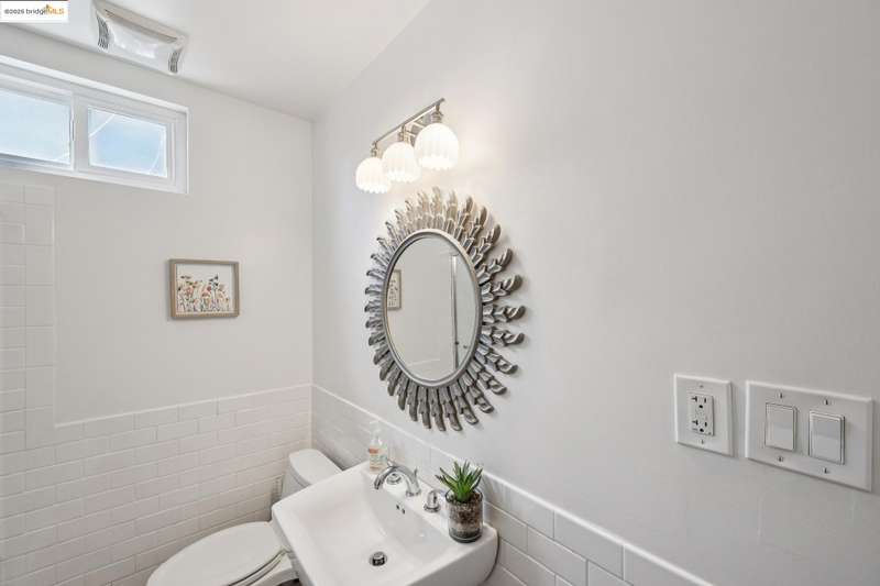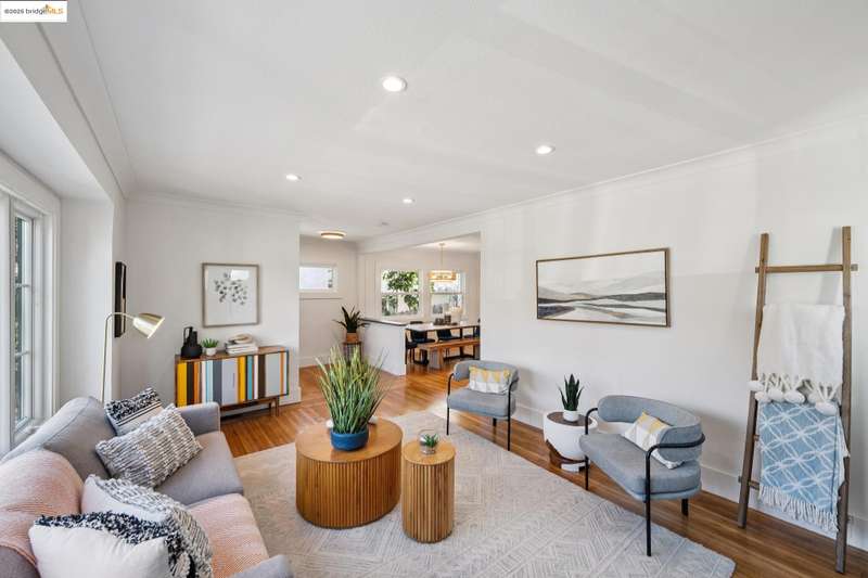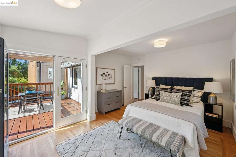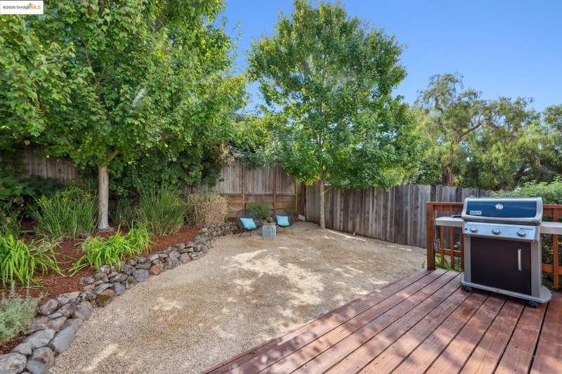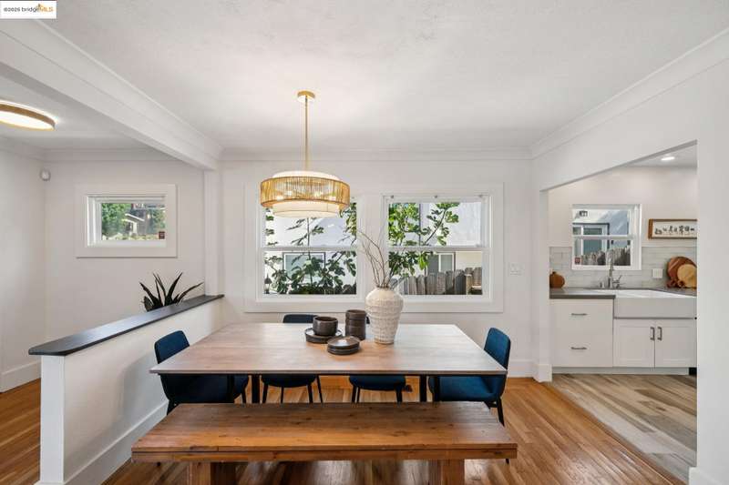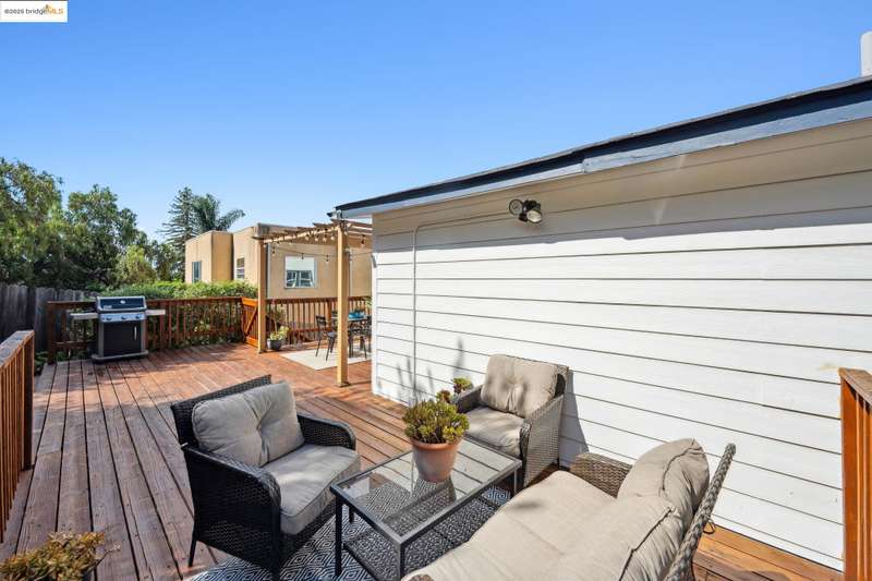 Nestled among the serenity of Oakland’s Maxwell Park neighborhood, you’ll find a charming, updated, split-level c.1925 home at 3136 Kingsland Avenue. Three bedrooms and 1.5 bathrooms grace this home. Add to that a sunny, updated kitchen, opening to a dining and living room, with brick fireplace and a front window overlooking the neighborhood. Hardwood floors glow throughout the home, while dual-pane windows add to the peacefulness within. Both renovated bathrooms feature cheerful tile work. A laundry room is tucked away on the ‘mezzanine’ level off the kitchen, opening to the side year, while another bedroom and the primary bedroom suite are located a few steps up, with French doors to the back deck. The backyard oasis features a redwood deck shaded by a pergola with retractable awning, with loads of space for hosting family gatherings and guests… or peaceful moments of morning coffee and yoga, or evening meals. Step from that into an urban garden, with mature fruit trees and raised bed gardens. So unexpected, and lovely for indoor/outdoor entertaining! A one-car garage with loads of storage completes the picture. Move-in ready and minutes away local shops, restaurants, parks, theaters, art galleries and convenient access to 580, 13, and public transportation. Home sweet home!