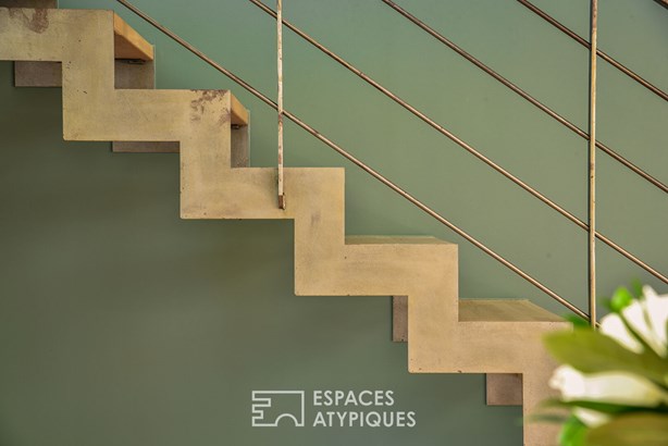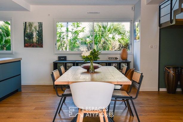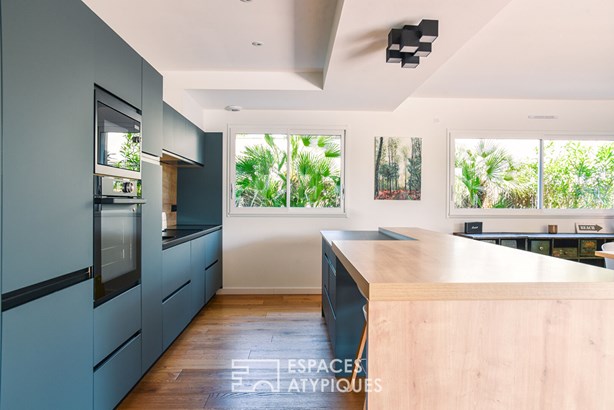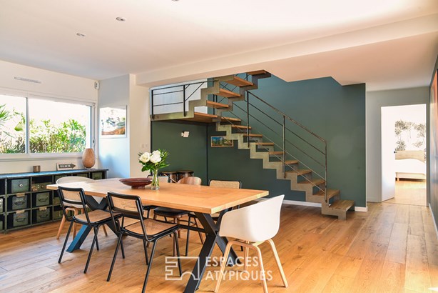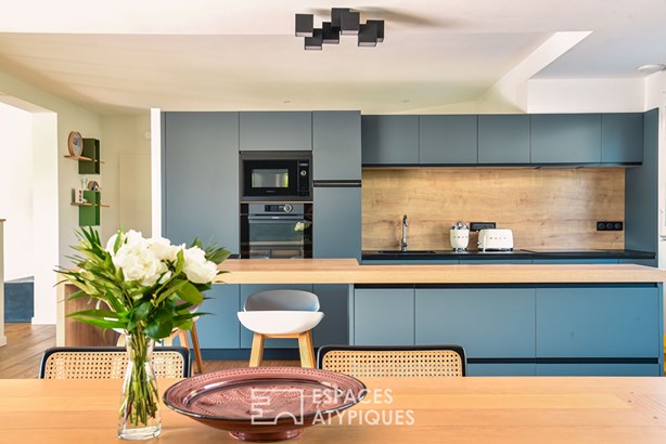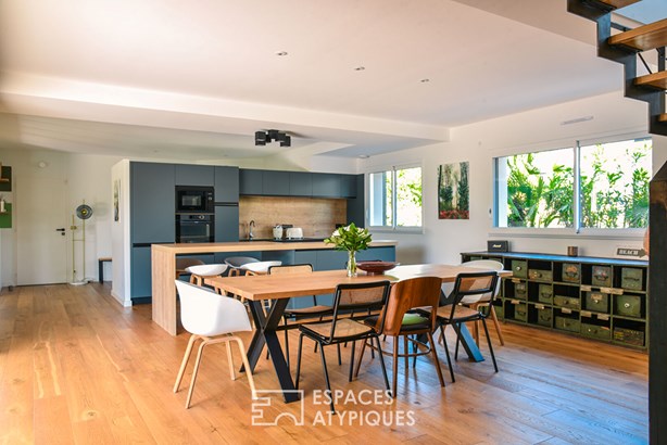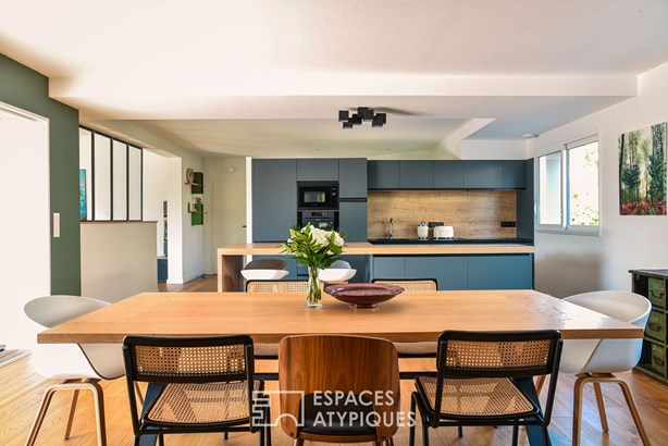 La cuisine de fabrication francaise dispose d'amenagements haut de gamme : plan de travail en granit et surfaces en Fenix. Son ilot central convivial s'ouvre sur une elegante salle a manger et un escalier en bois et metal, chef-d'oeuvre unique d'un artisan local.