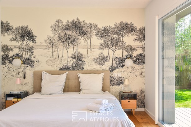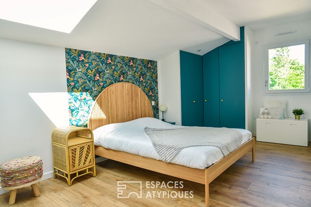 Cote nuit, une suite parentale de plus de 30 m2 s'installe en rez-de-chaussee. Son dressing ,imagine par un menuisier, s'habille de portes en persienne blanches et offre de beaux lineaires de rangements. Depuis le lit, la vue se prolonge sur les magnifiques chenes centenaires.