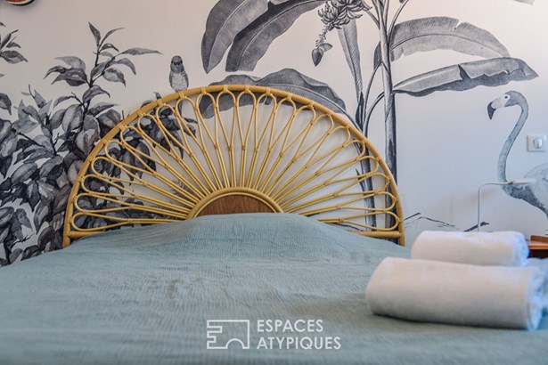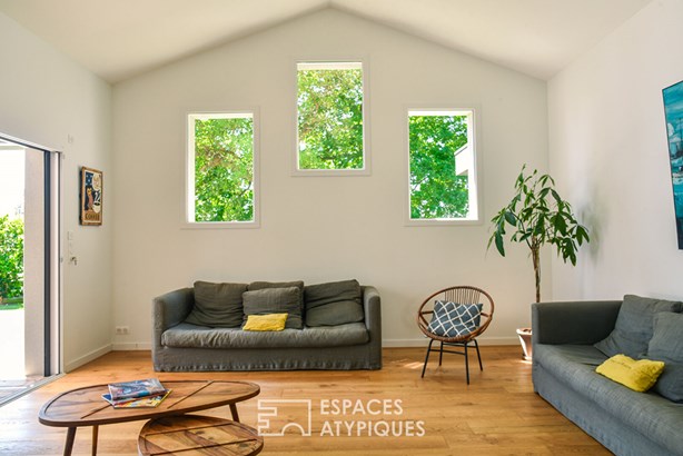 Le sejour s'articule autour d'une vaste baie coulissante de trois metres, integree dans le mur, offrant une transition fluide entre interieur et exterieur. Cette ouverture magnifie la circulation de la lumiere naturelle, sublimant l'espace de vie.